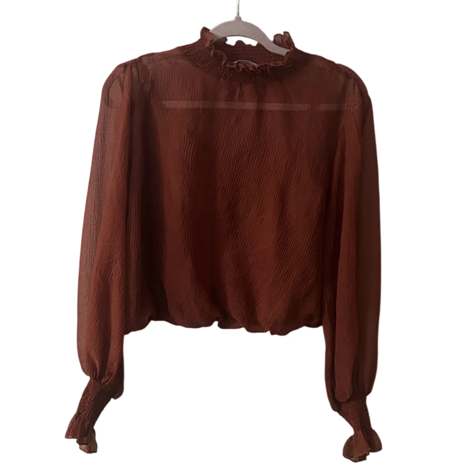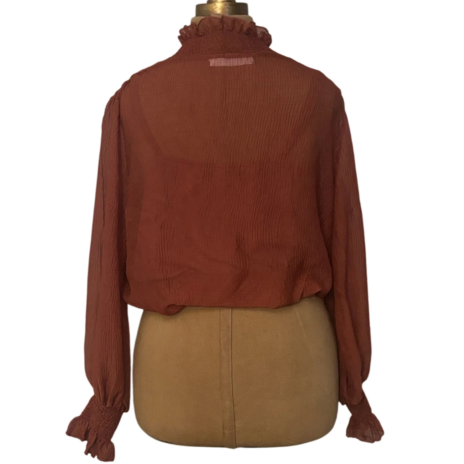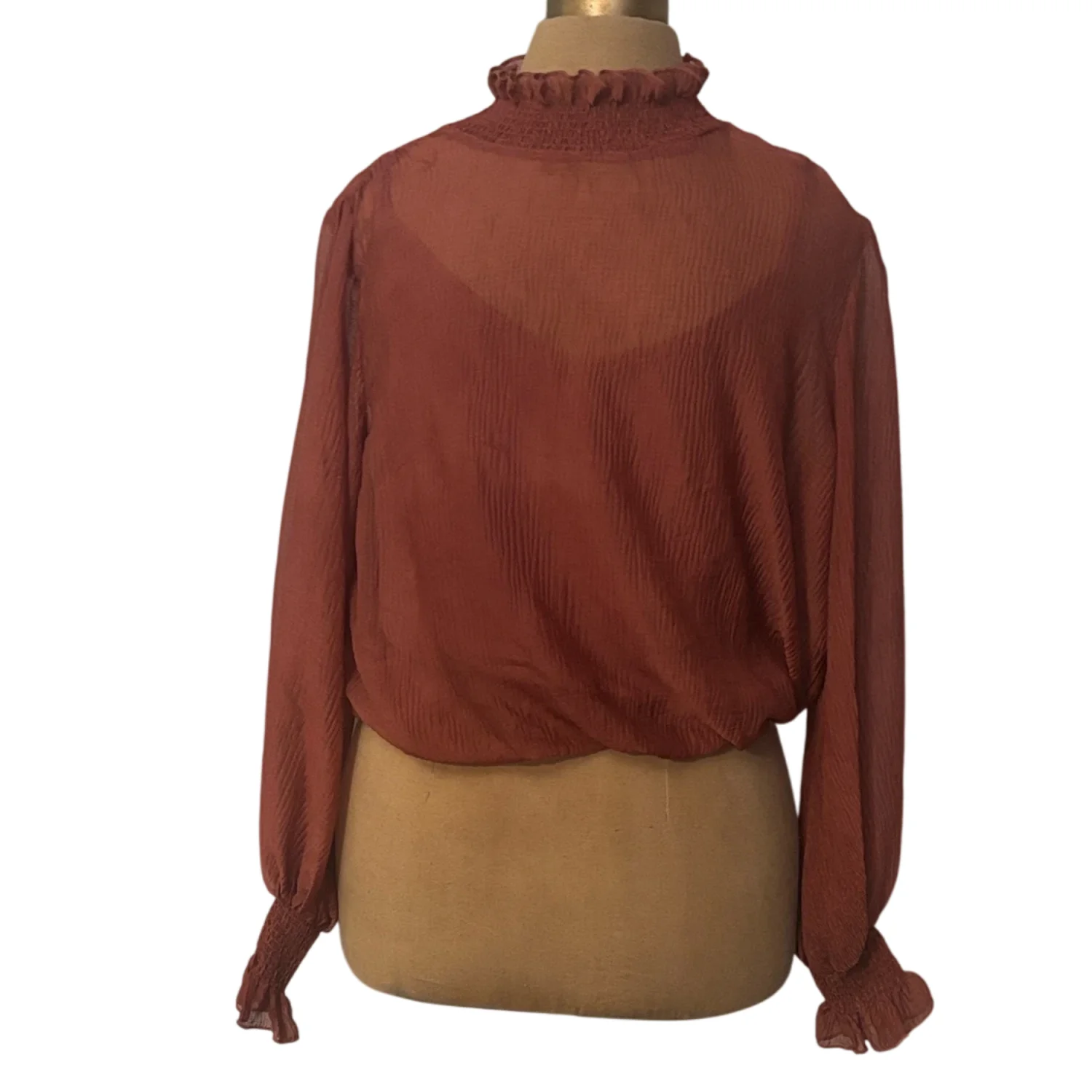 Style: Marsala AT 16423 This elegant sheer blouse features delicate ruffles at the neck and sleeves. There is a matching attached tank inside the blouse for coverage. The rich fall color adds a touch of warmth to your wardrobe. Color: Rust Size: S Armpit: 20" Length: 19" Sleeve: 29" Condition: Good 100% Polyester Dry Clean Only