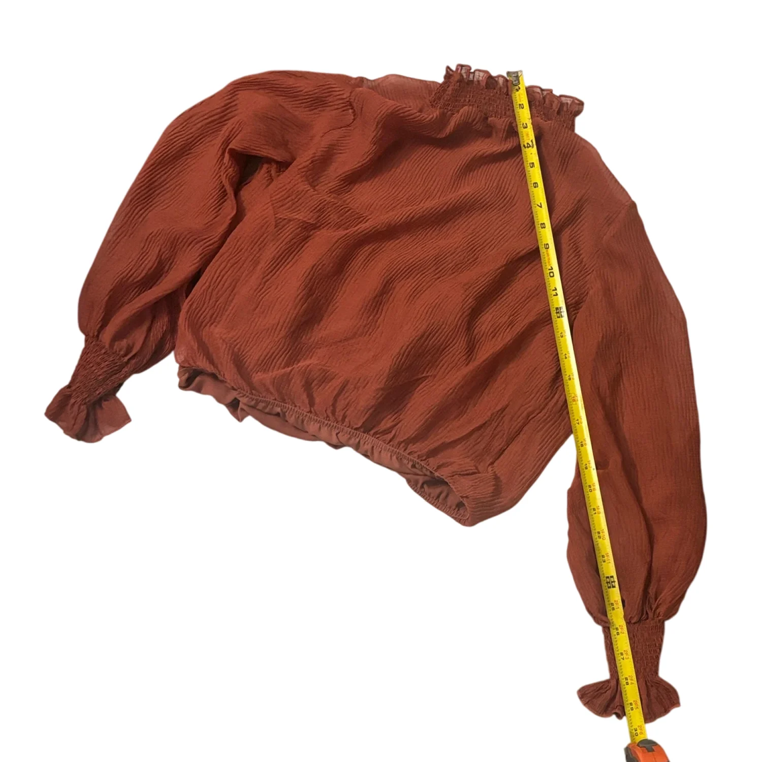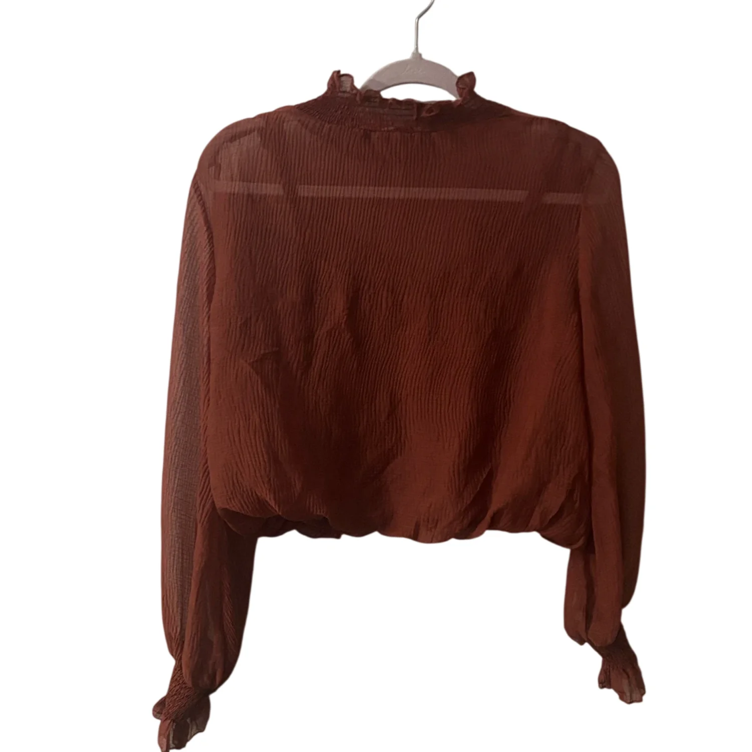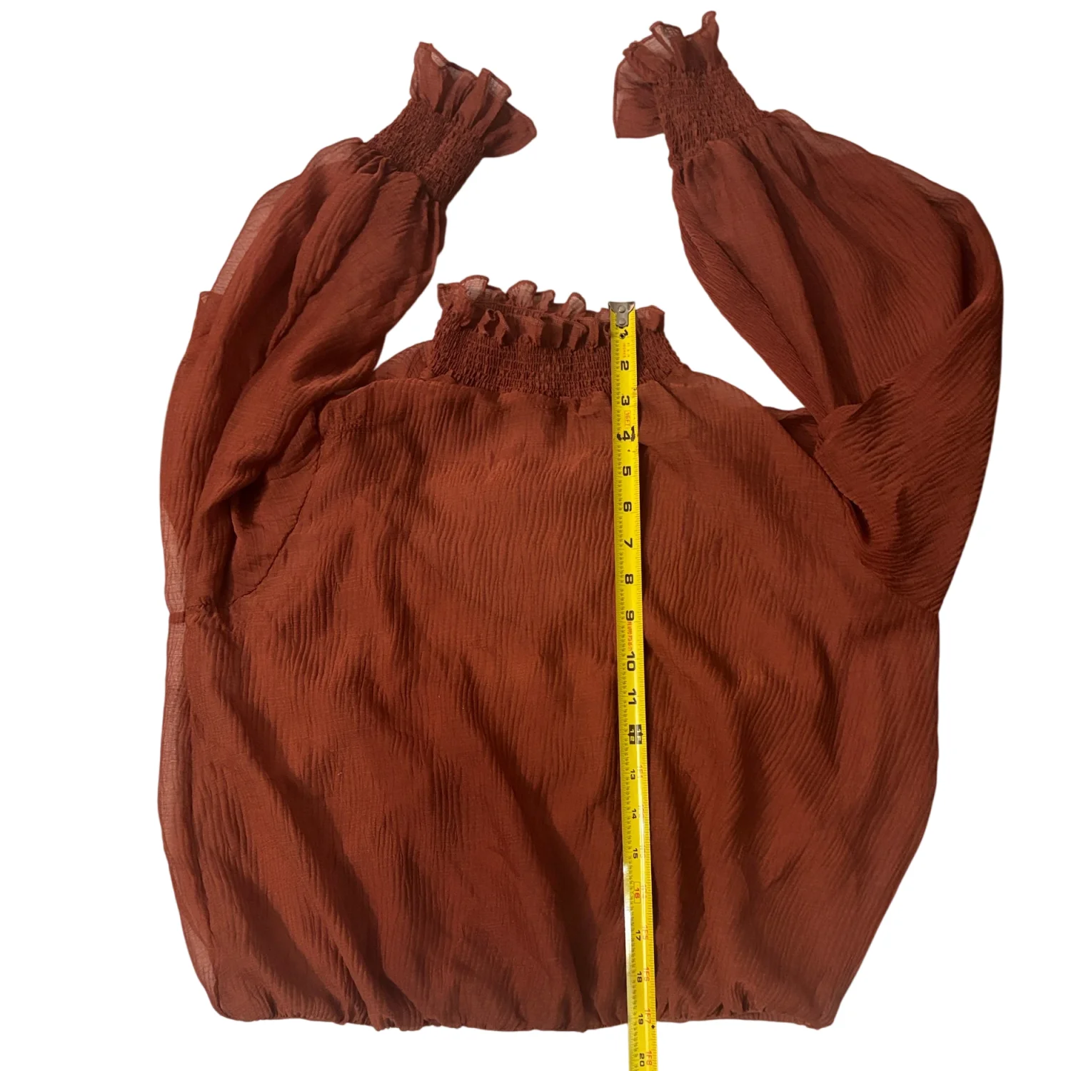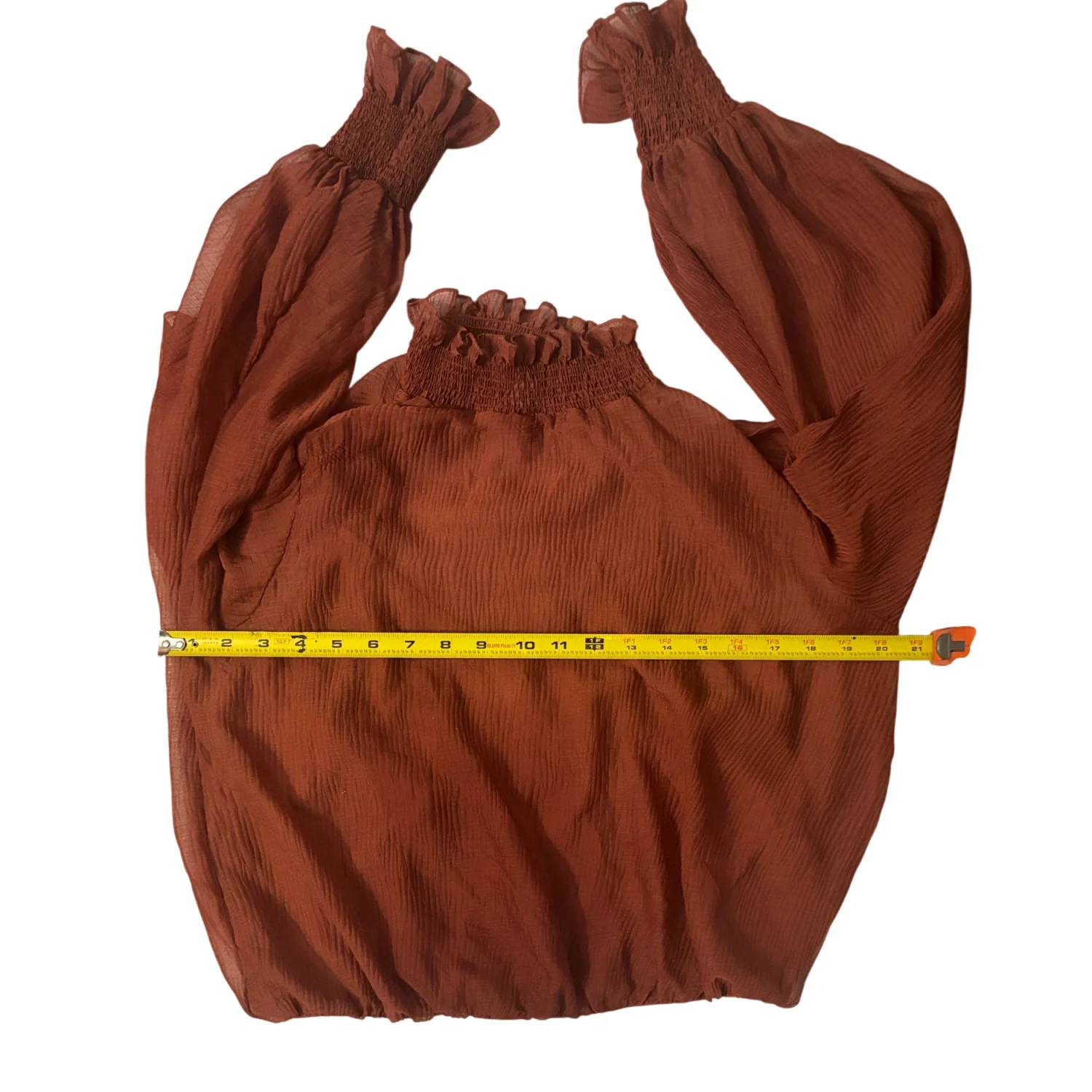 Style: Marsala AT 16423 This elegant sheer blouse features delicate ruffles at the neck and sleeves. There is a matching attached tank inside the blouse for coverage. The rich fall color adds a touch of warmth to your wardrobe. Color: Rust Size: S Armpit: 20" Length: 19" Sleeve: 29" Condition: Good 100% Polyester Dry Clean Only