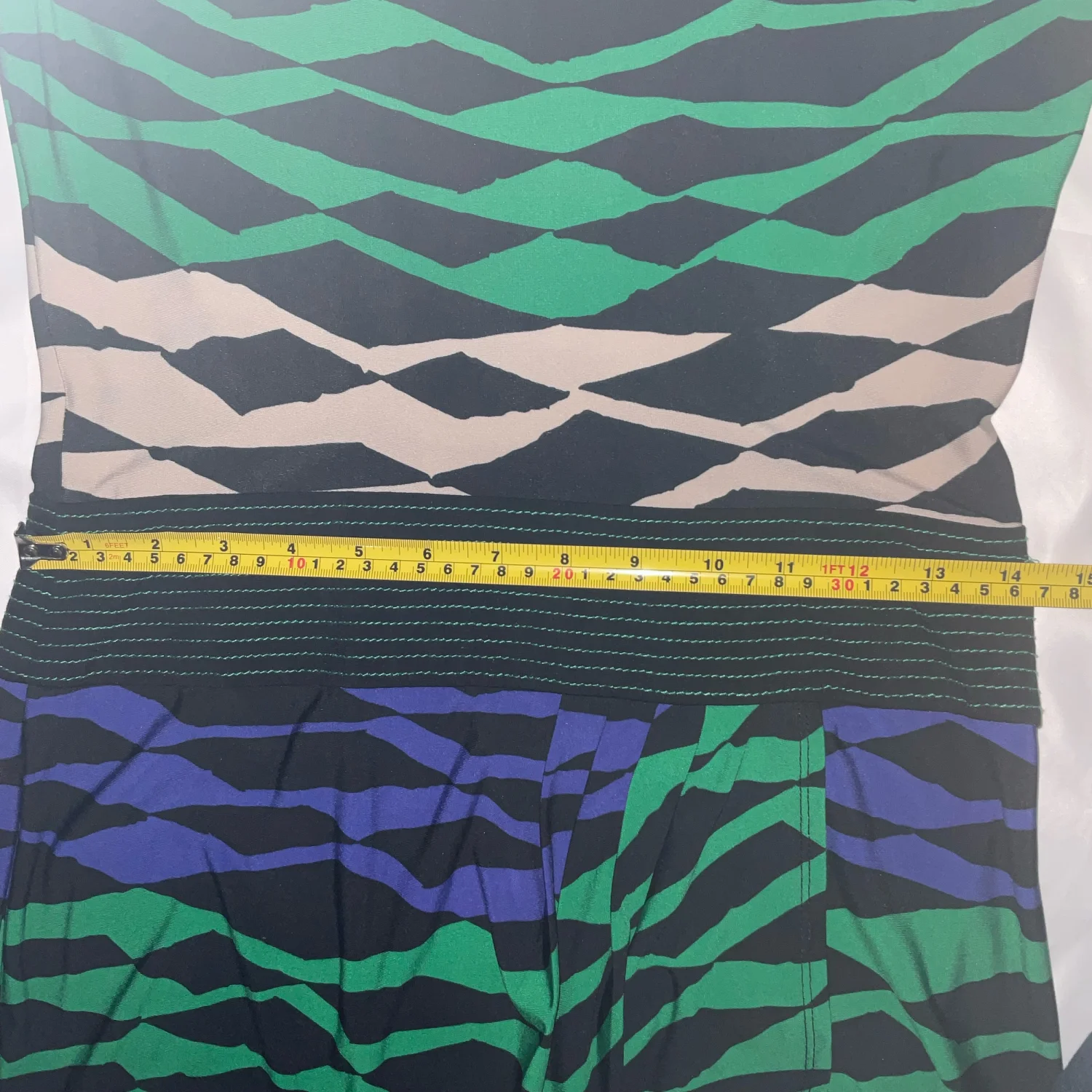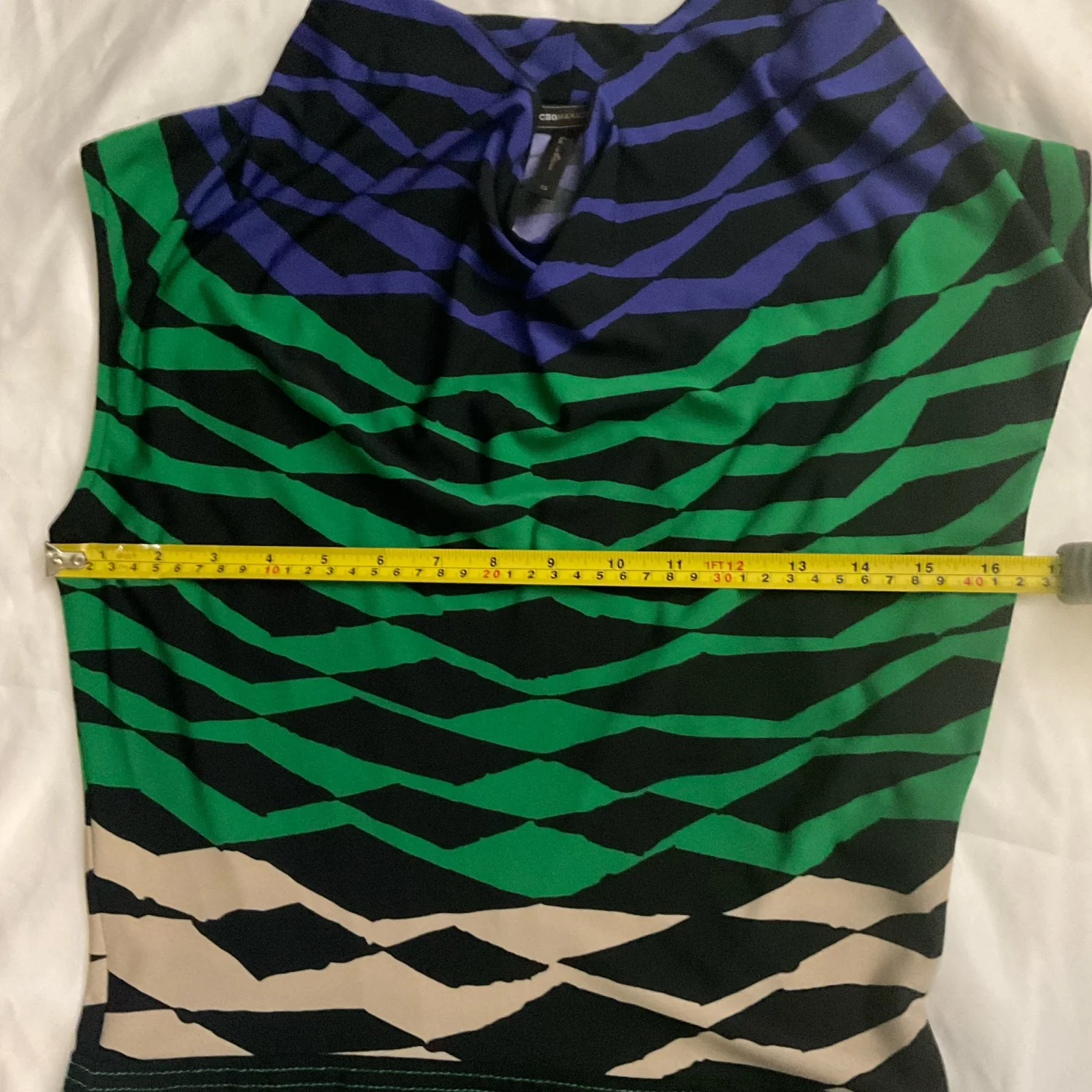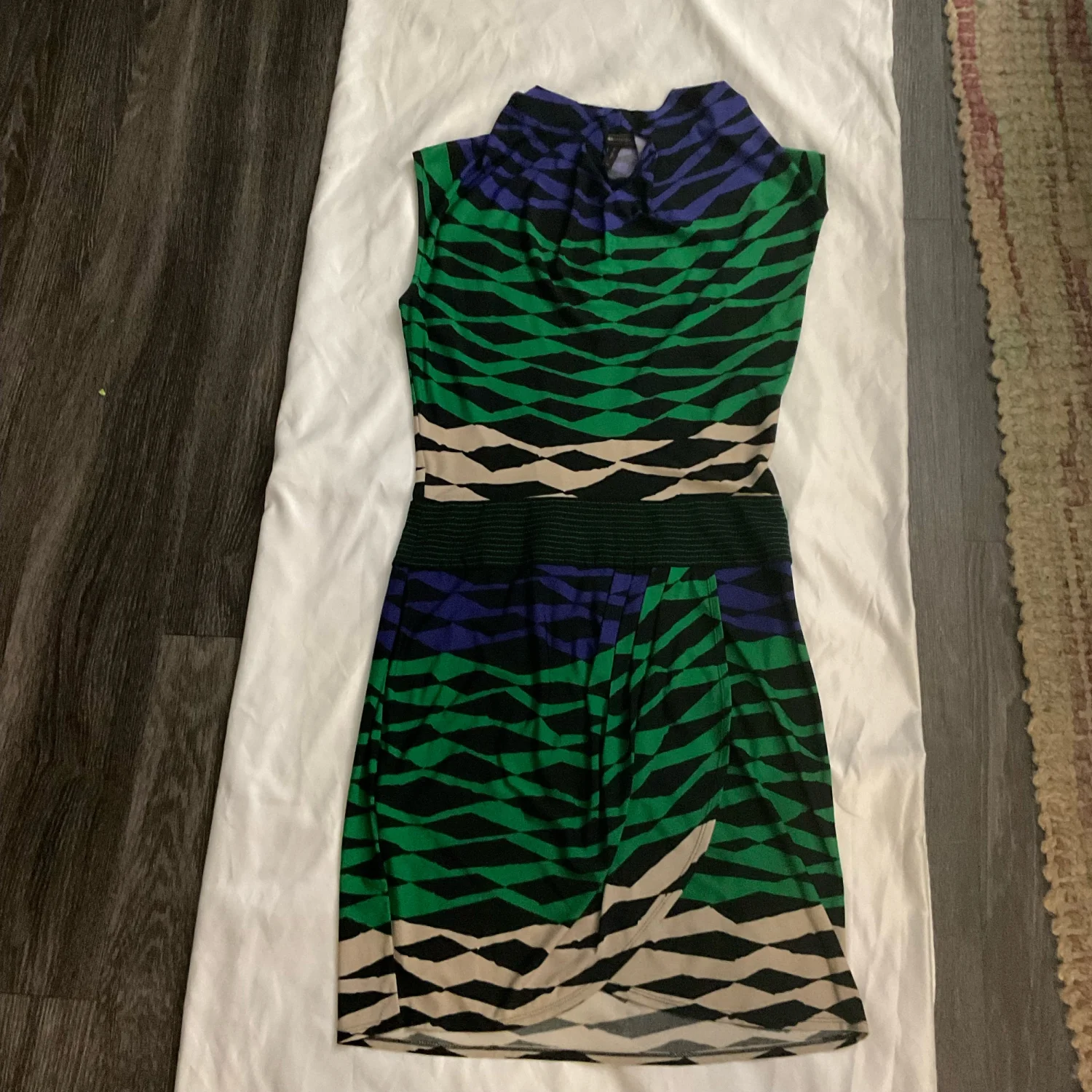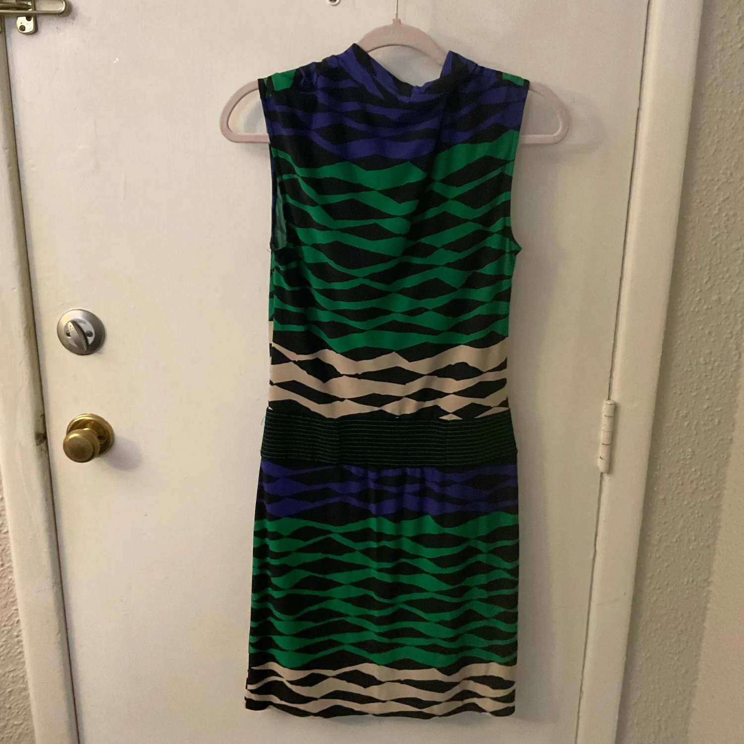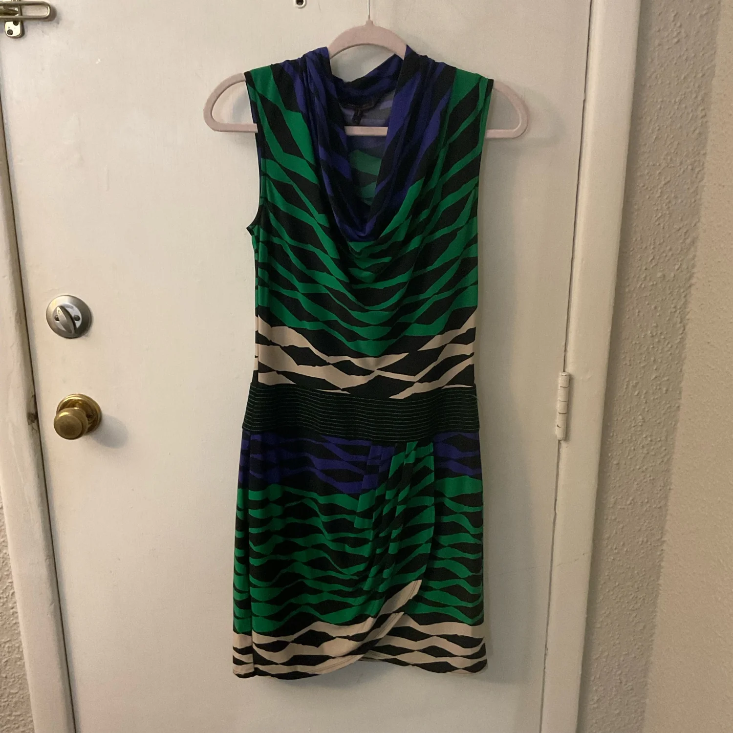 Style: Sleeveless cowl neck sheath dress Color: Black/Green/Purple/Tan Size: XS Armpit: 16” Length: 38” Condition: Good 95% Polyester 5% Elastane Machine wash cold