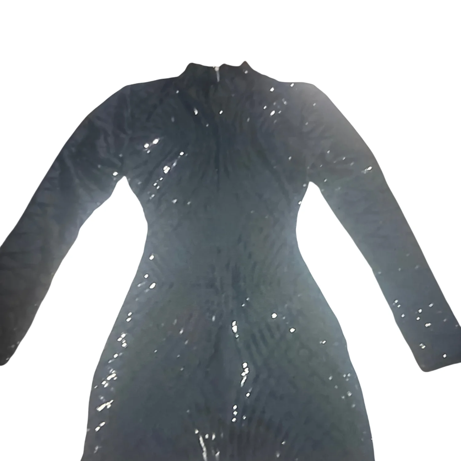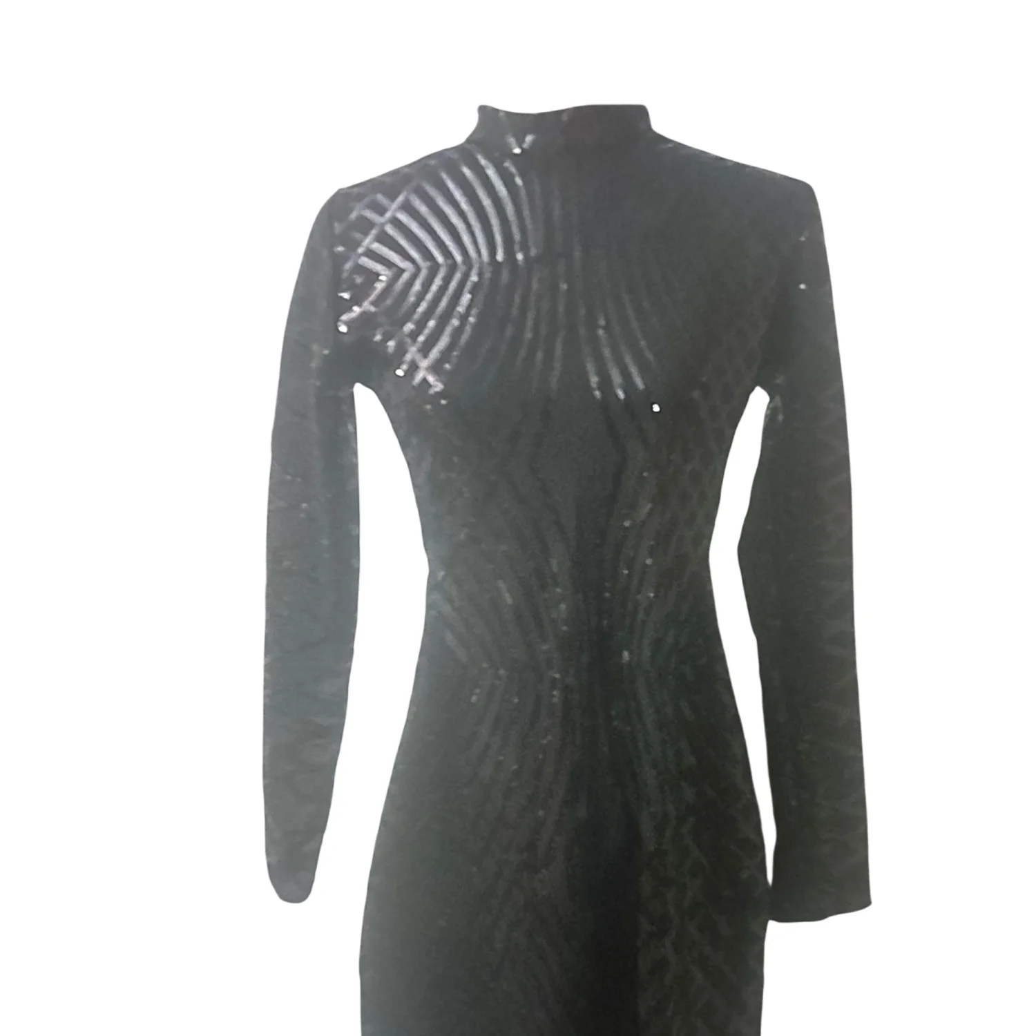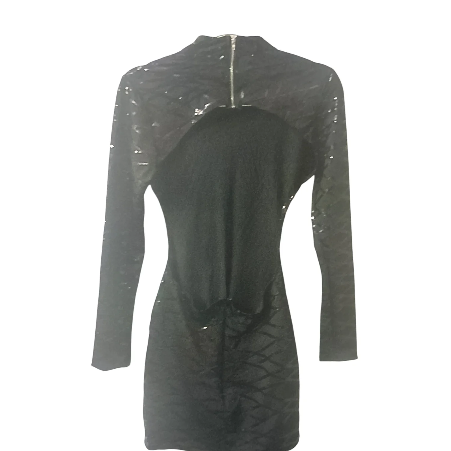 Style: Backless, sequined bodycon long sleeve dress Color: Black Size: S Armpit: 16” Waist: 10” Length: 31” Condition: Good 95% Polyester 5% Spandex Dry Clean