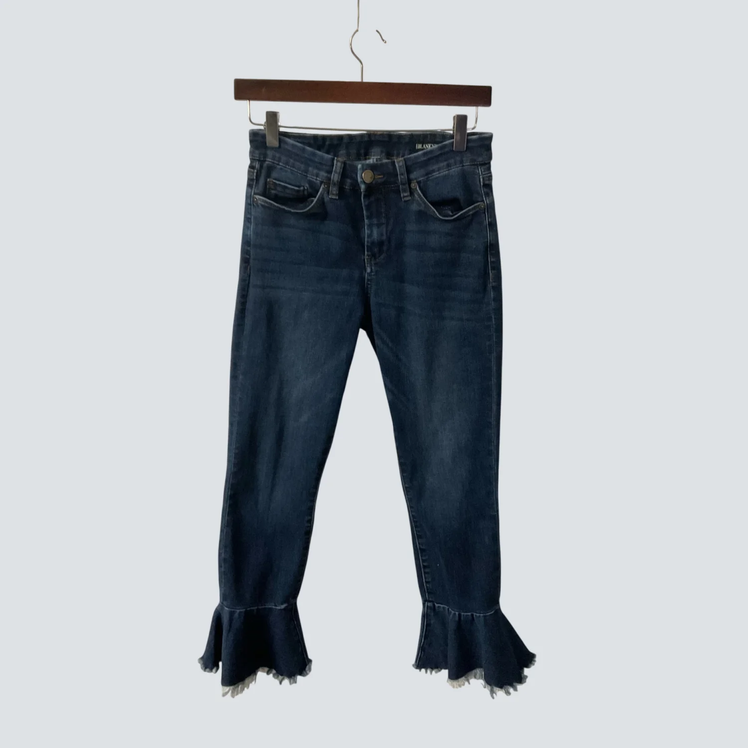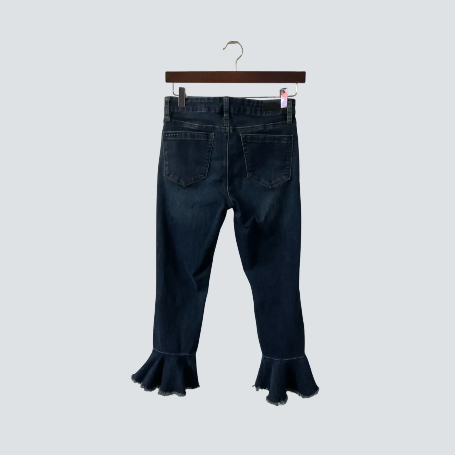 Style: Fancy That High Rise Ankle Ruffle Crop, 5 pocket Color: Blue, Dark wash #12L-1697 Size: 27 Waist: 13" Rise: 10" Inseam: 26" Condition: Good 70% Cotton 25% Polyester 3% Rayon 2% Spandex Machine wash