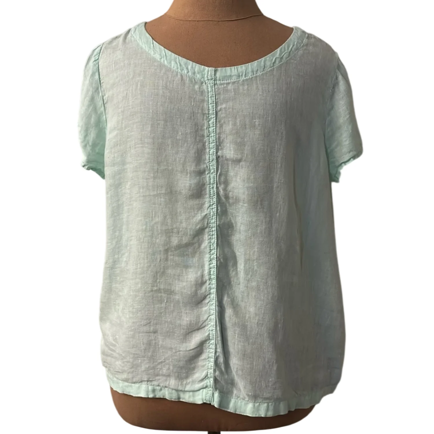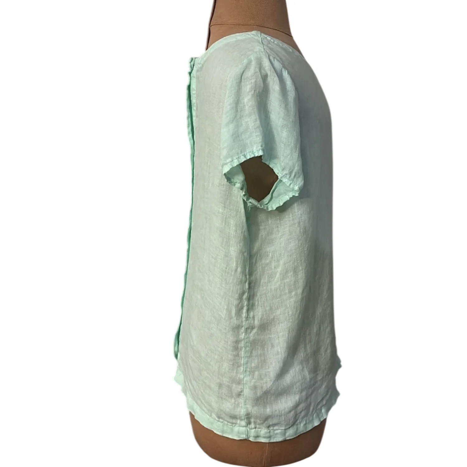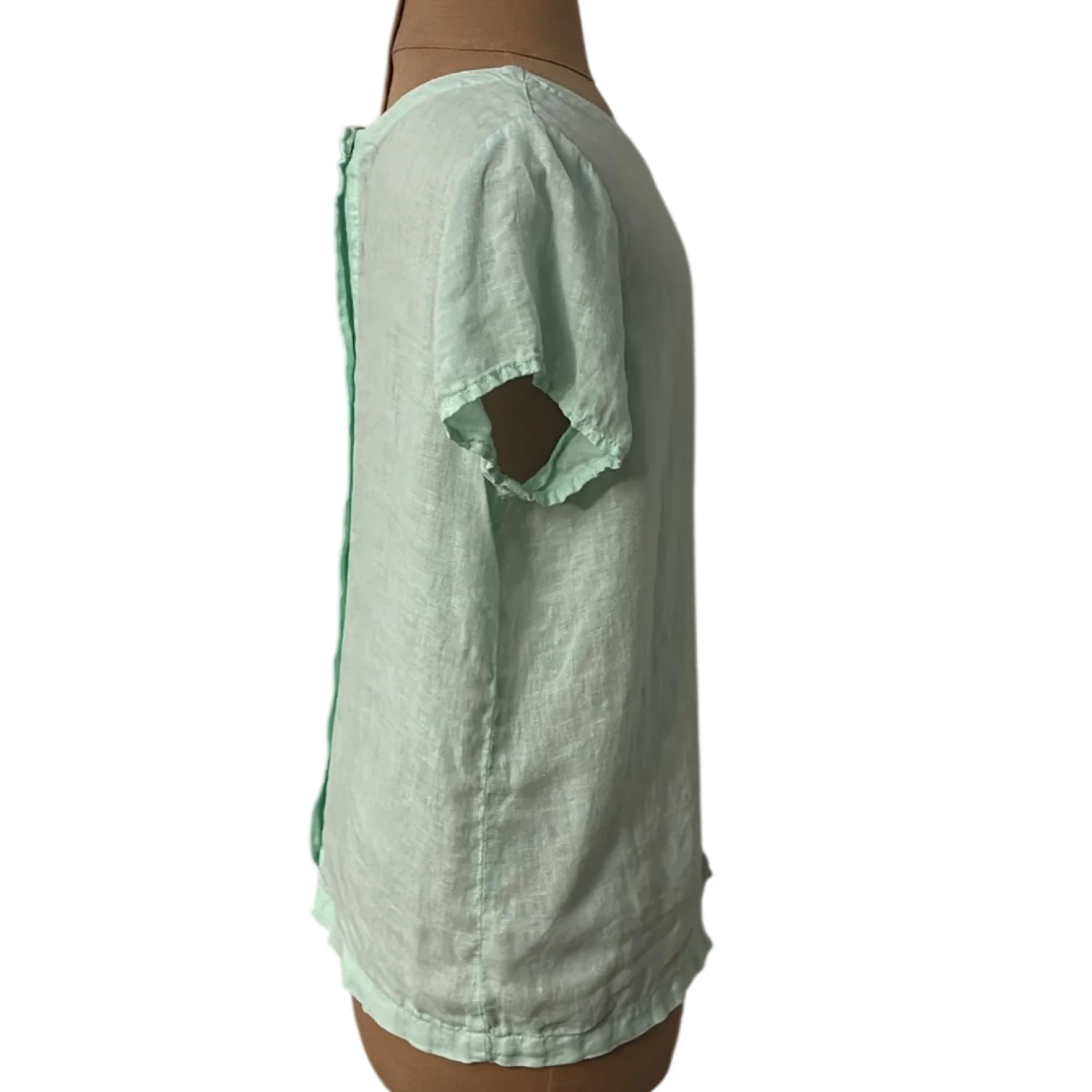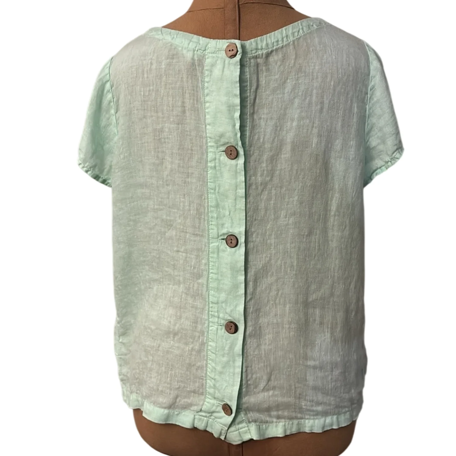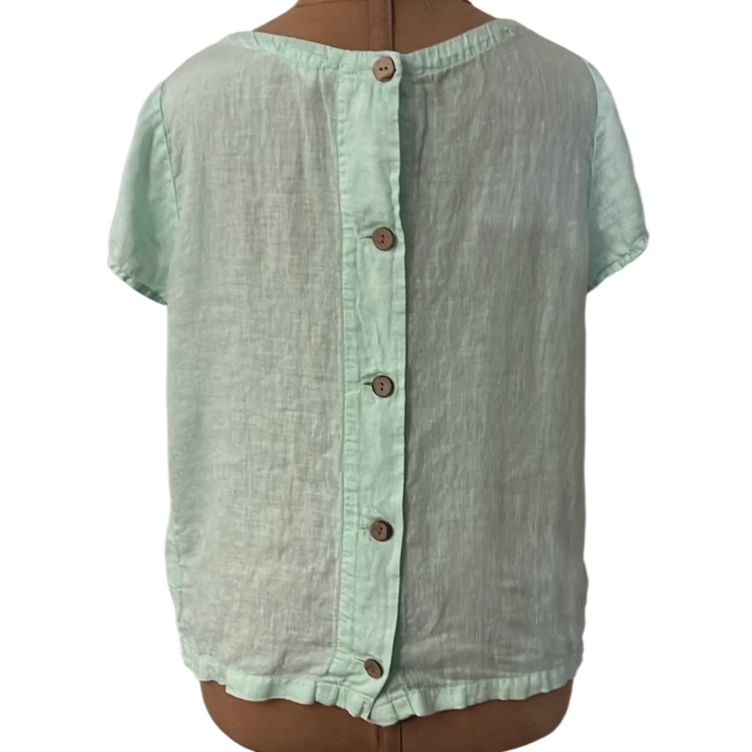 Style: Short sleeve with back button down closure Color: Mint Green Size: S Armpit: 19” Length: 22” Condition: Good 100% Linen Machine wash cold delicate cycle