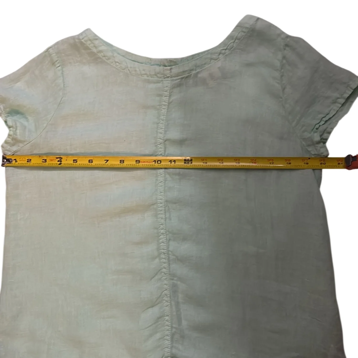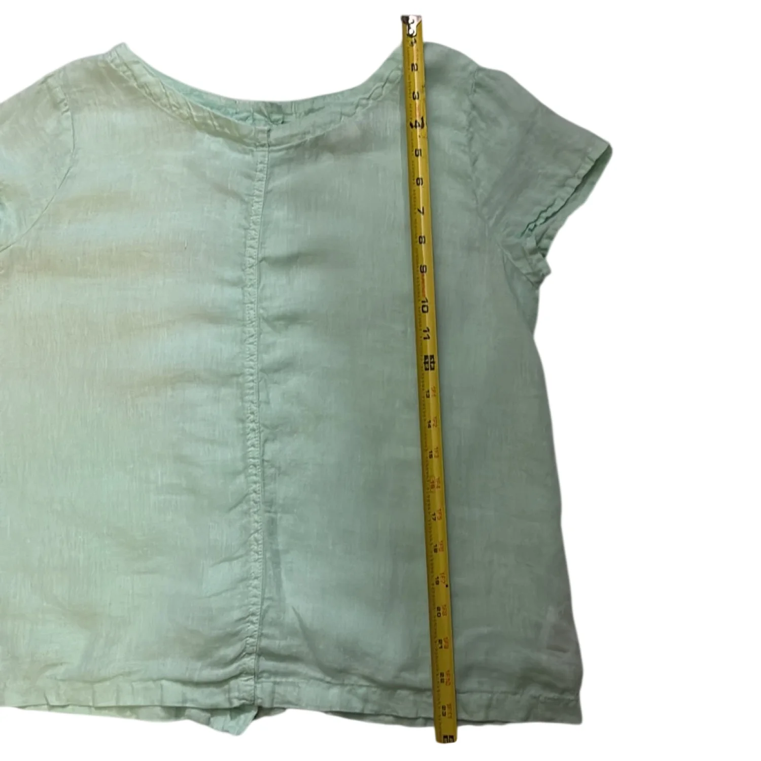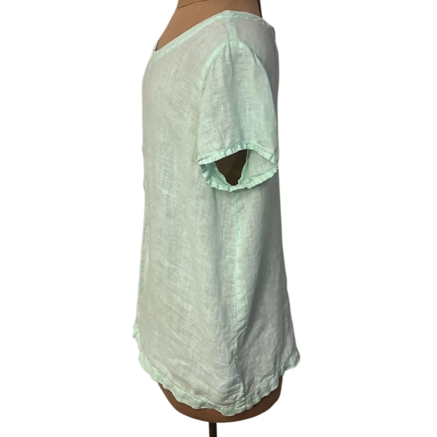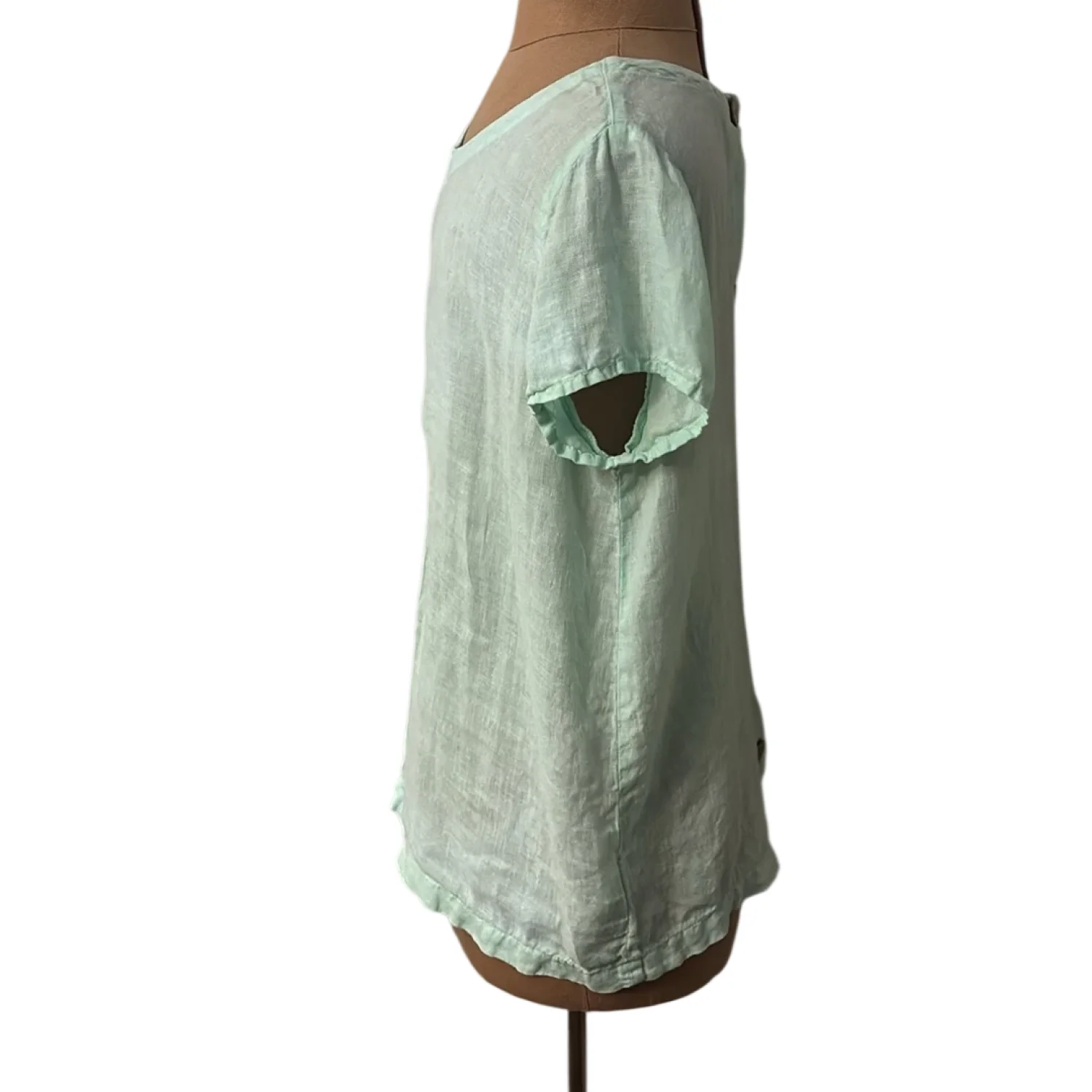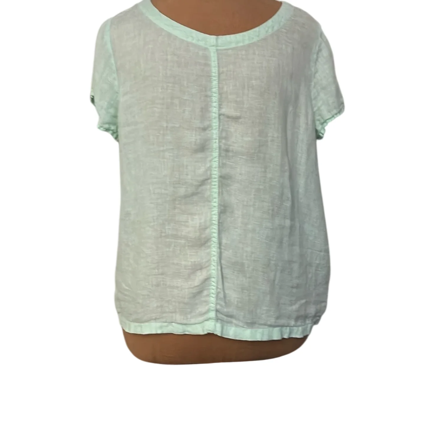 Style: Short sleeve with back button down closure Color: Mint Green Size: S Armpit: 19” Length: 22” Condition: Good 100% Linen Machine wash cold delicate cycle