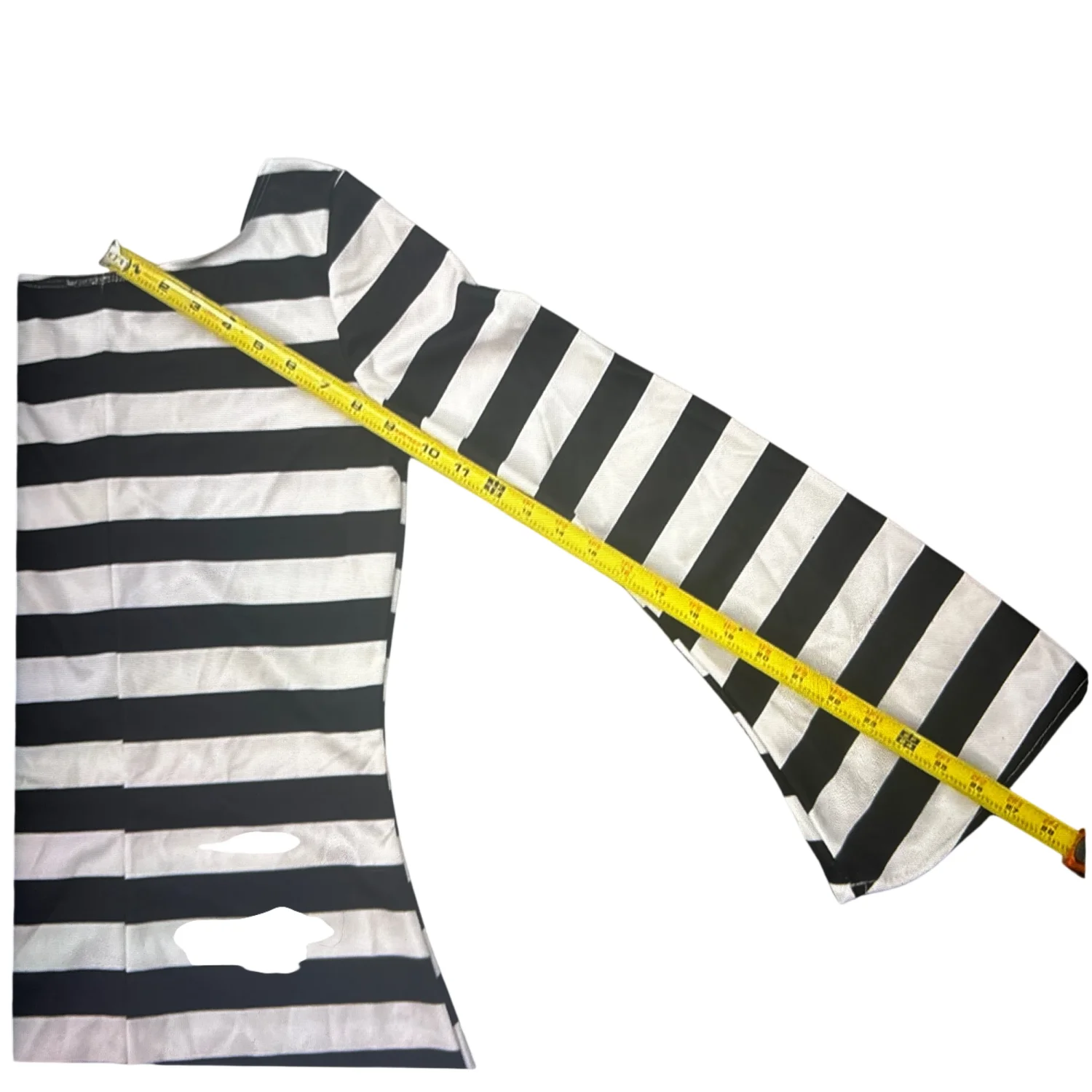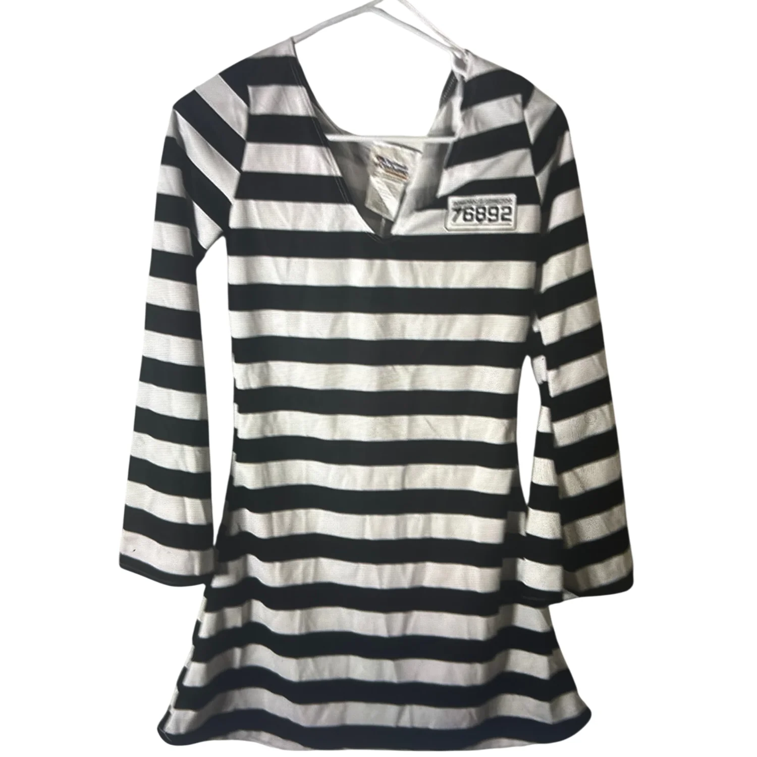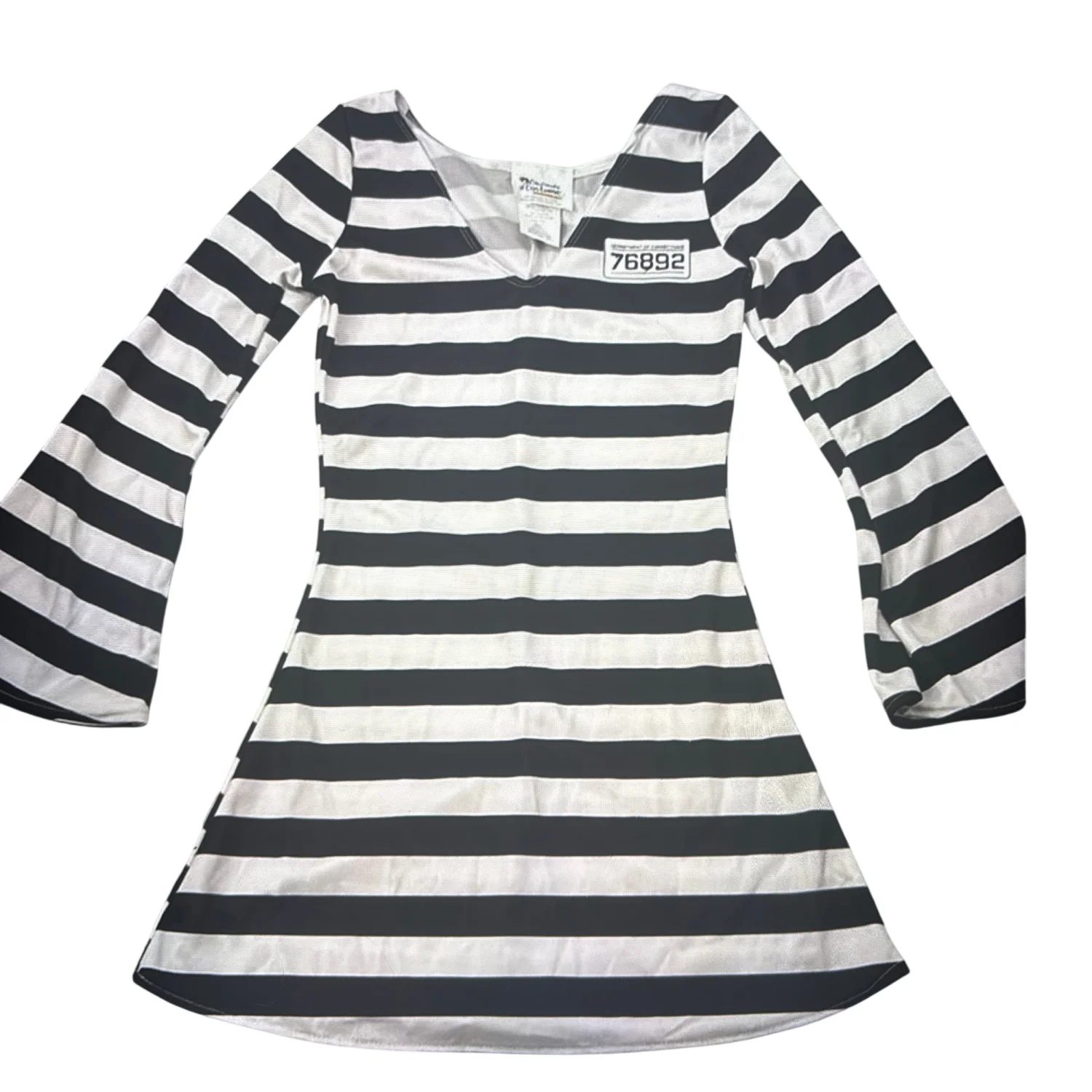 Style: Pull on Lightweight V-Neck Mini Dress Costune with bell sleeves. Great for parties and cosplays Color: Black /White Size: S Armpit: 16” Waist: 12” Length: 32” Sleeve: 26” 100% Polyester Spot clean only