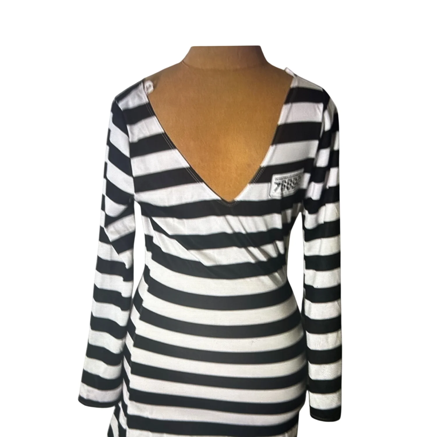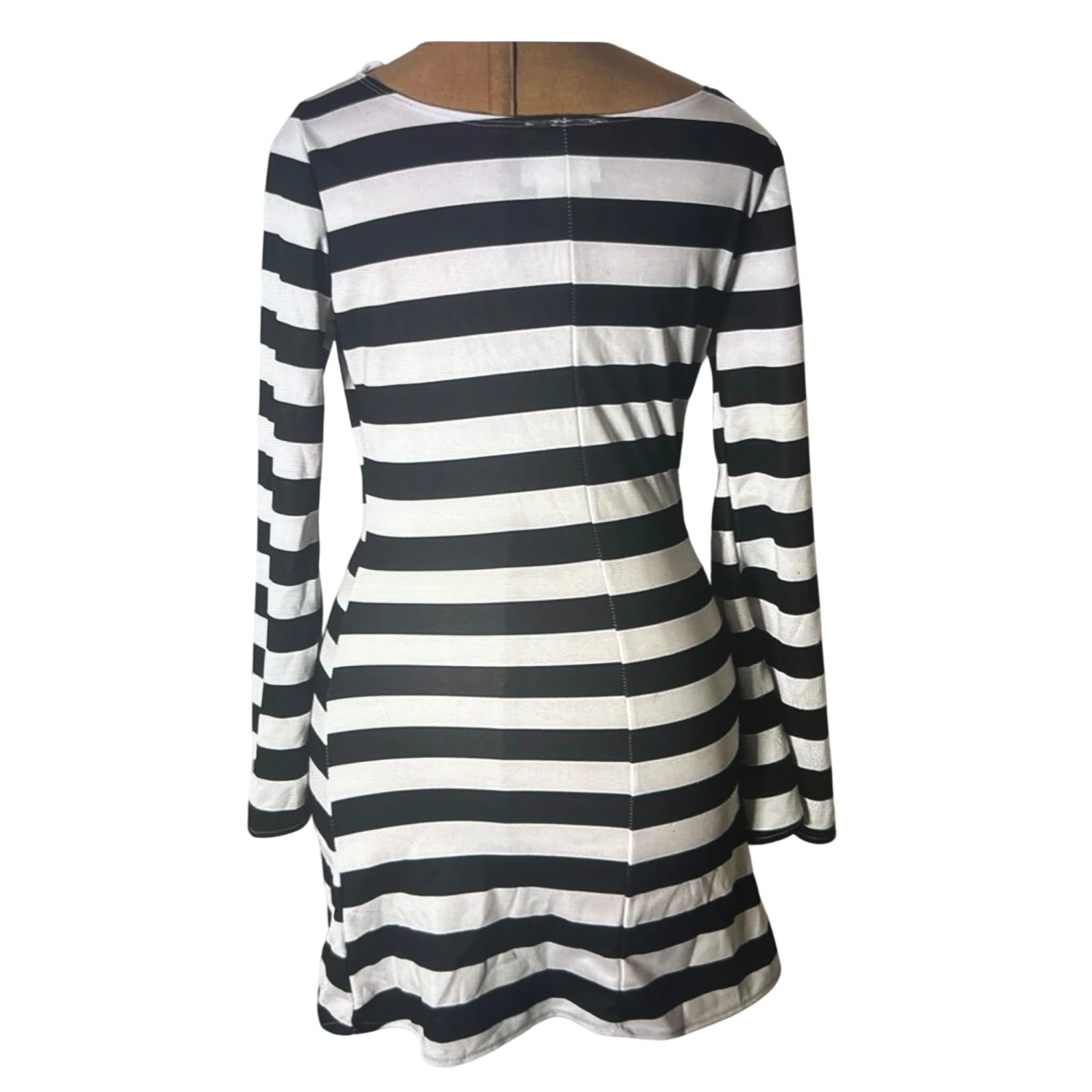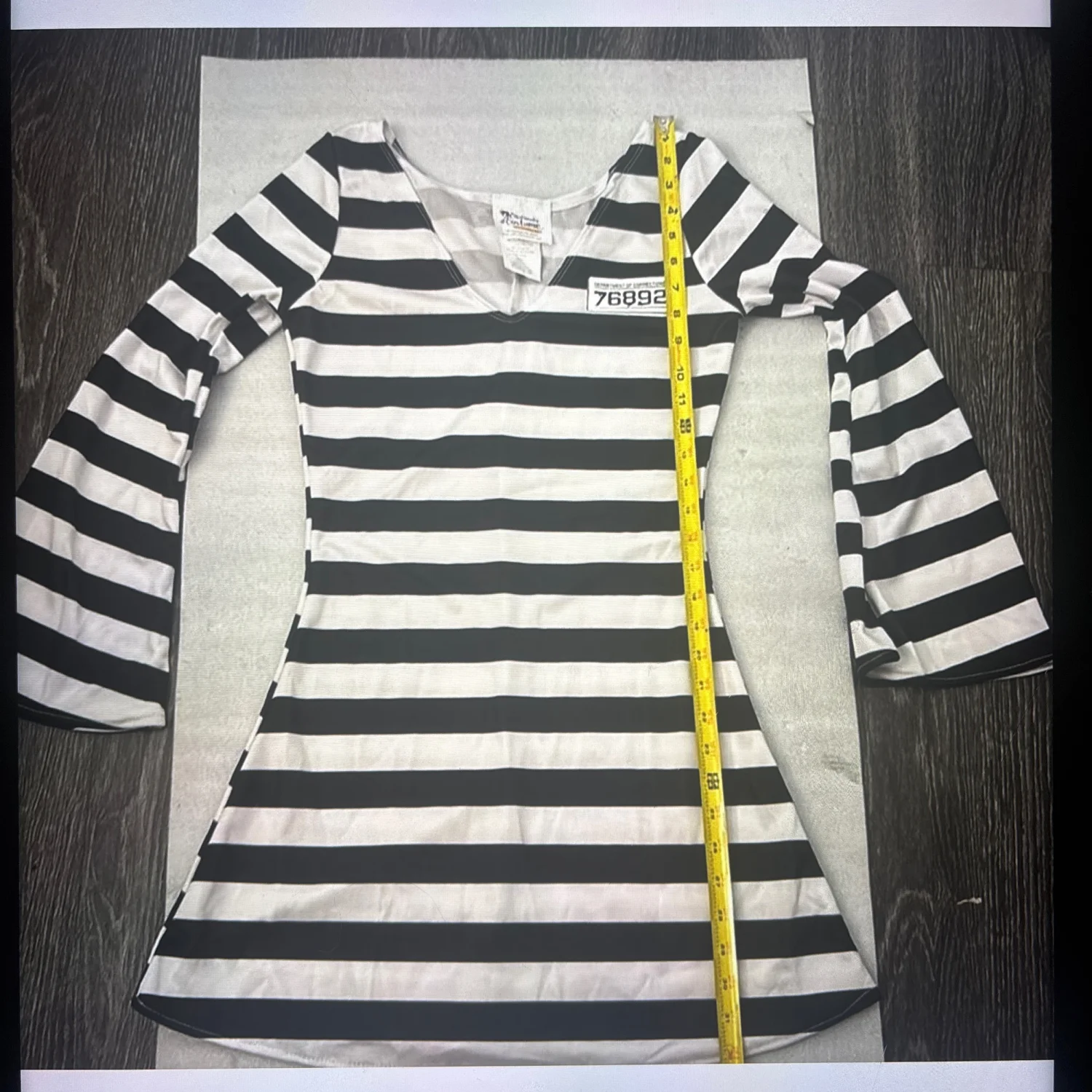 Style: Pull on Lightweight V-Neck Mini Dress Costune with bell sleeves. Great for parties and cosplays Color: Black /White Size: S Armpit: 16” Waist: 12” Length: 32” Sleeve: 26” 100% Polyester Spot clean only