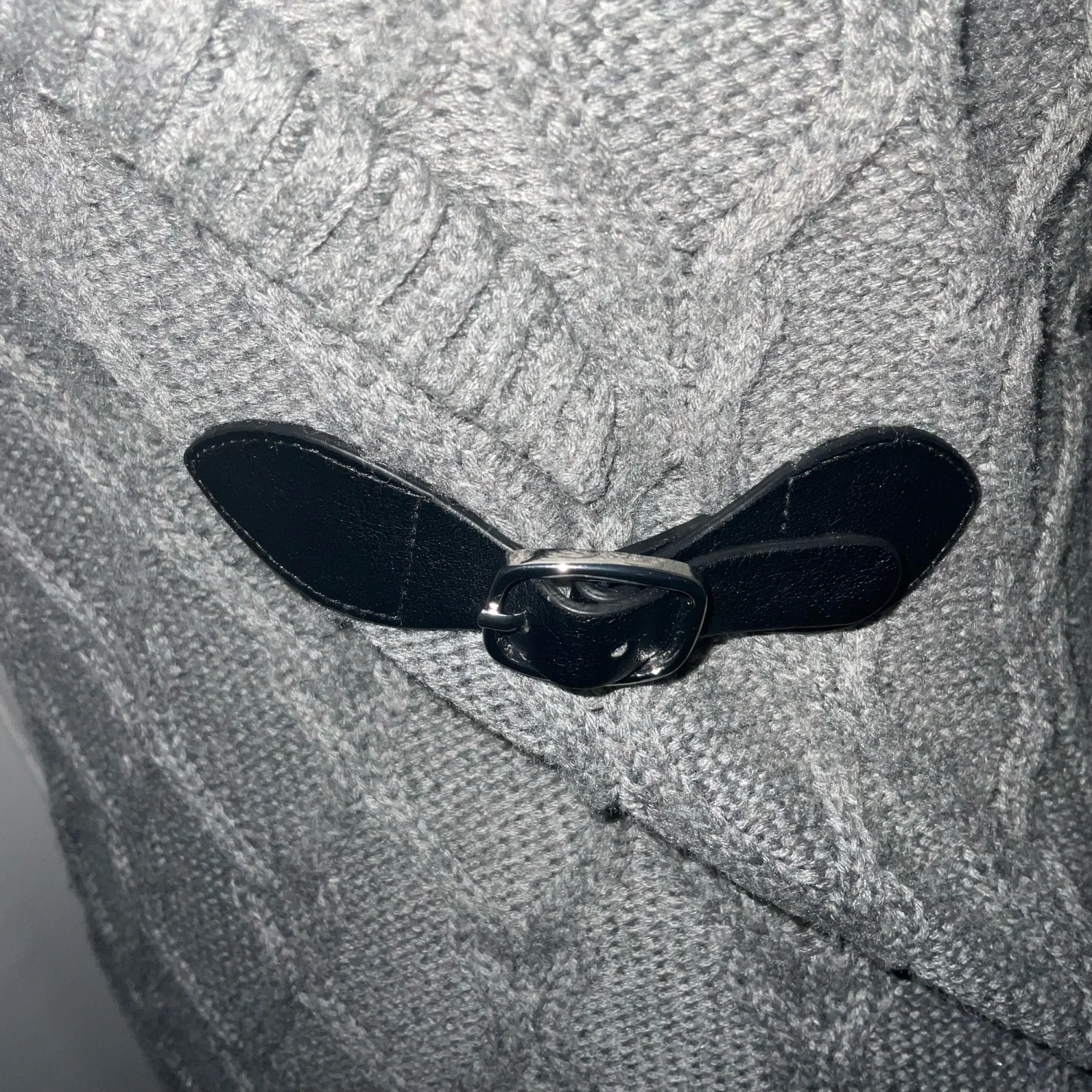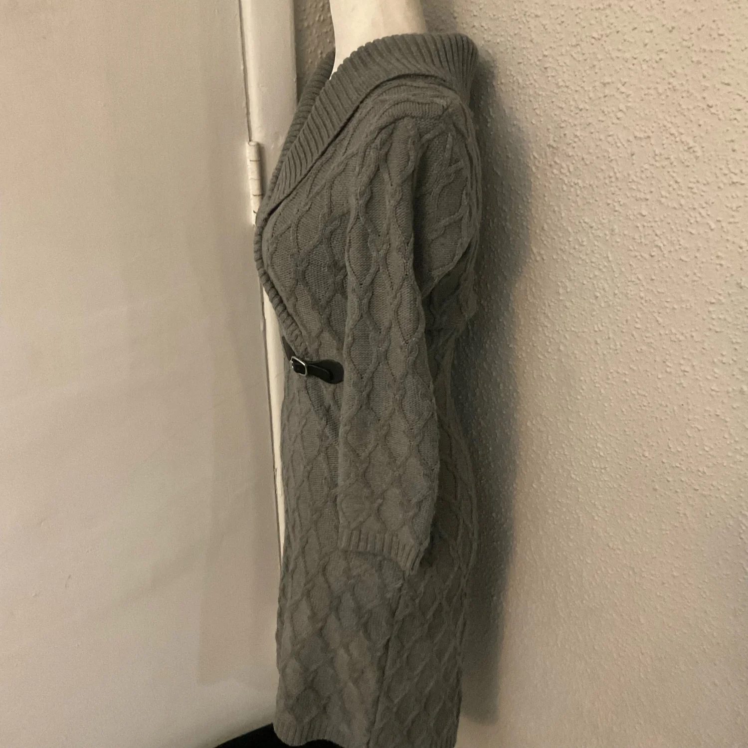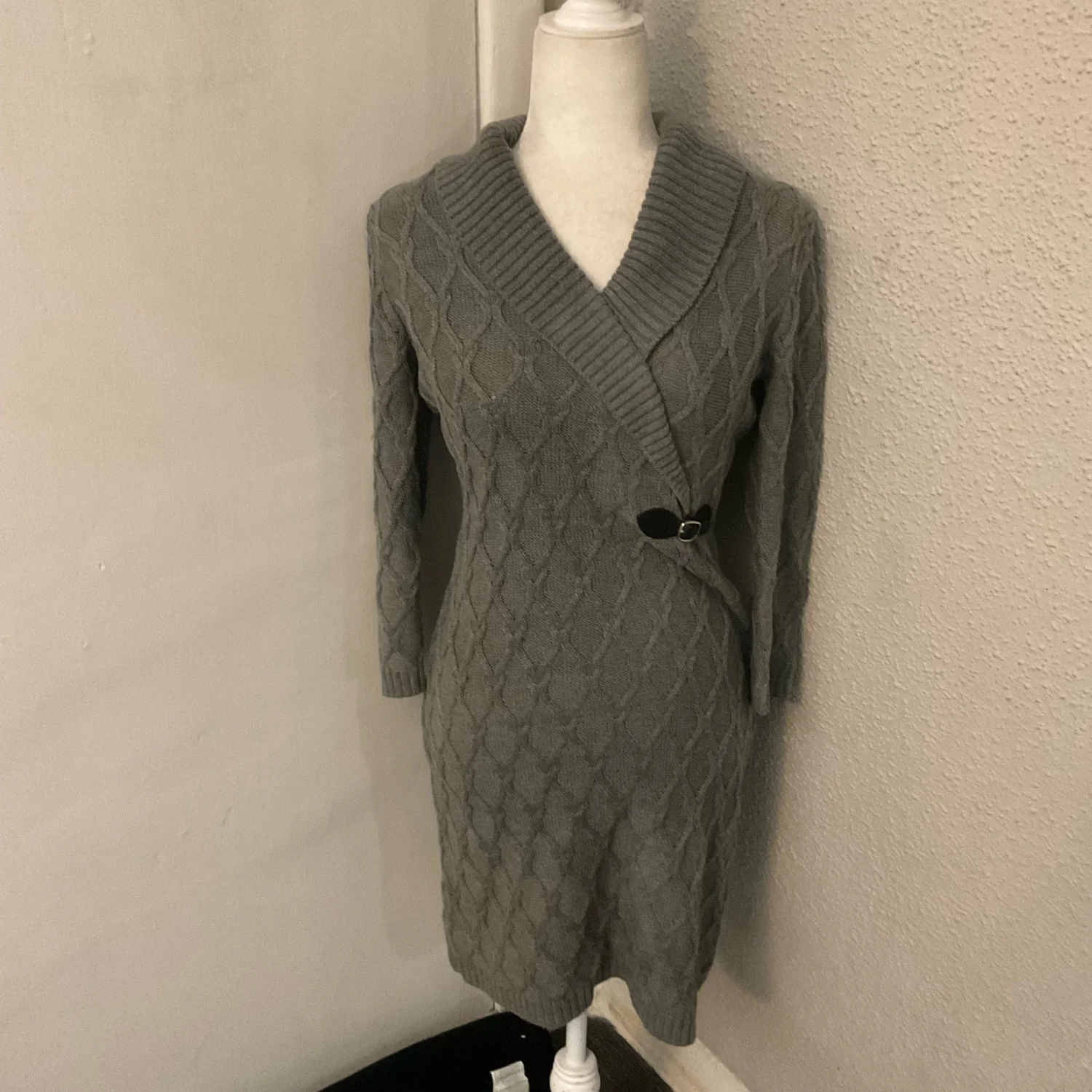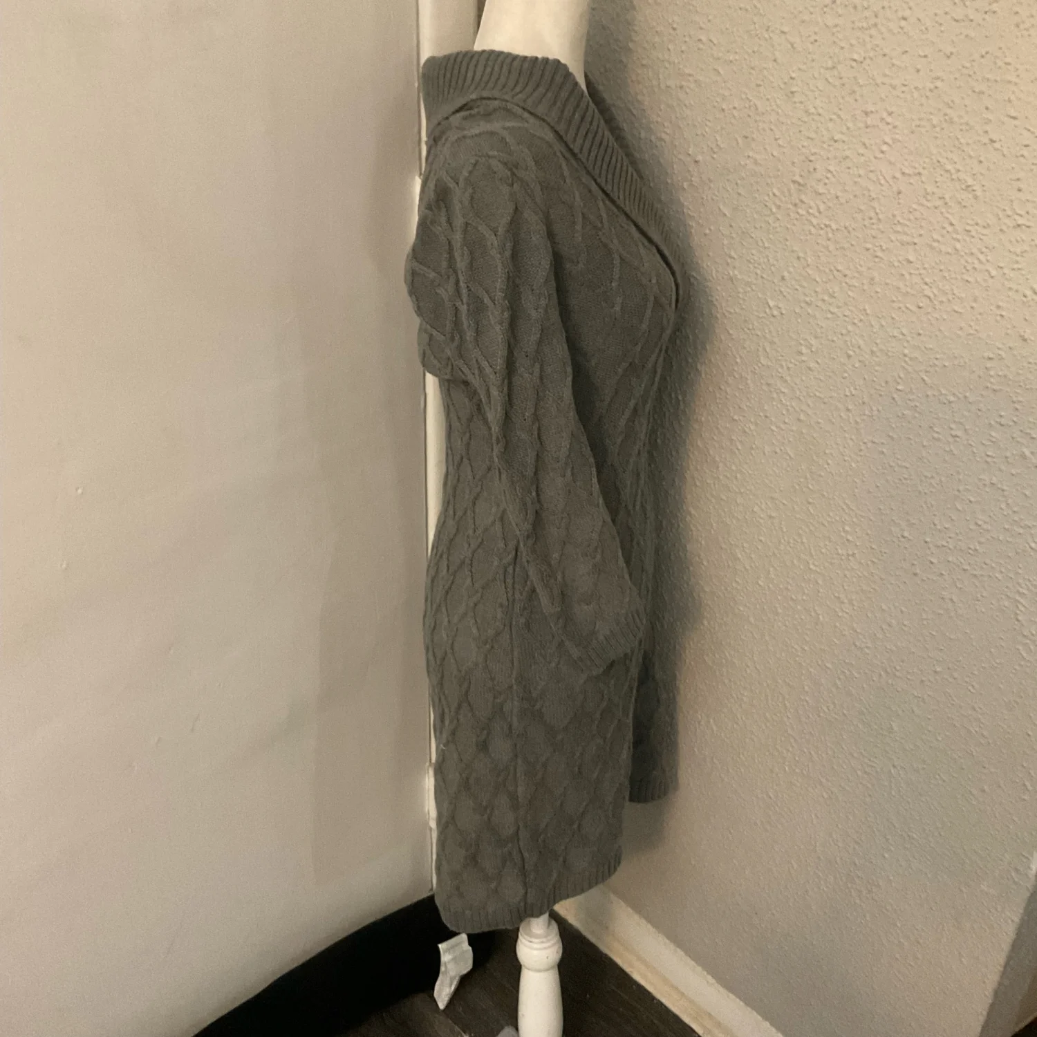 Style: Long sleeve cable knit sweater dress with shawl collar and side buckle detail. Ribbed trim at neck and cuffs. Hemline falls above knees Color: Charcoal Tin Gray Size: S Armpit: 15” Length: 39” Condition: Good 100% Cotton Hand wash