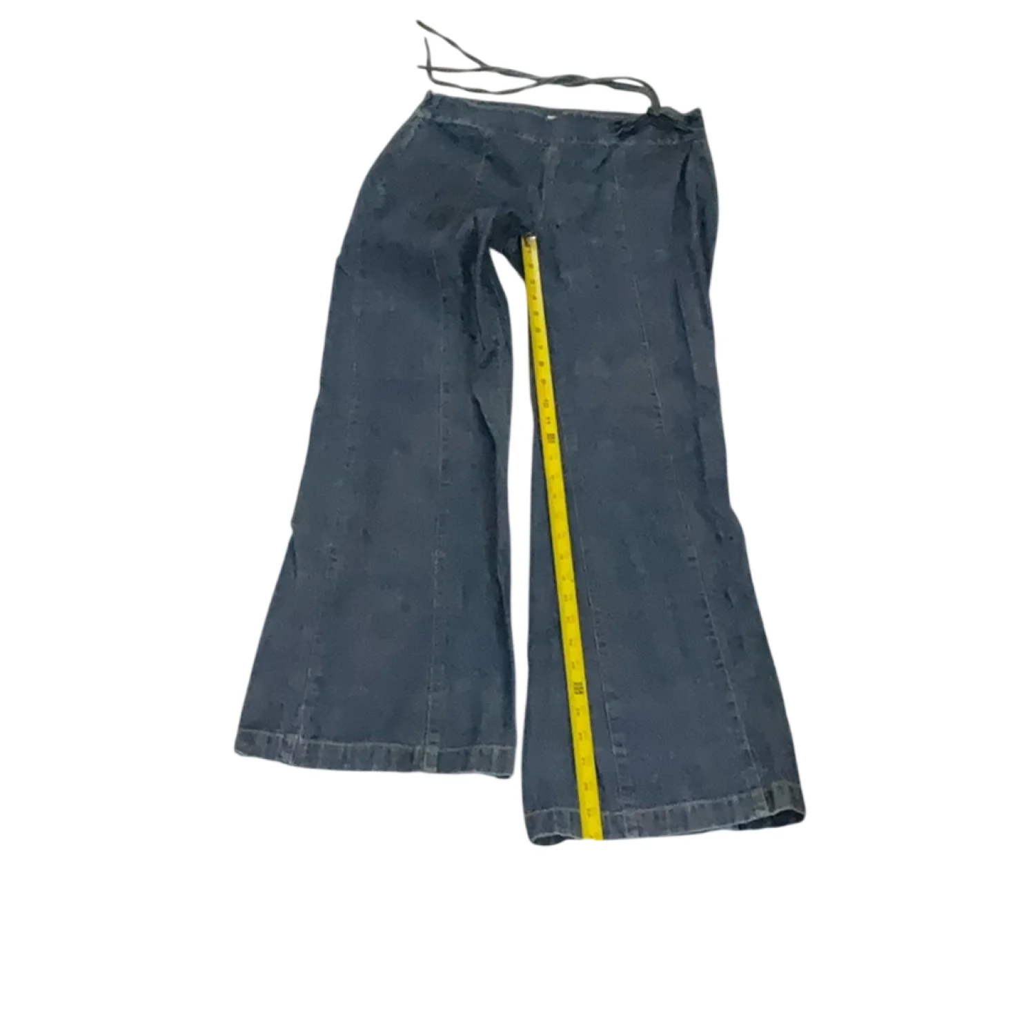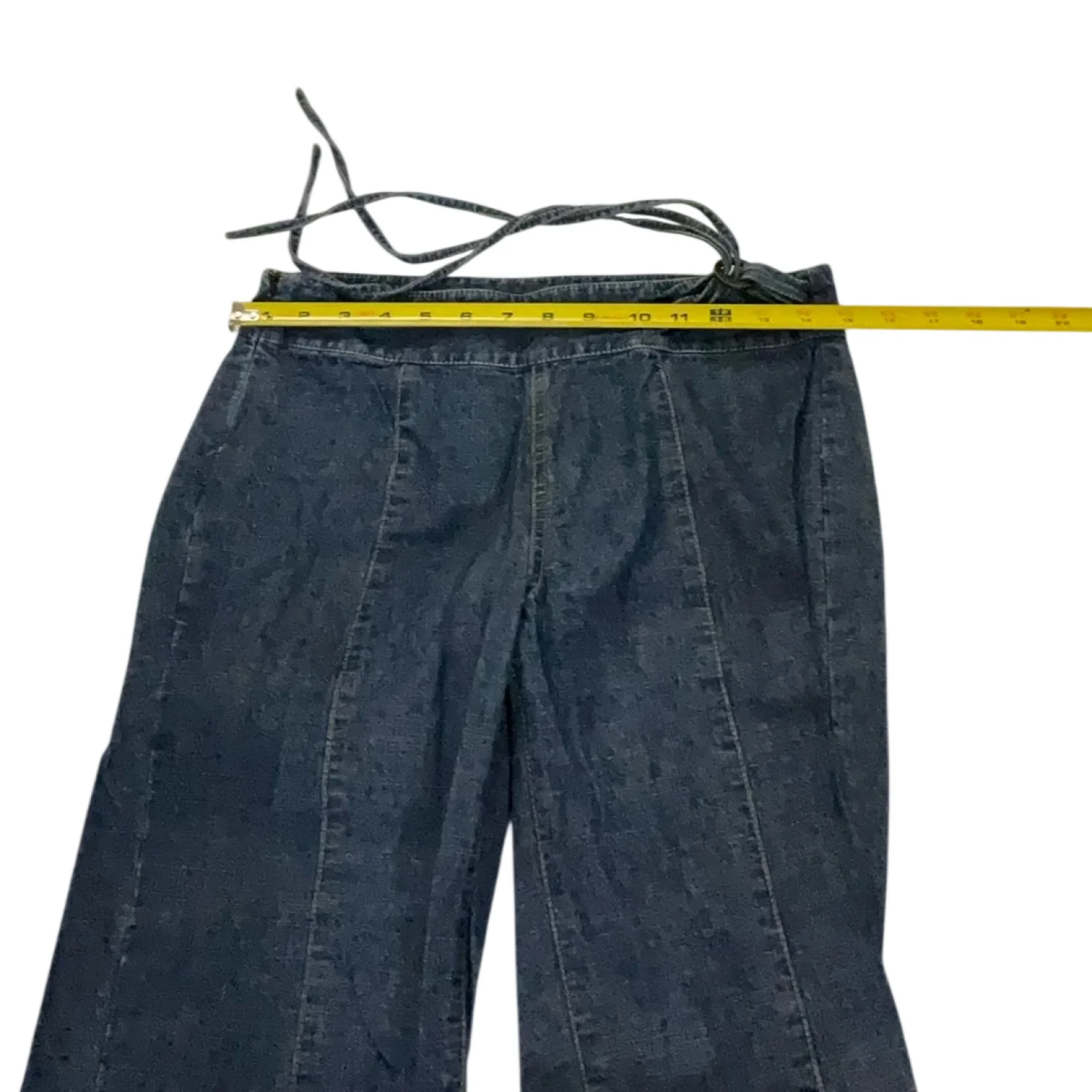 Style: Medium Wash Jeans with side tie closure, no pockets 70's look Color: Blue Size: 2 Waist: 16" Rise: 10" Inseam: 28:" Condition; Good; Small hole on side that can be repaired 100% Cotton Machine wash