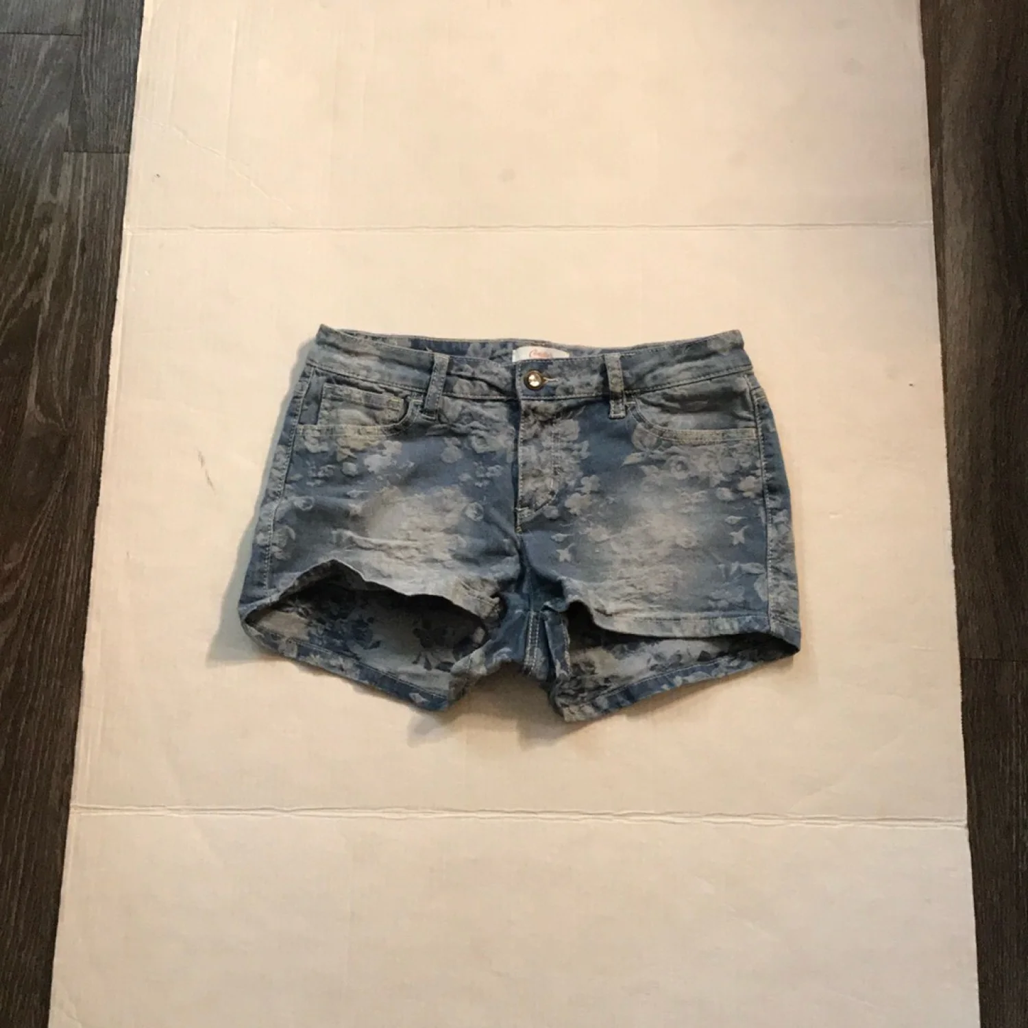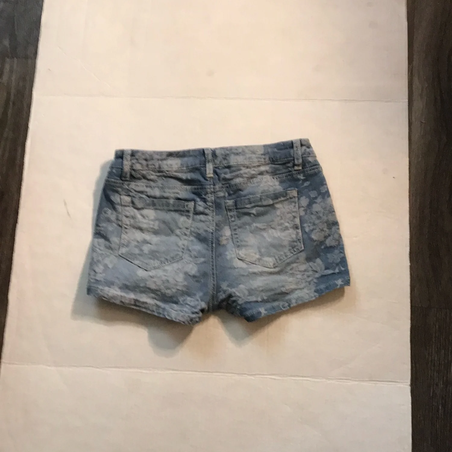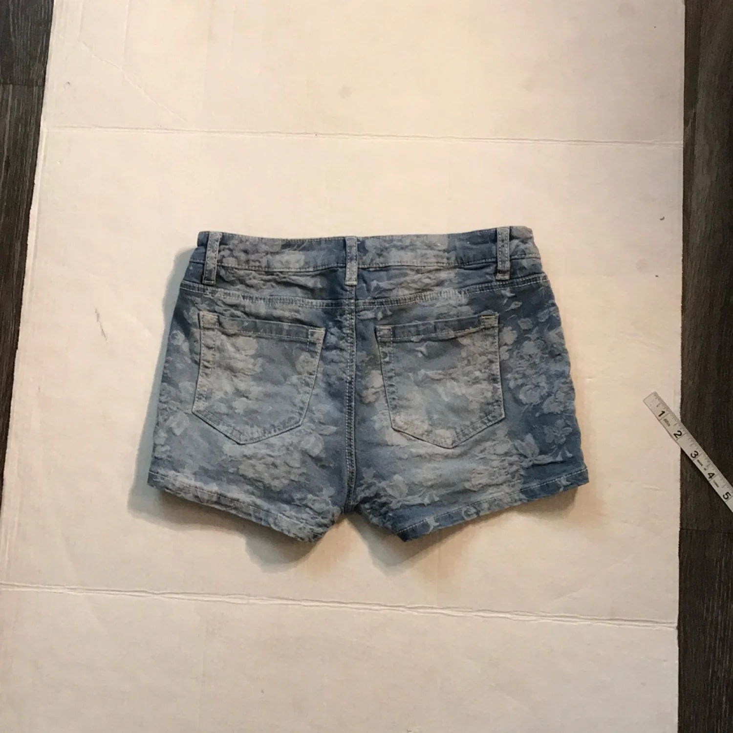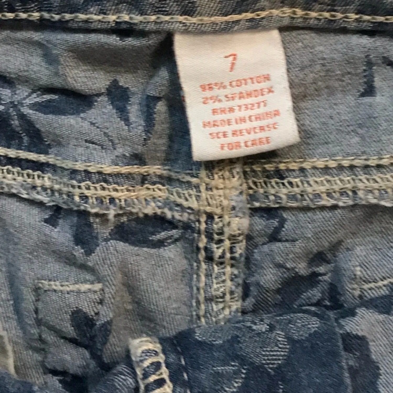 Style: Faded 5 pocket floral jacquard desisgn denim short Color: Blue/White Size: 7 (Juniors) W:14” Rise: 10” Length: 11” Condition: Good 98% Cotton 2% Spandex Machine wash cold