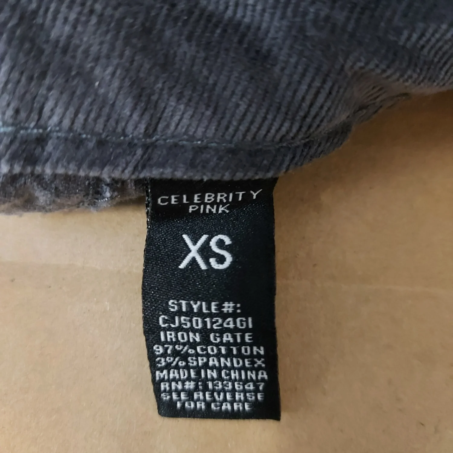 Style: Corduroy, button front closure with belt loops Color Gray Size XS Waist: 13" Length: 15" 97% Cotton 3% Spandex Machine wash cold