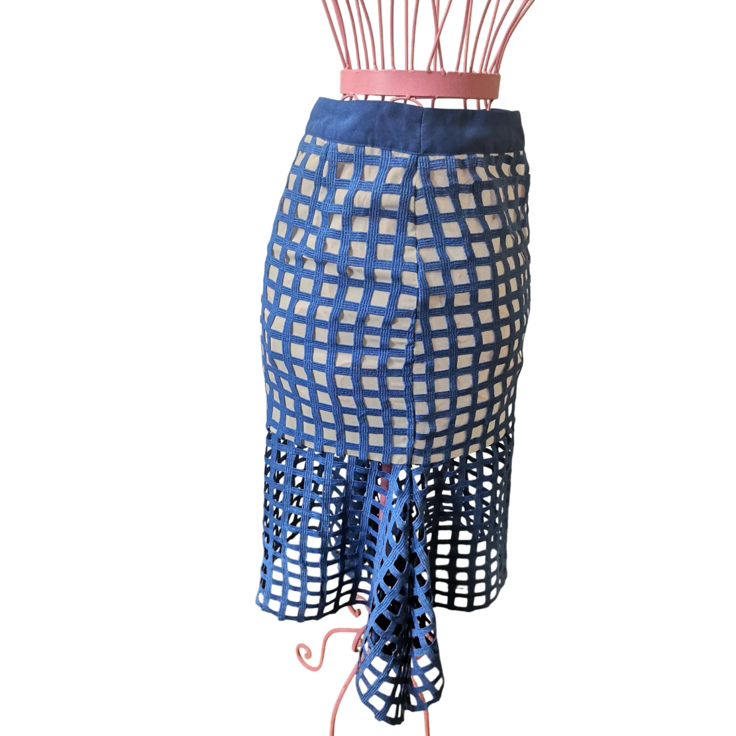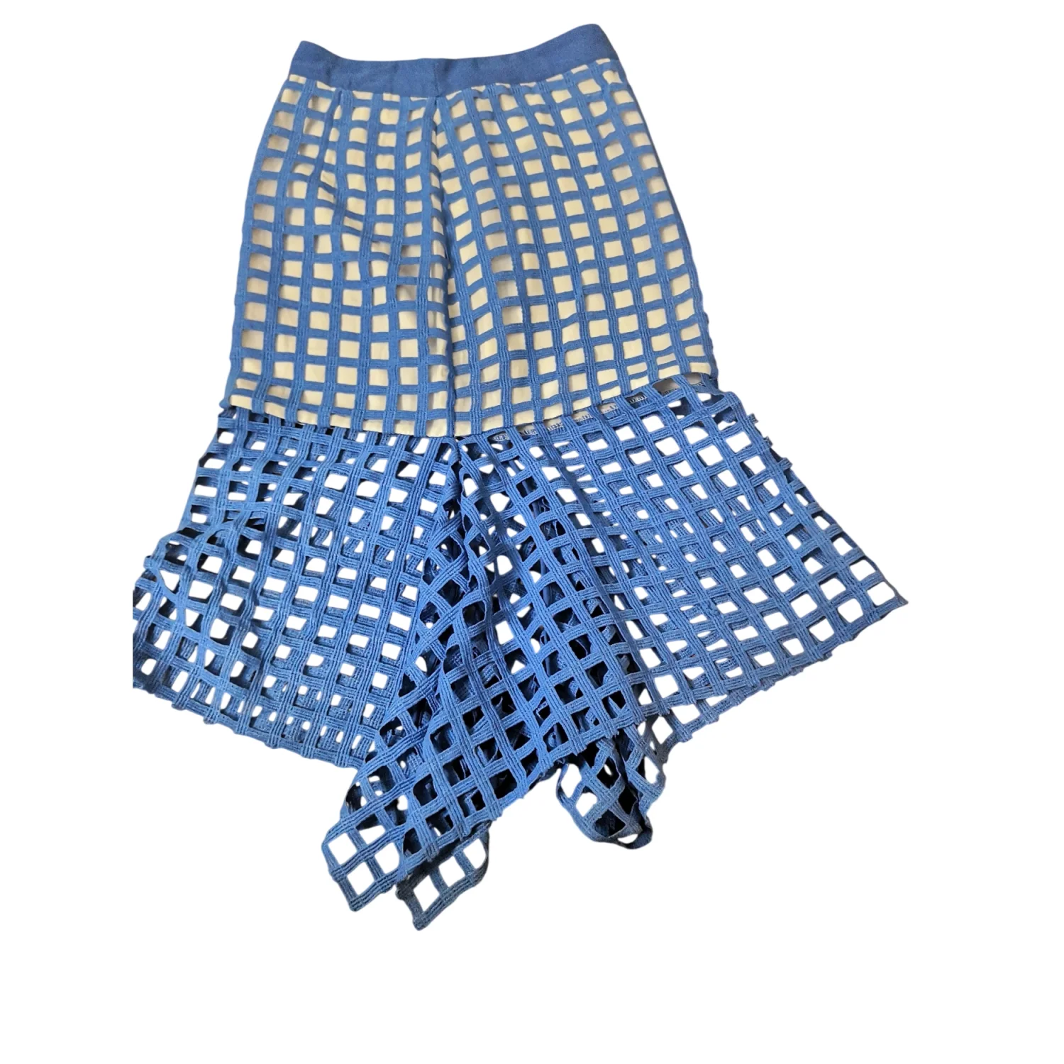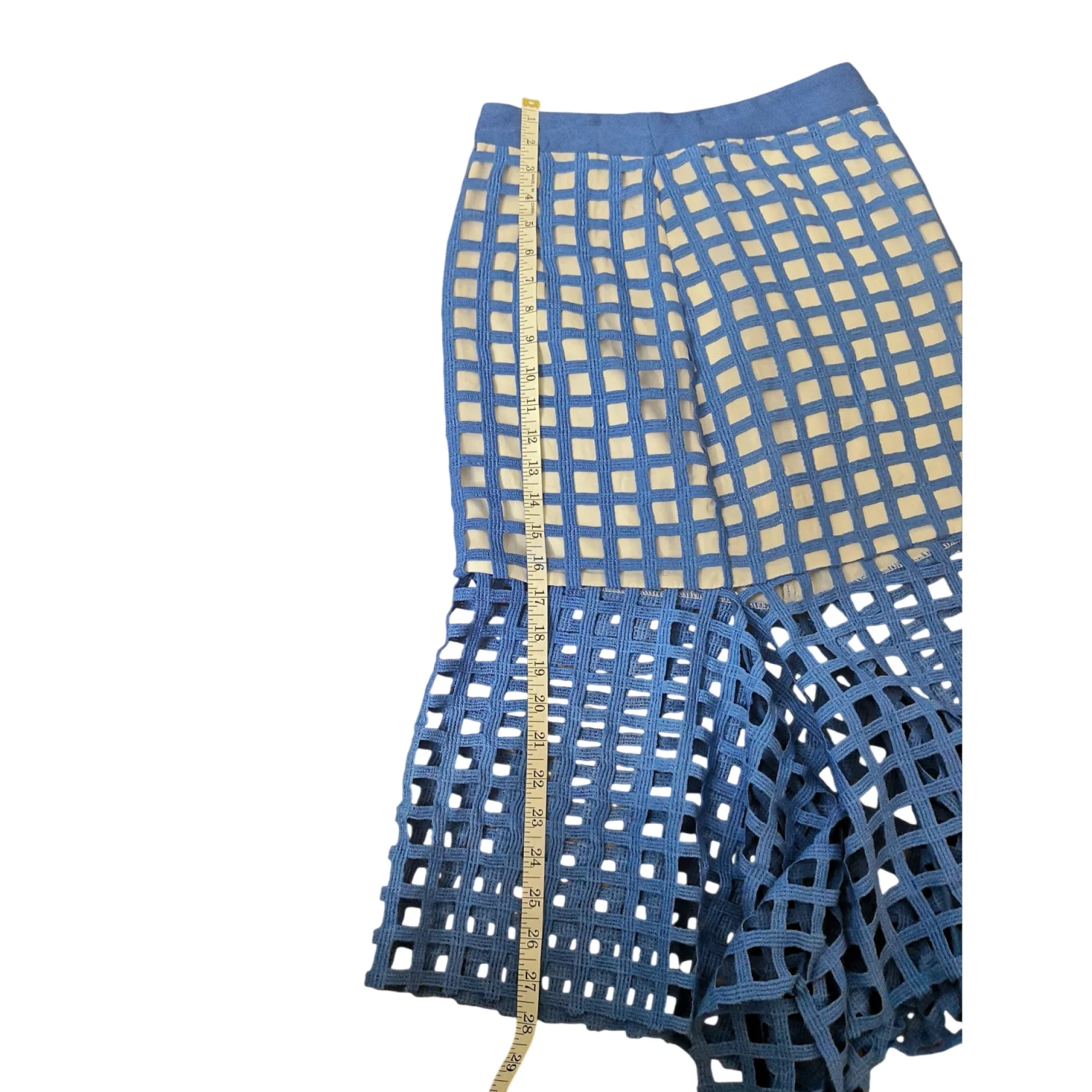 Style: Fishtail midi skirt with white see through panels Color: Blue/White Size Small Waist: 13" Length: 28" 100% Polyester Hand Wash Cold Needs small stitch repair at bottom of zipper as pictured