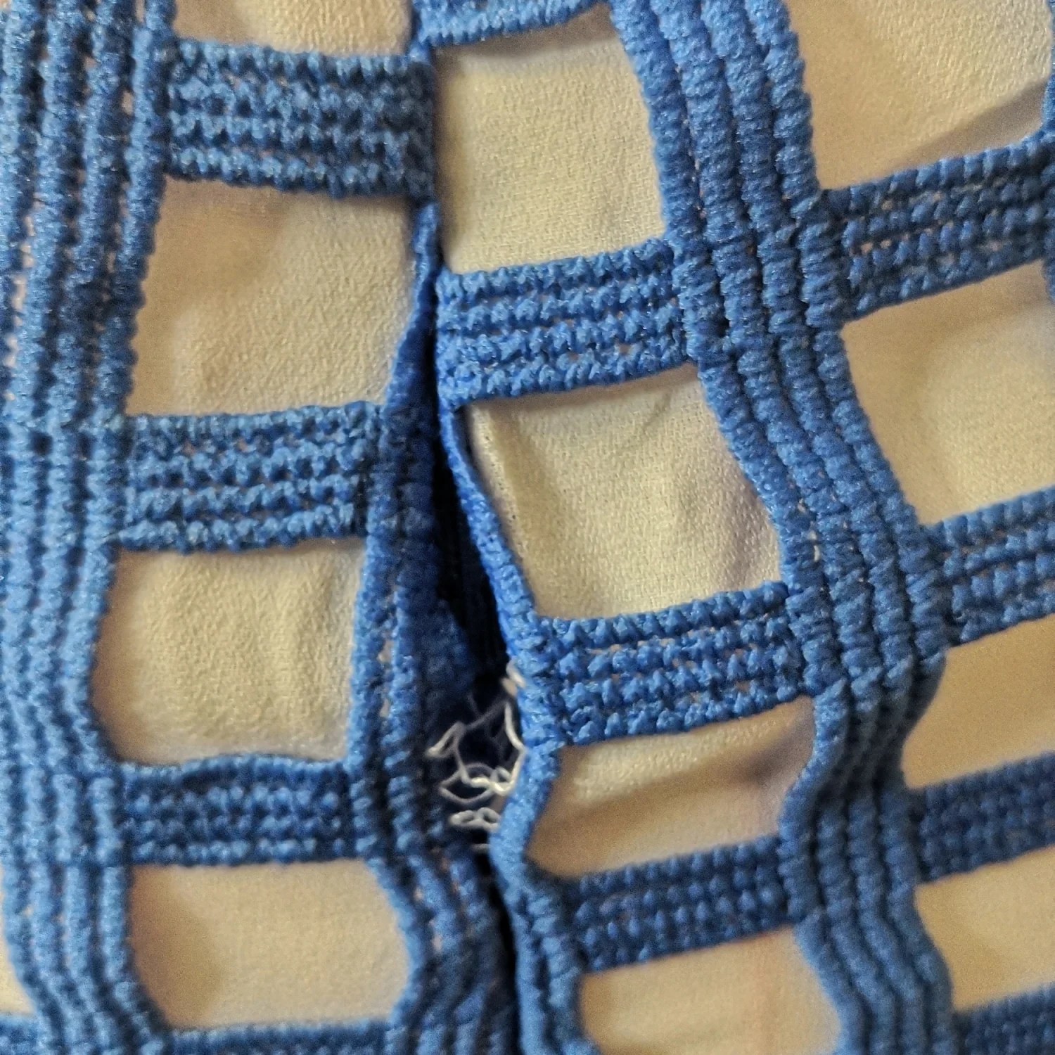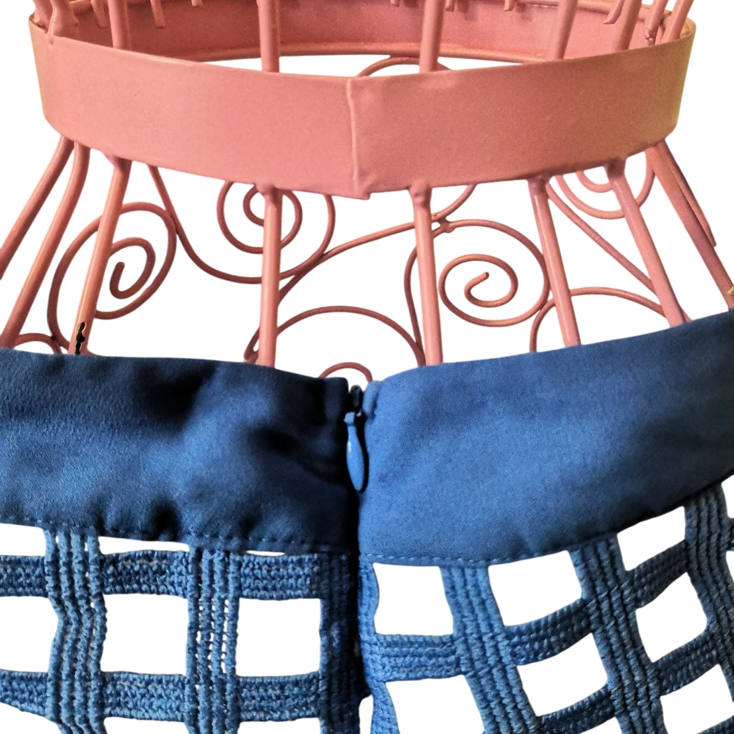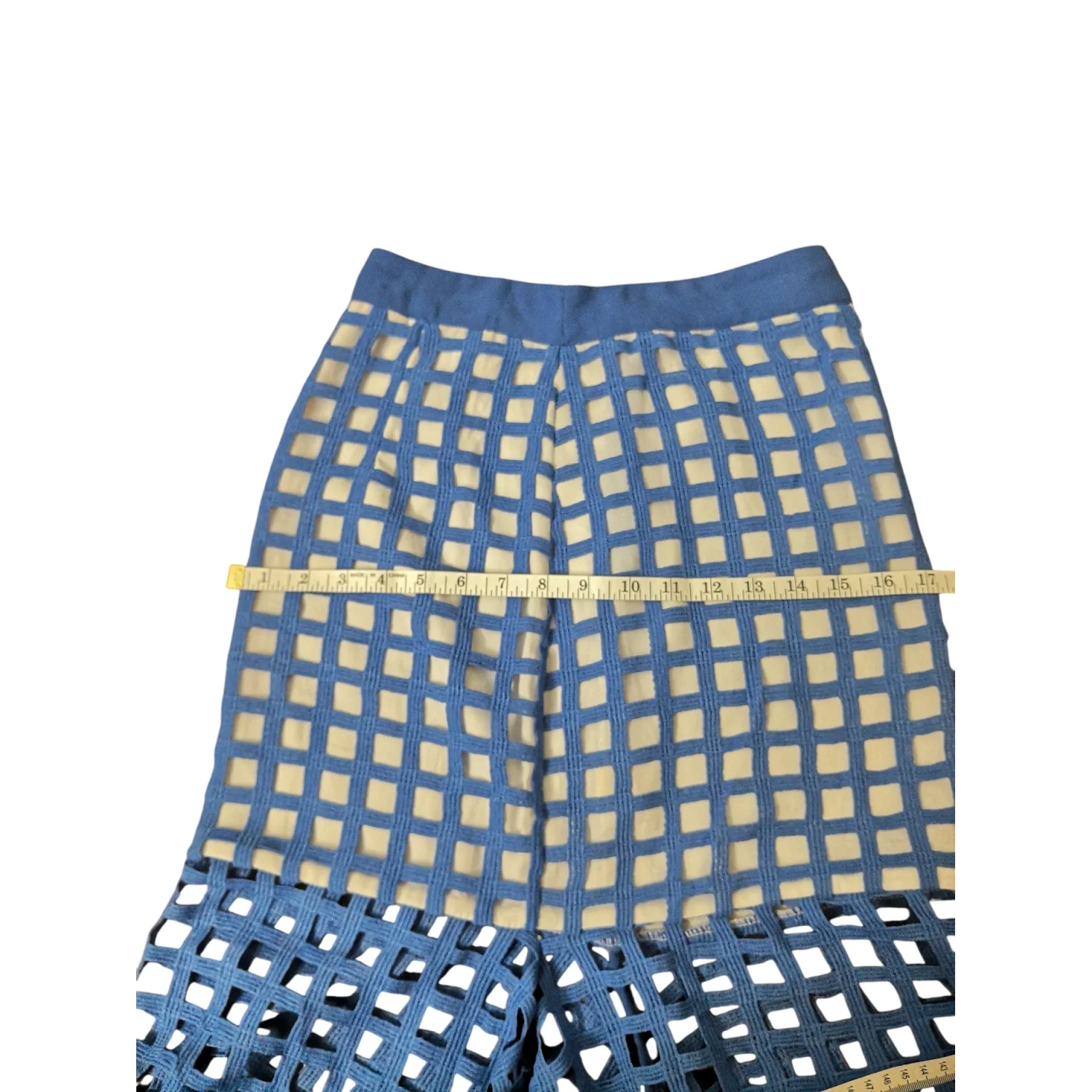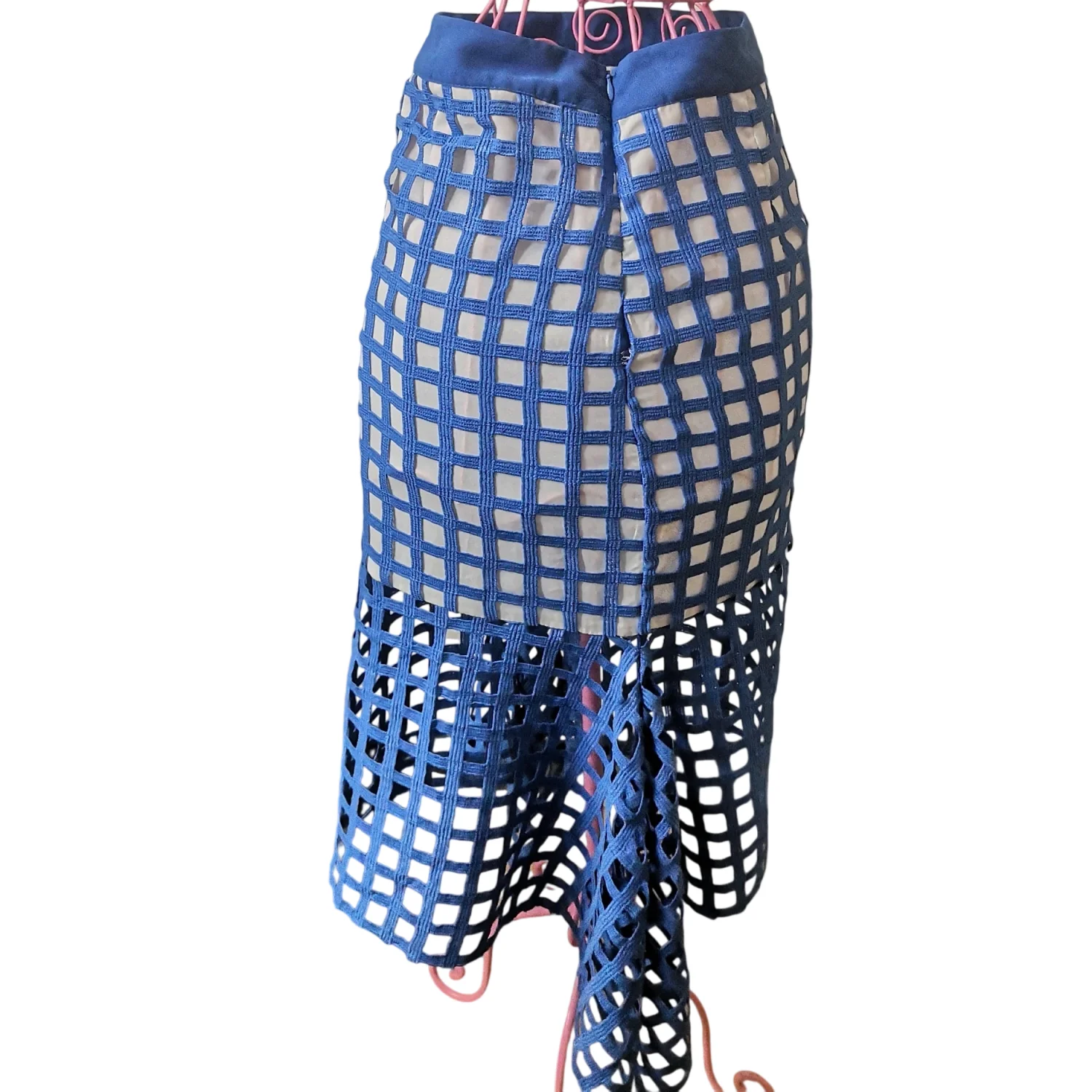 Style: Fishtail midi skirt with white see through panels Color: Blue/White Size Small Waist: 13" Length: 28" 100% Polyester Hand Wash Cold Needs small stitch repair at bottom of zipper as pictured