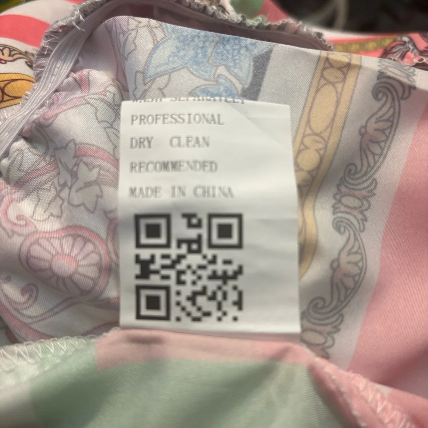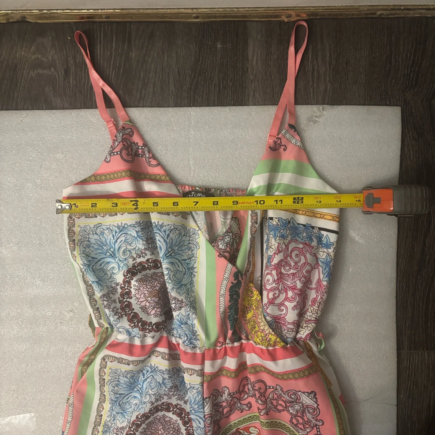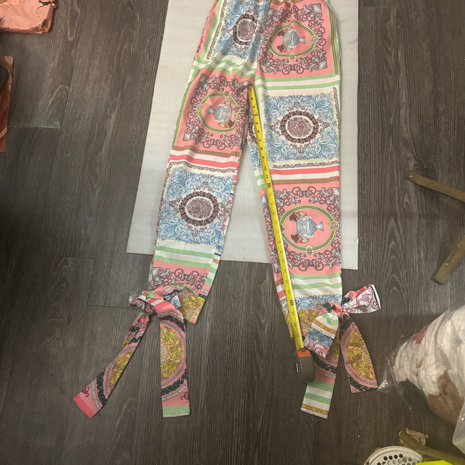Style: V- Neck, two pocket, ankle tie Color: Multicolor Size: S Armpit: 14" Waist: 12" Length: 27" 35% Cotton 65% Polyester Dry clean recomended