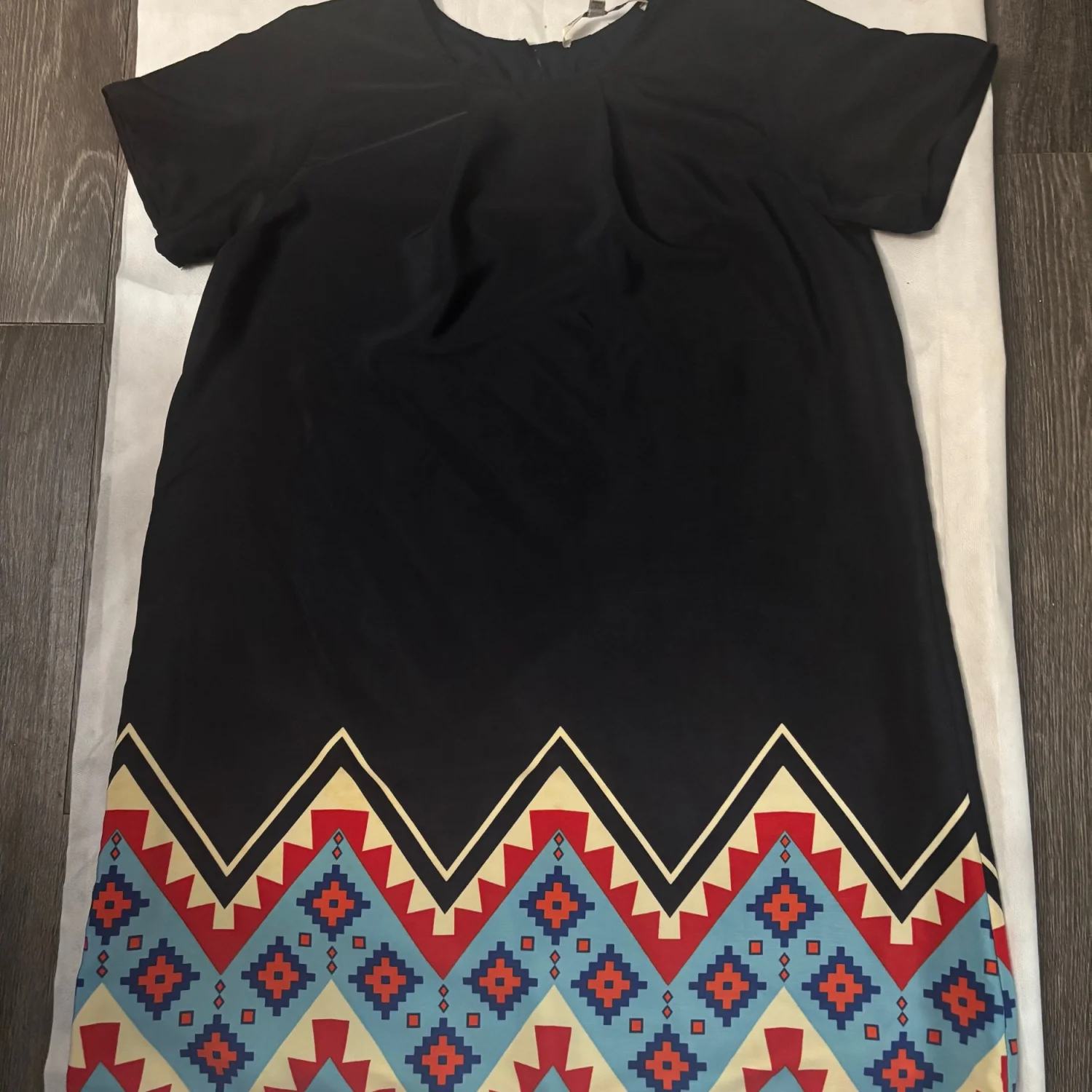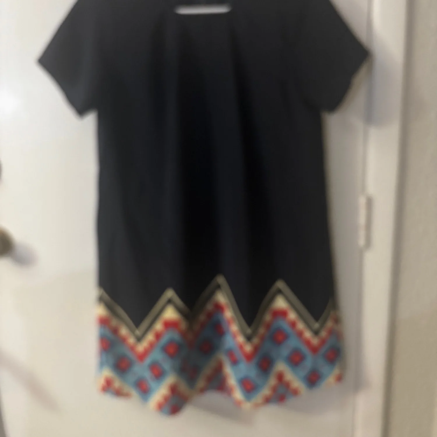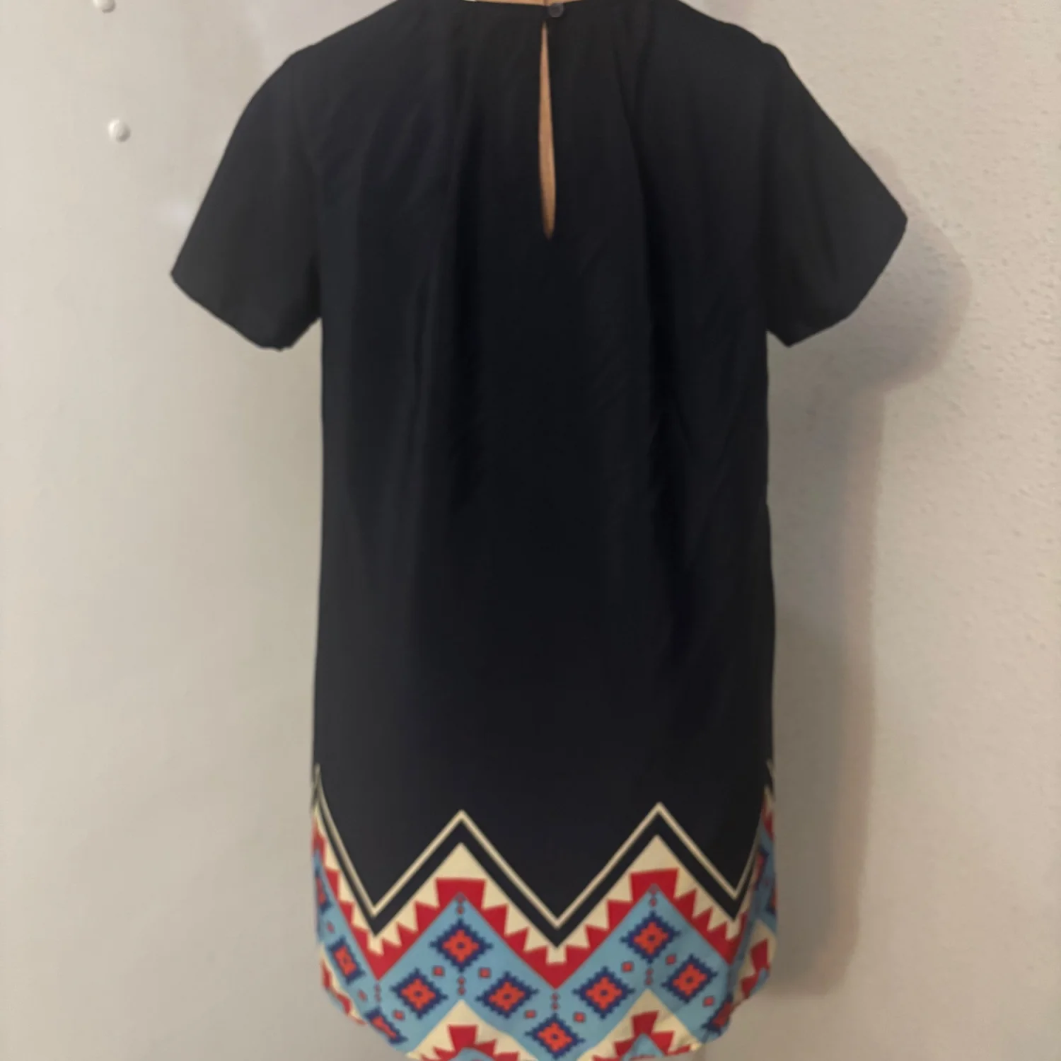 Style:Short sleeve round neck mini shift dress with tribal print on bottom hem Color: Blue/Yellow/Orange Size: XS Length: 33" Condition: Good 100% polyester Dry Clean