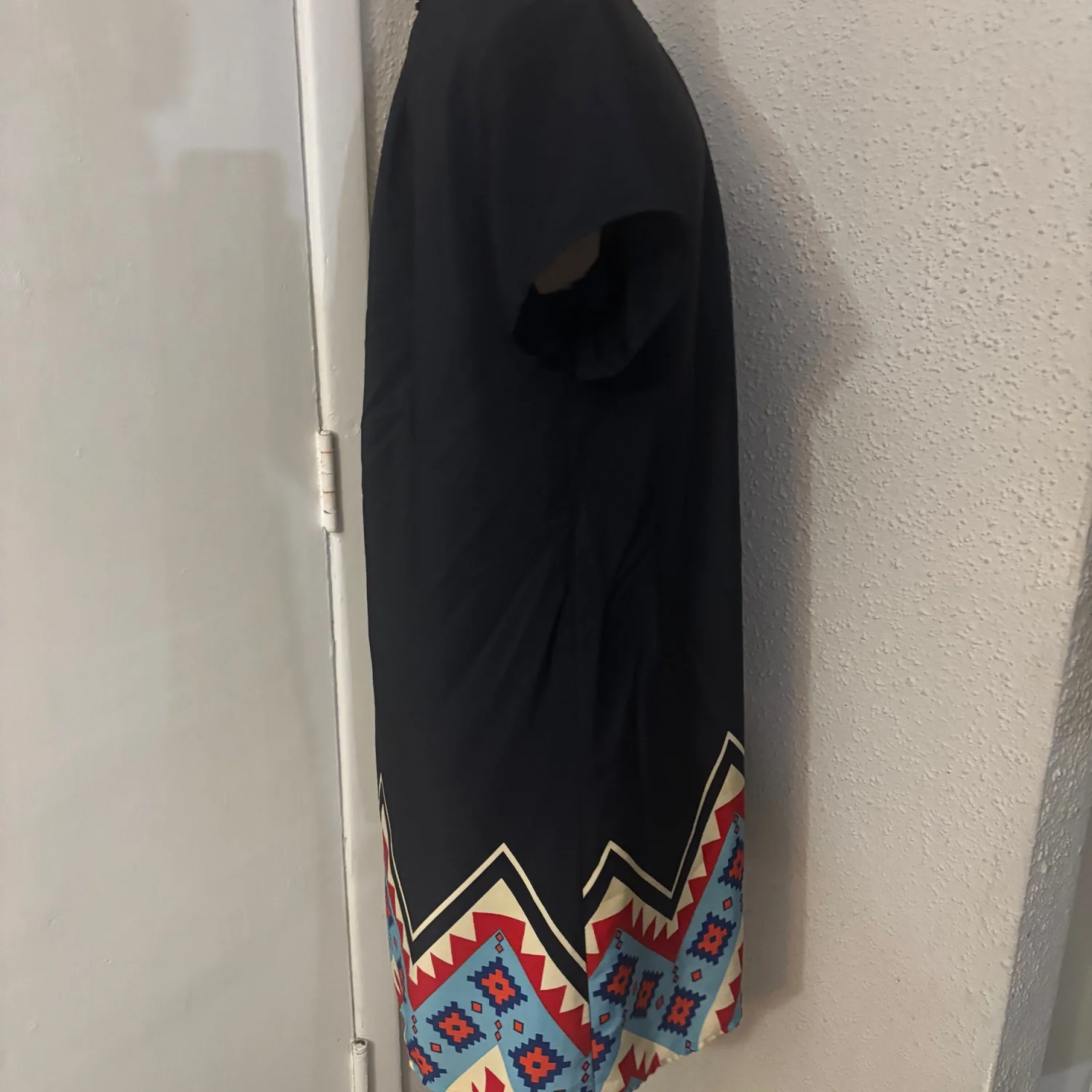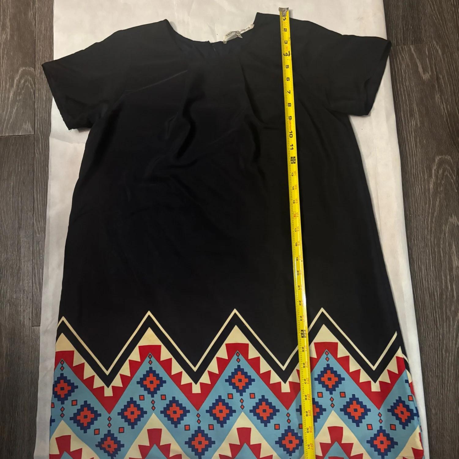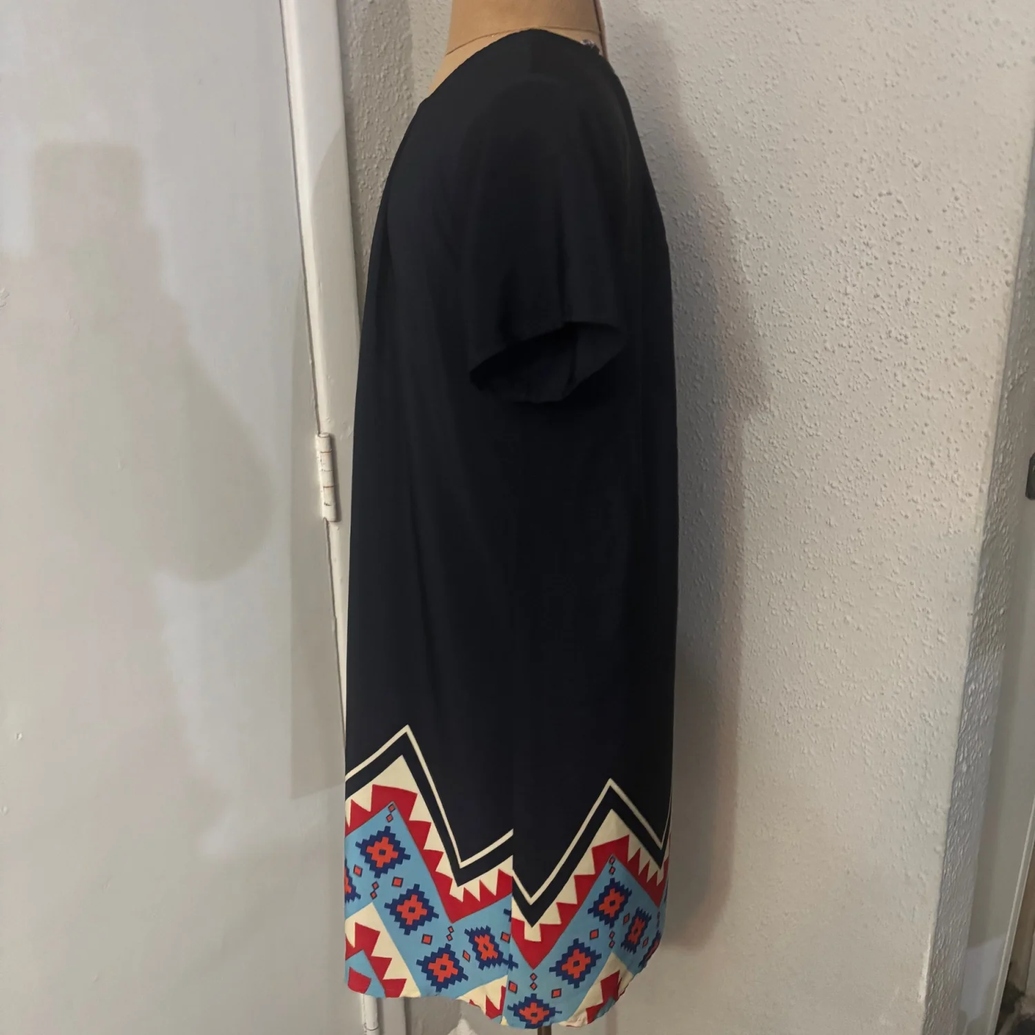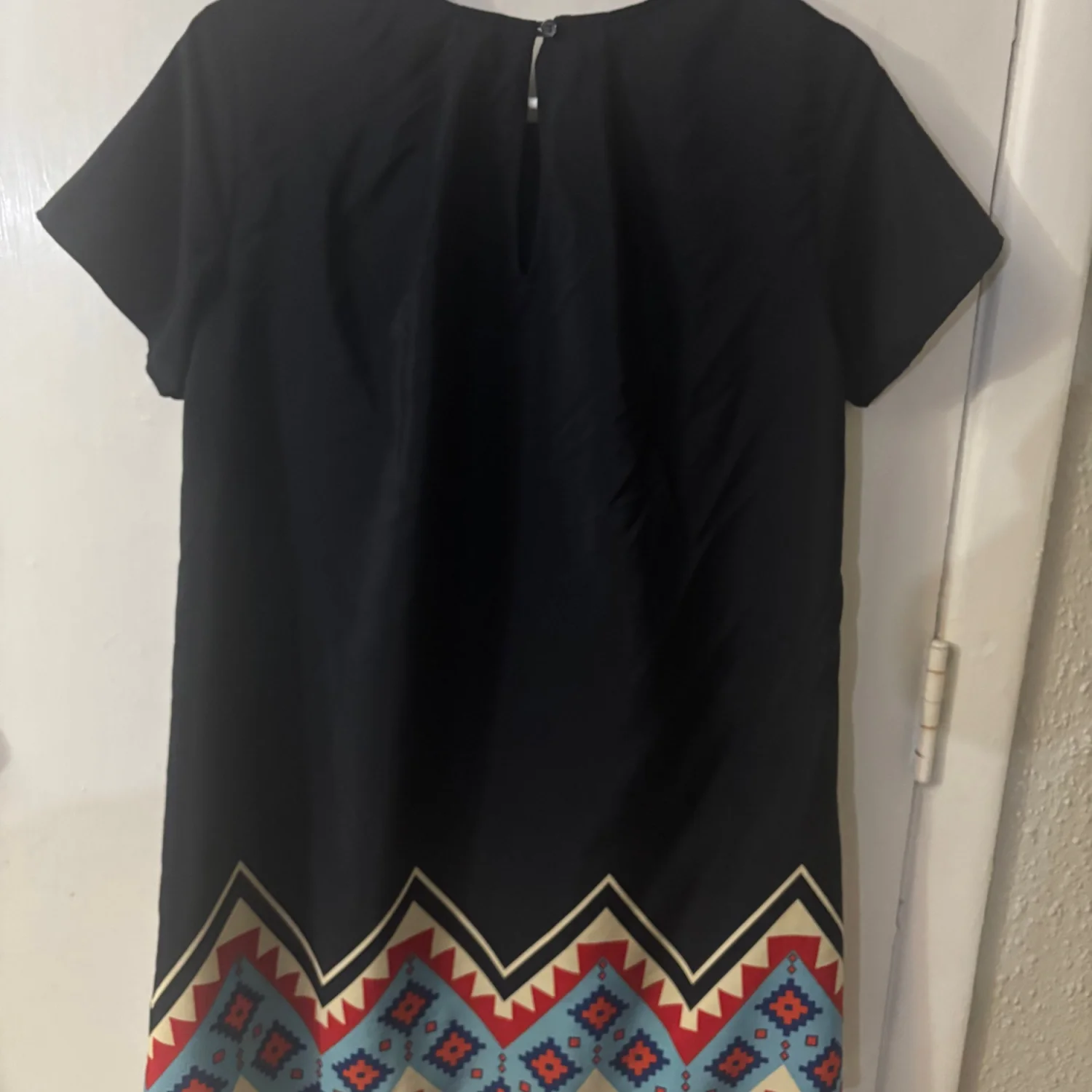 Style:Short sleeve round neck mini shift dress with tribal print on bottom hem Color: Blue/Yellow/Orange Size: XS Length: 33" Condition: Good 100% polyester Dry Clean