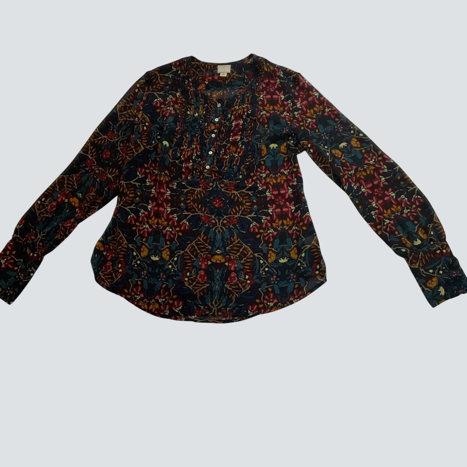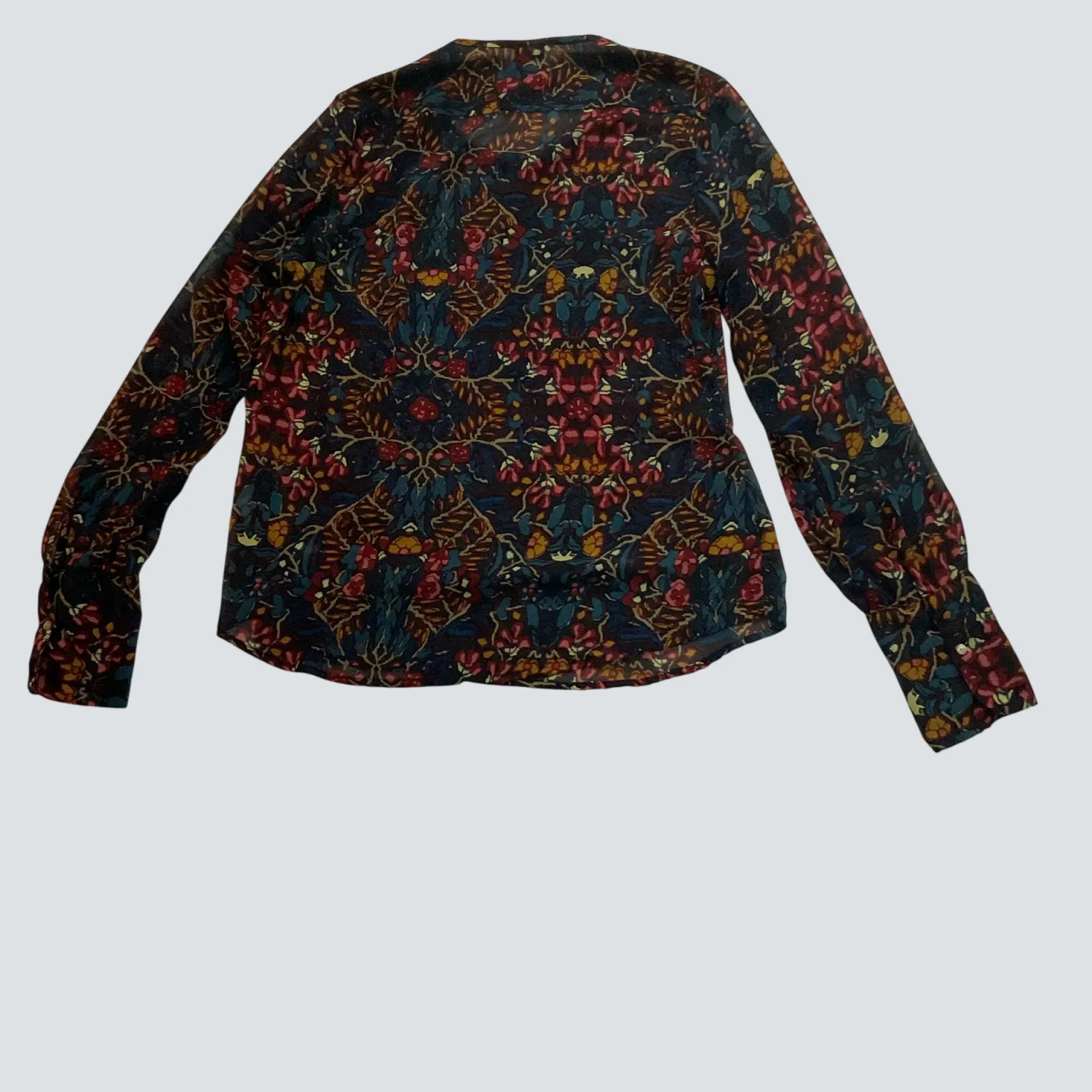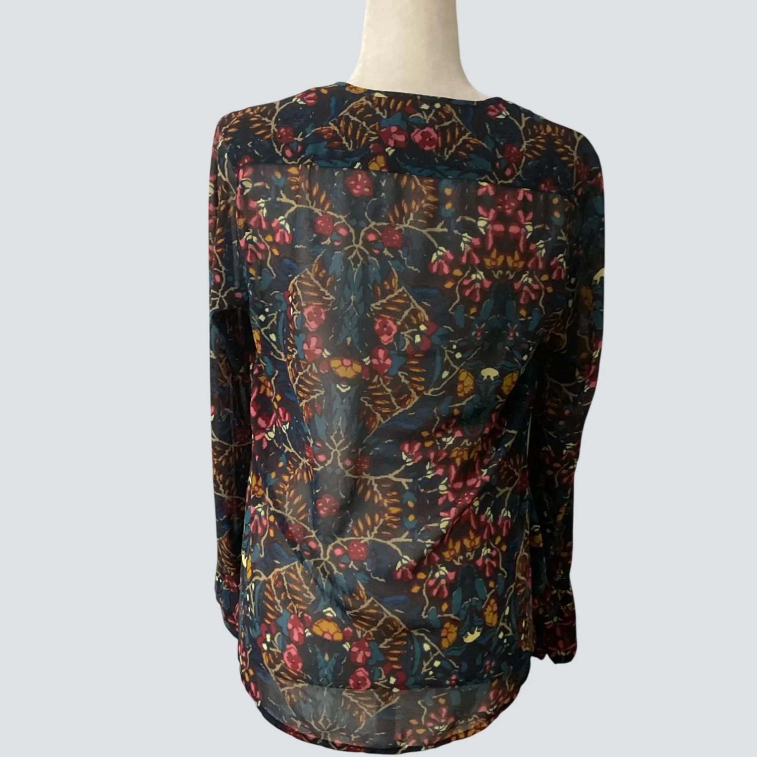 Style: Long sleeve sheer floral blouse Color: Multi-Color Size: M Armpit: 19” Length: 25” Sleeves: 21” Condition: Good 100% Polyester