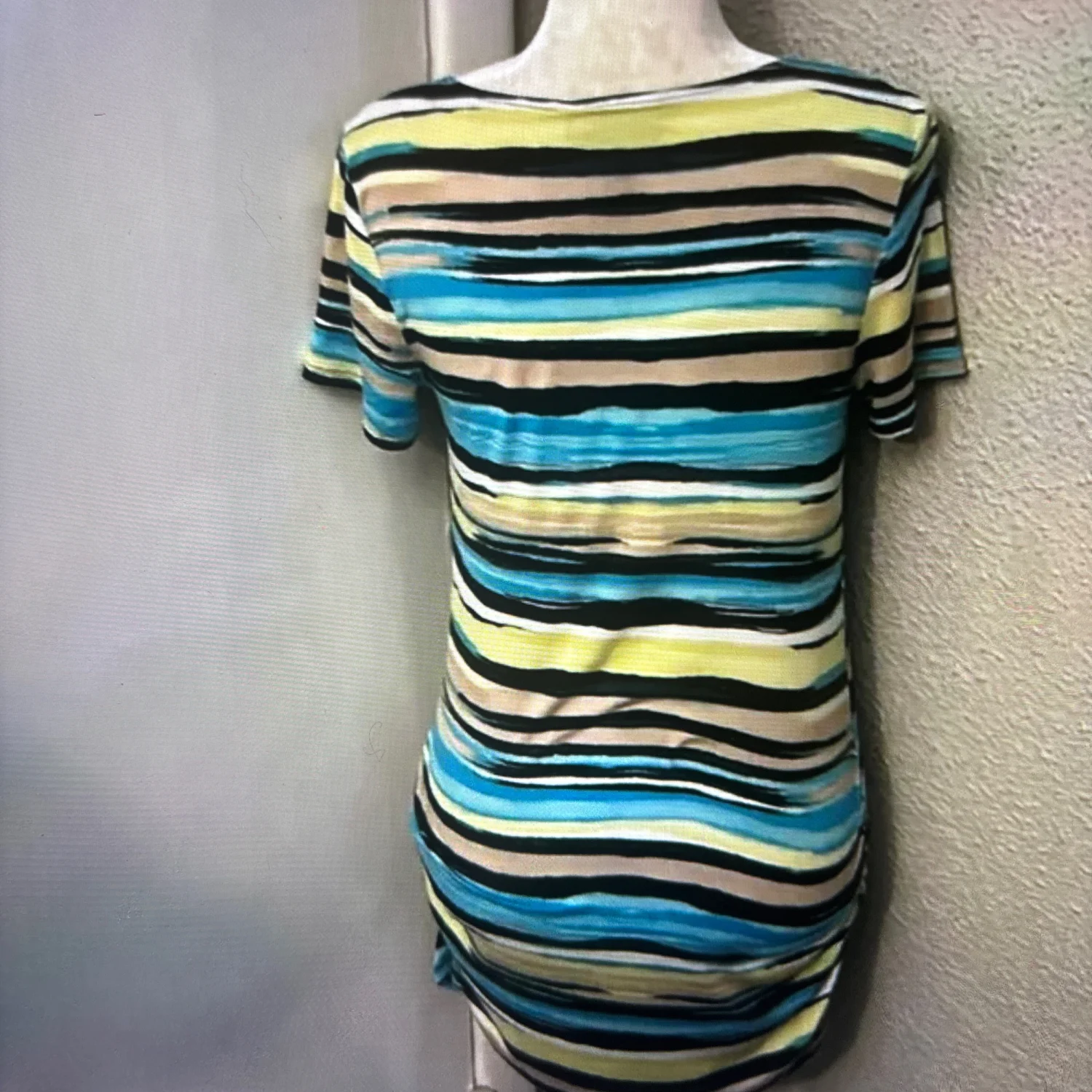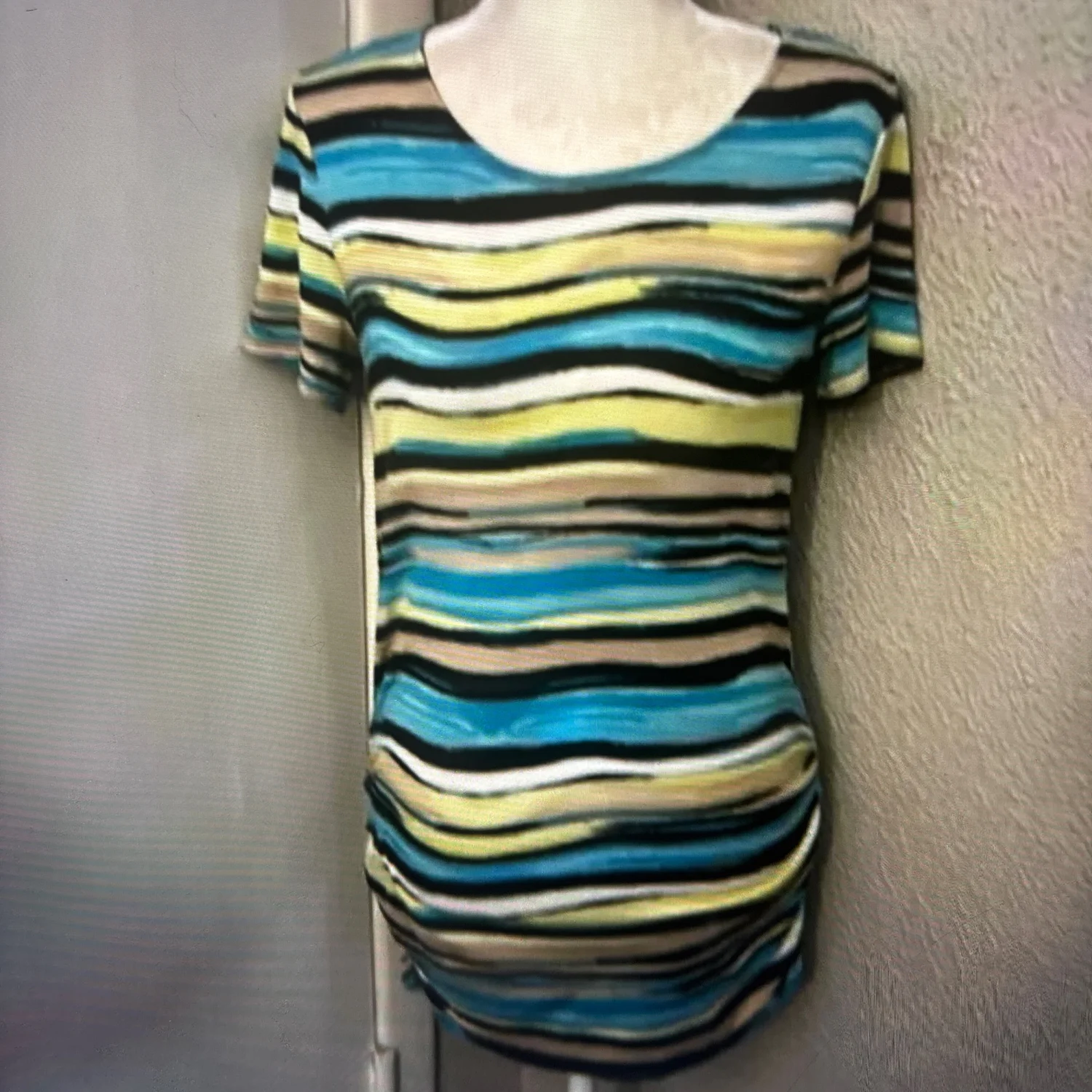 Style: Striped Crewneck shirt with ruched sides Color: Multi Size: L Armpit: 16” Length: 28” Condition: Good 95% Rayon 5% Spandex Machine wash cold