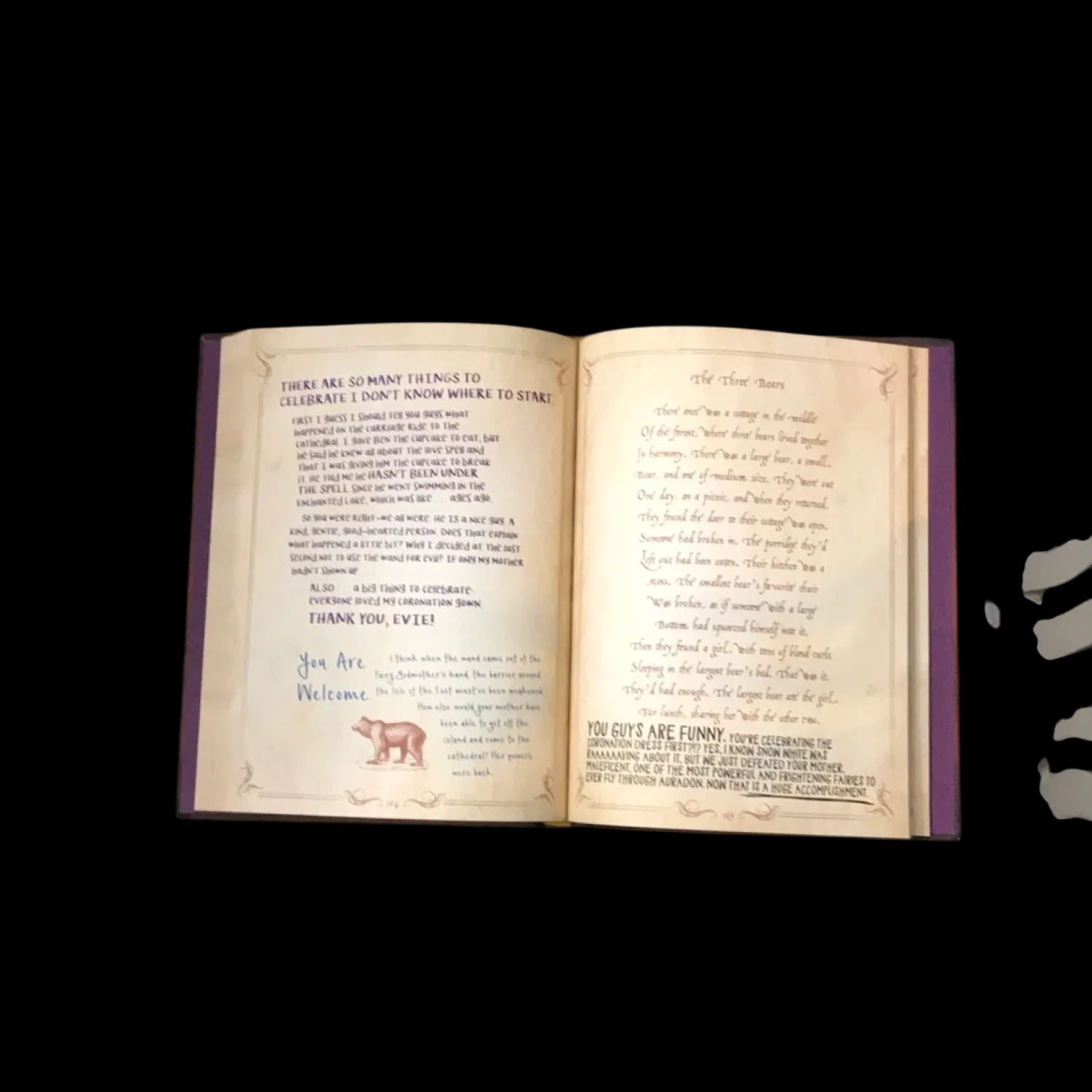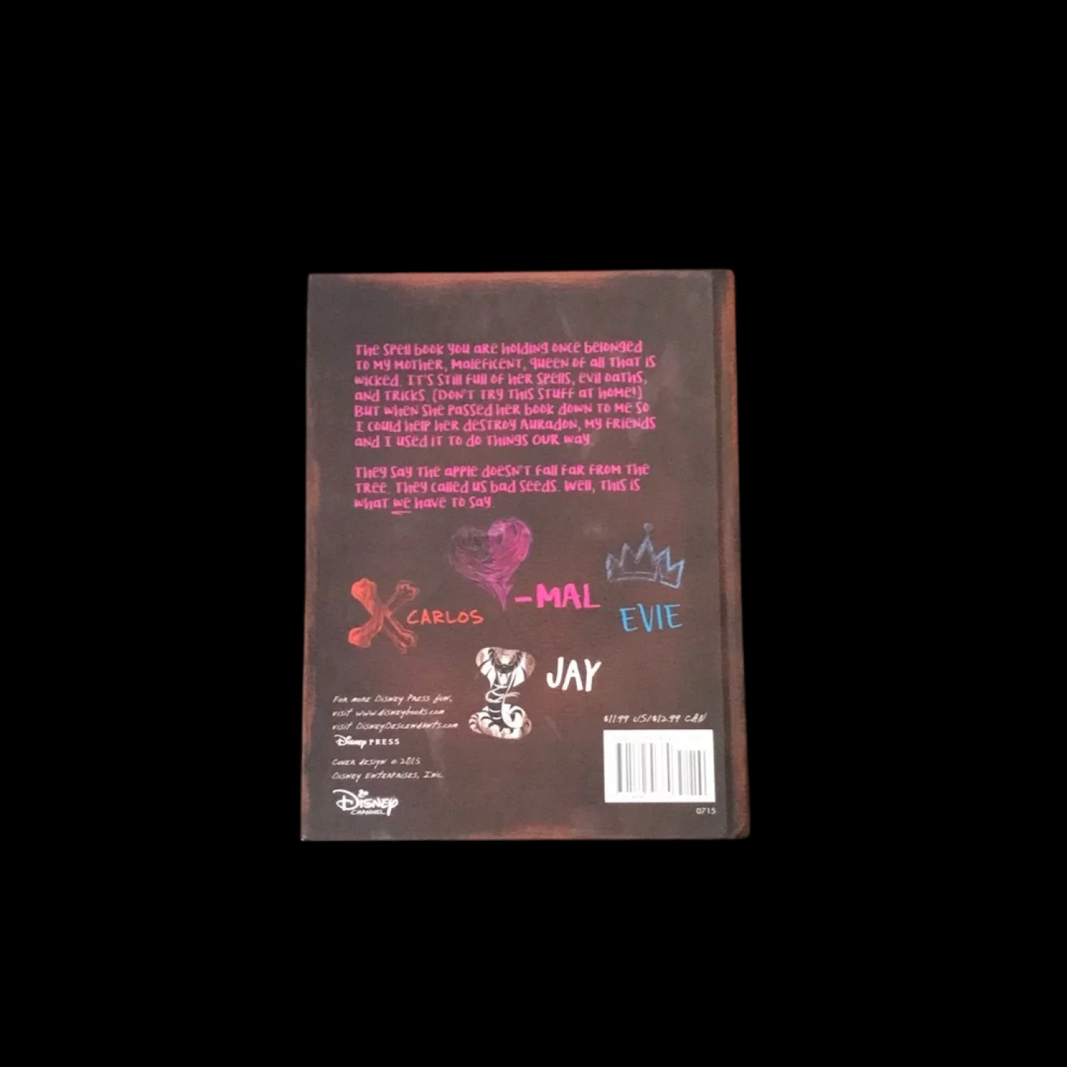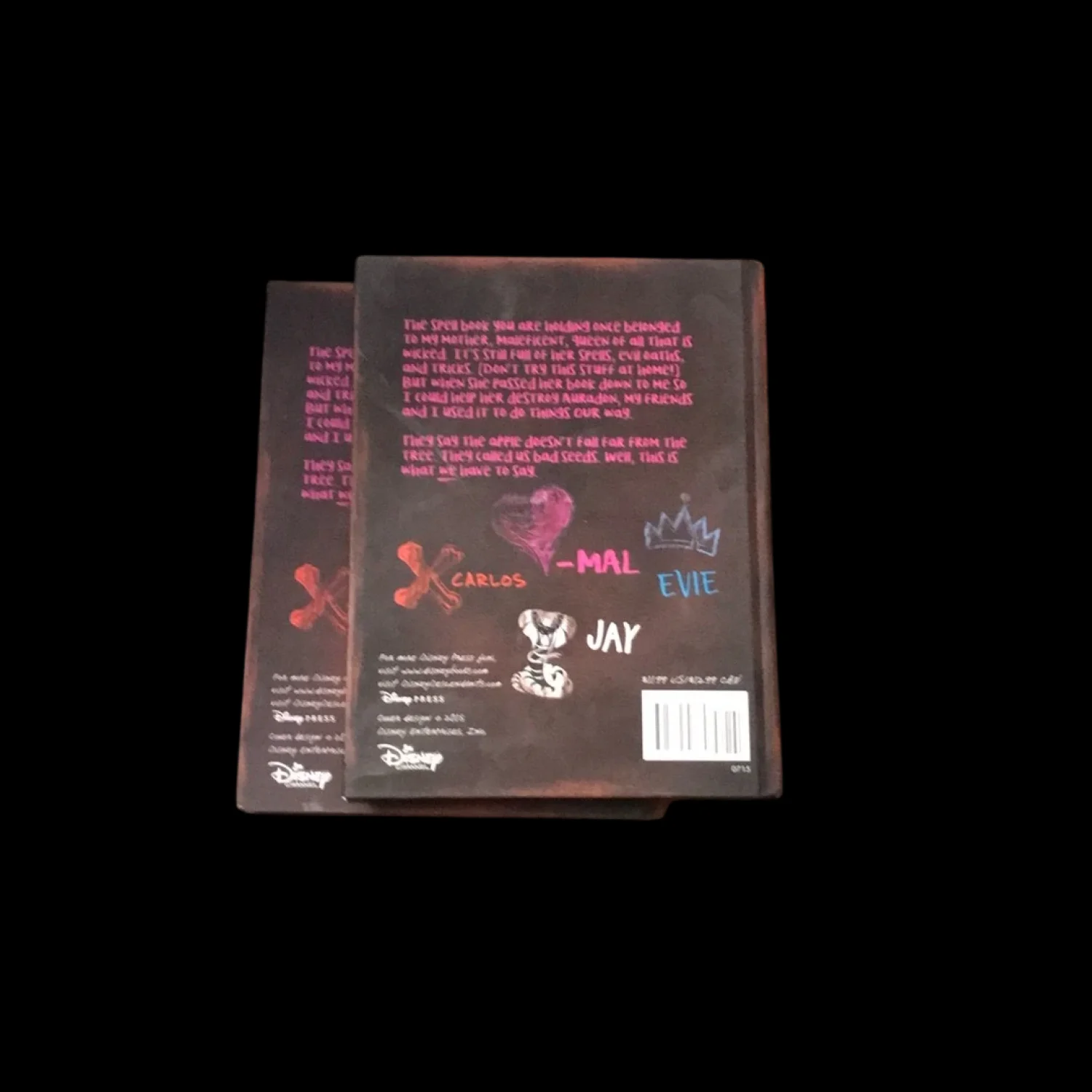 For fans of Descendants, this spell book, which formerly belonged to Maleficent before she passed it on to Mal, is full of comments, notes, and inside jokes between Mal and the other villains' kids. Laugh and cry along with Mal, Evie, Jay and Carlos as they find their way in the world of Auradon. Two books set for one price. Set of the same book. Great fot Disney collectors and stocking stuffers. Condition: Light wear around edges.