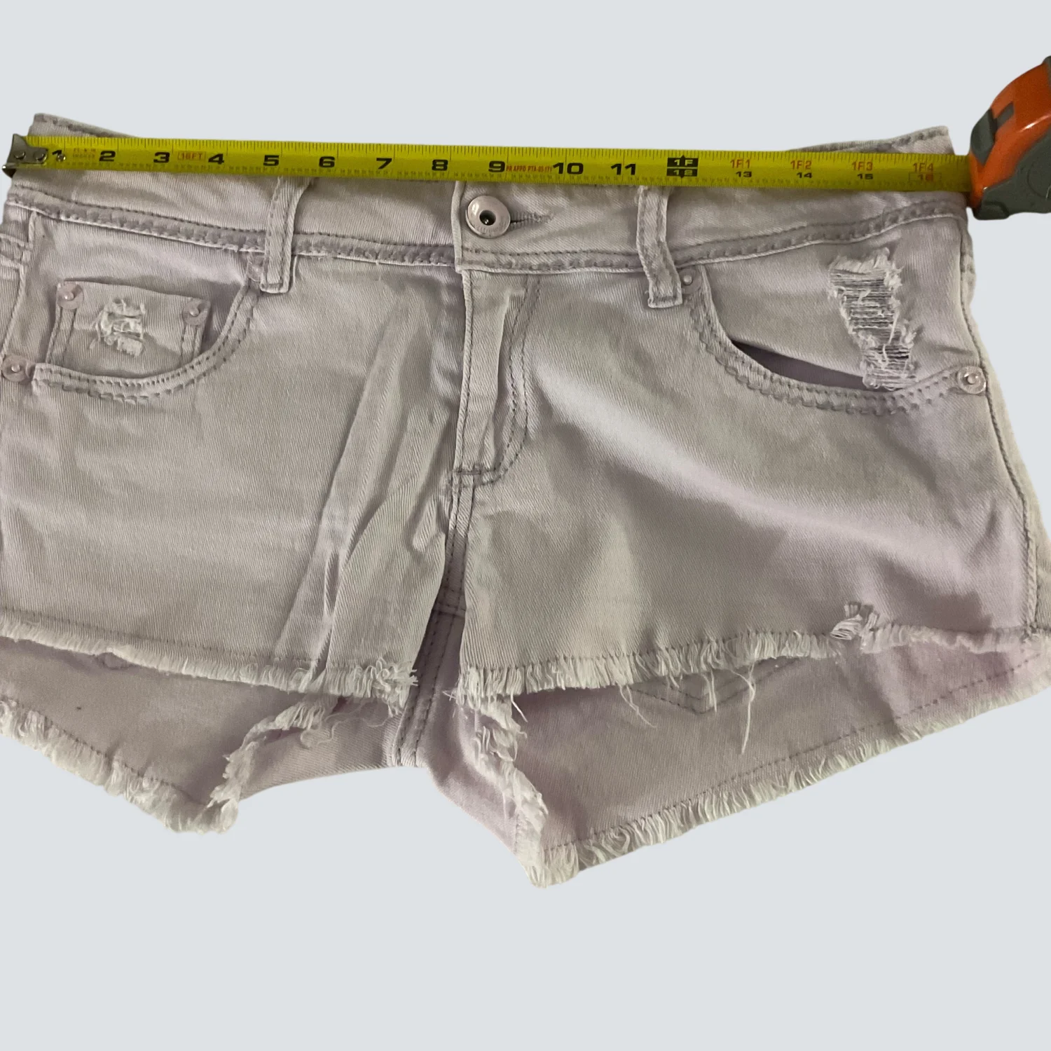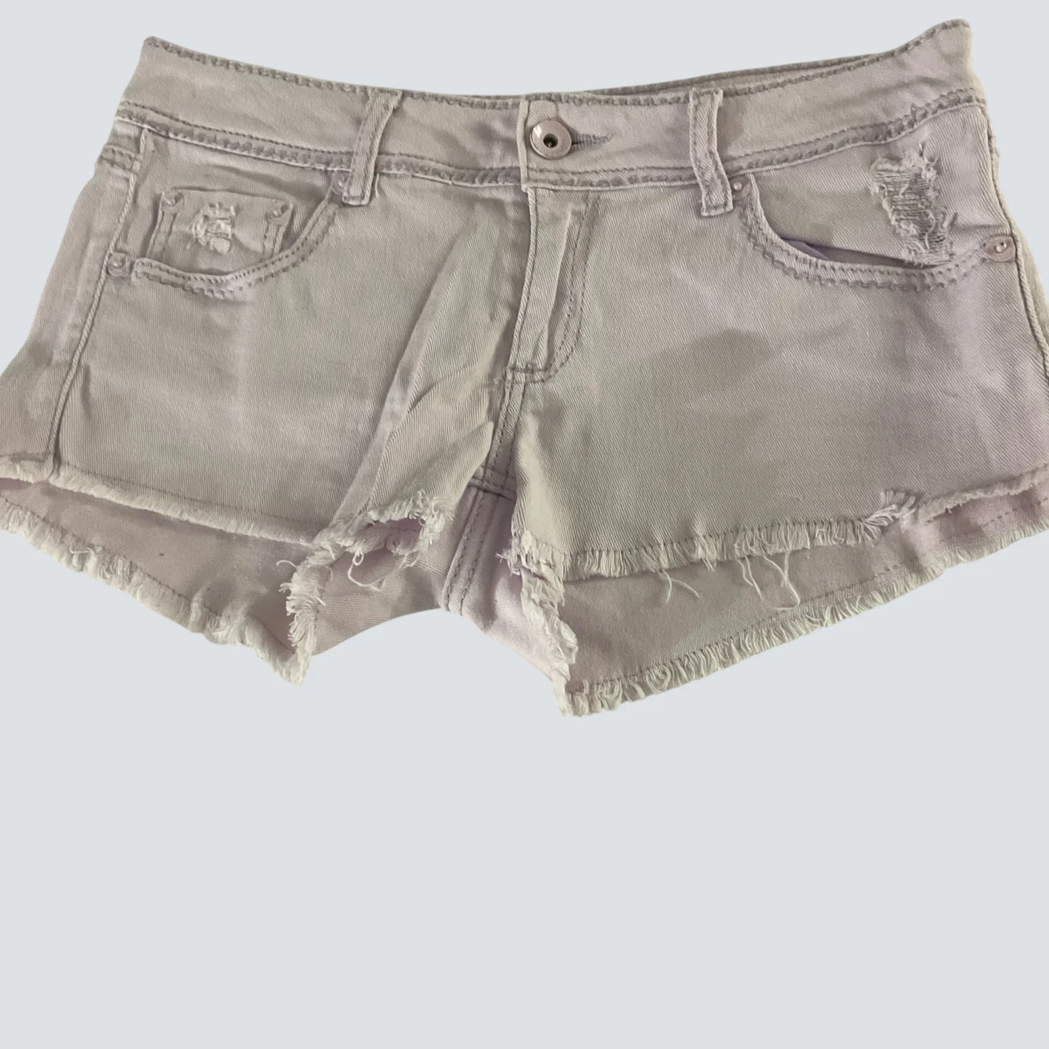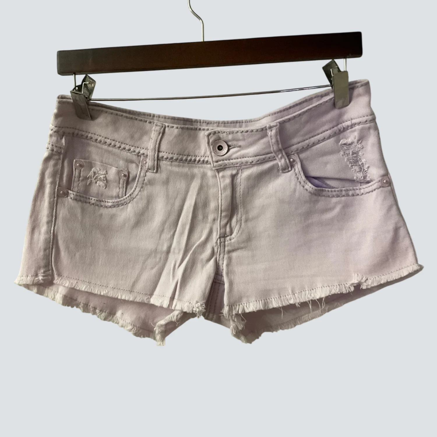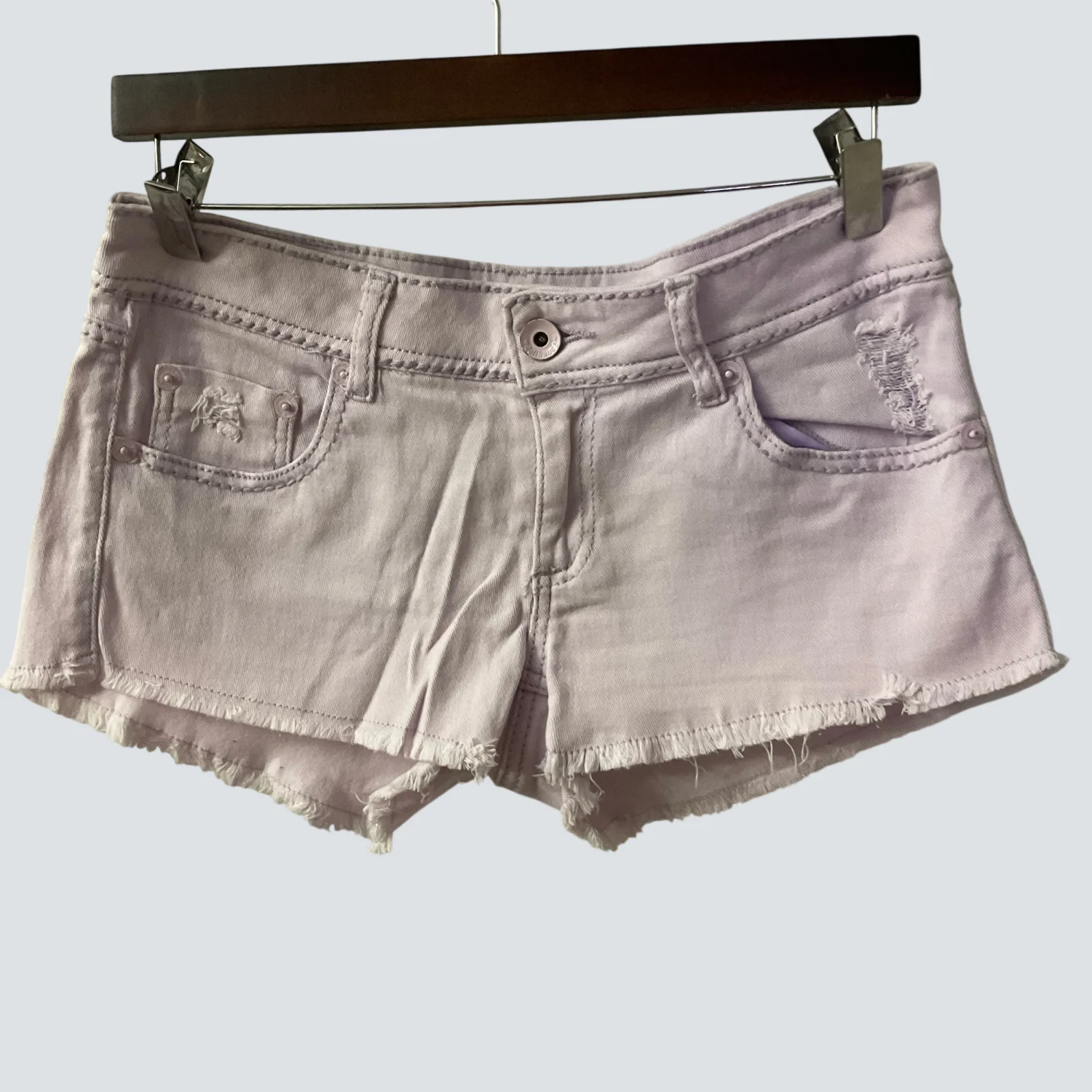 Style: Raw Hem 5 pocket denim shorts Color: Lilac Size: 9 Waist: 17" Rise: 9" Length: 12" Condition: Good 98% Cotton 2% Elastane Machine wash