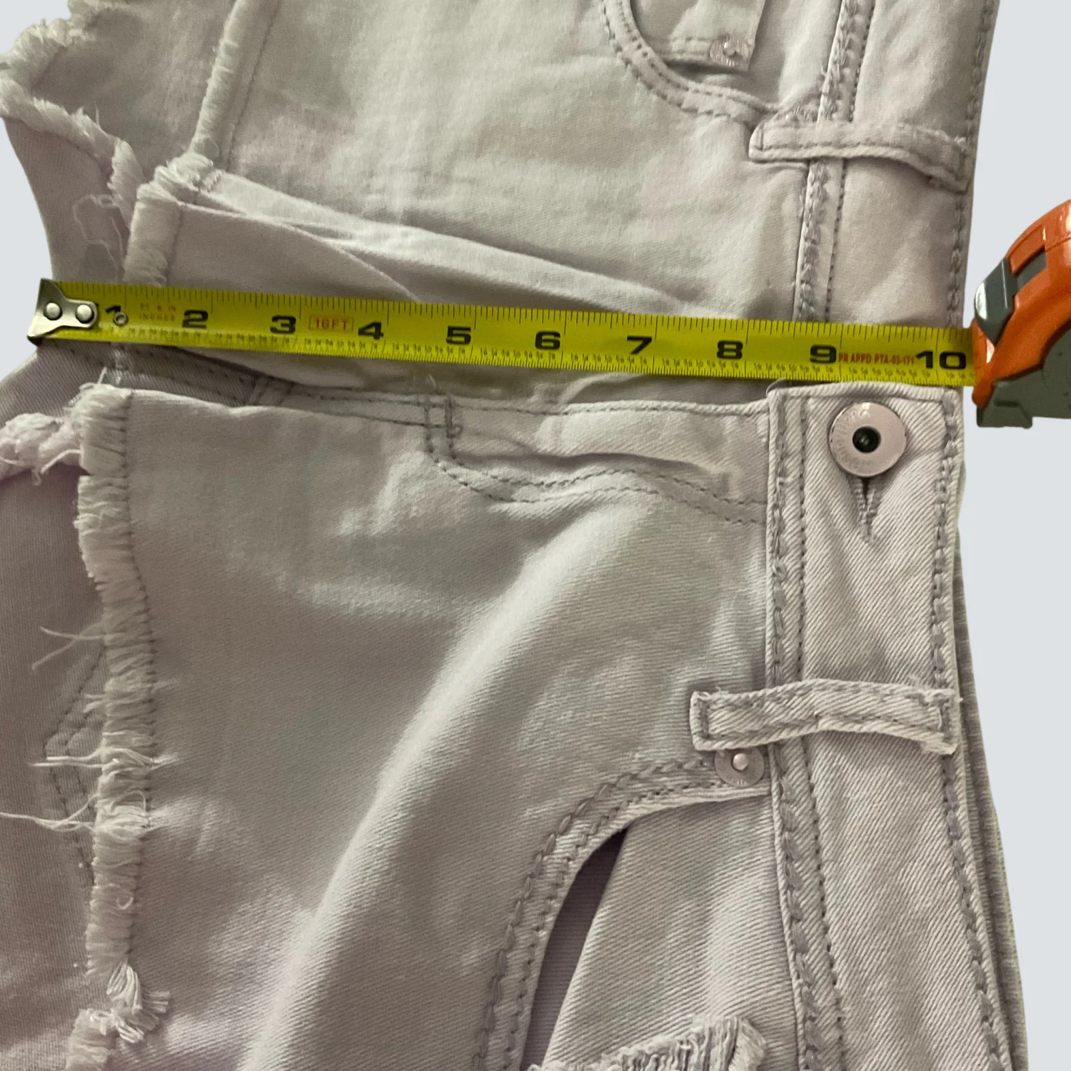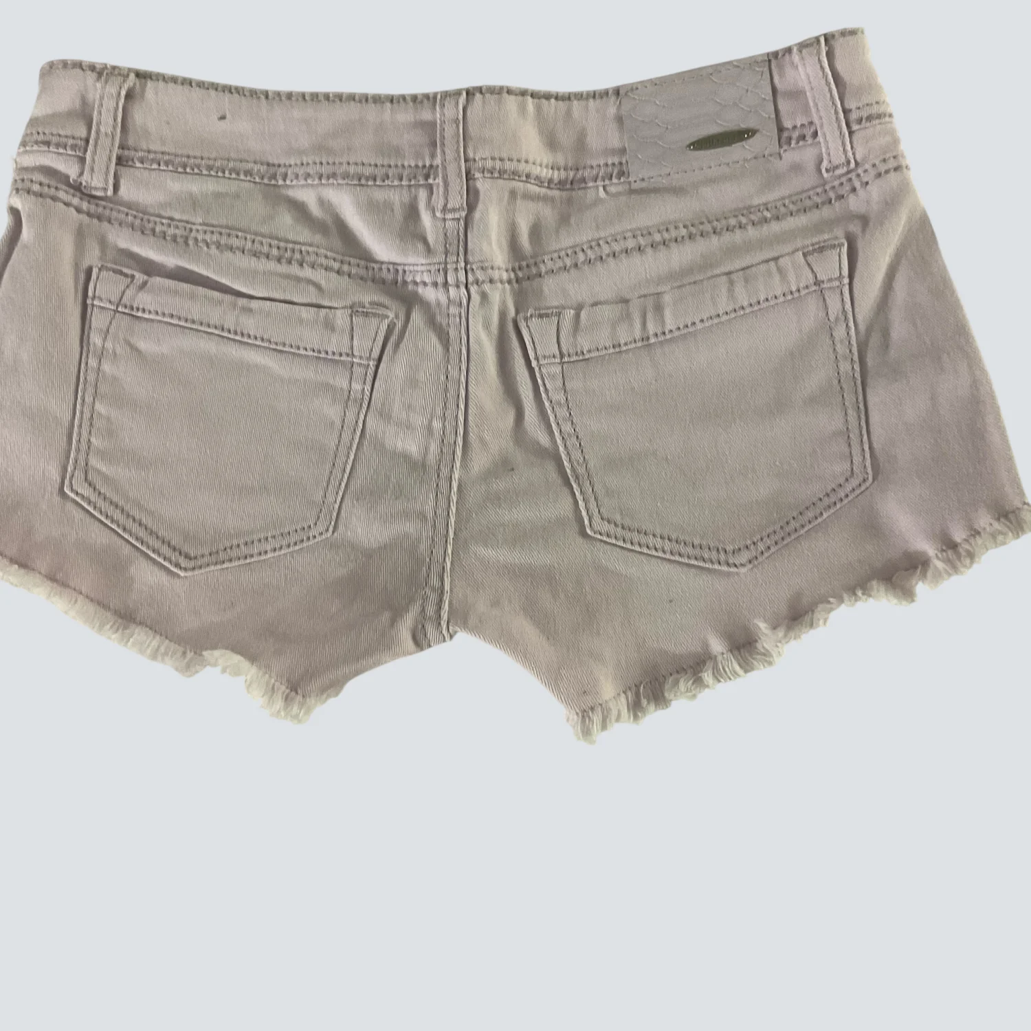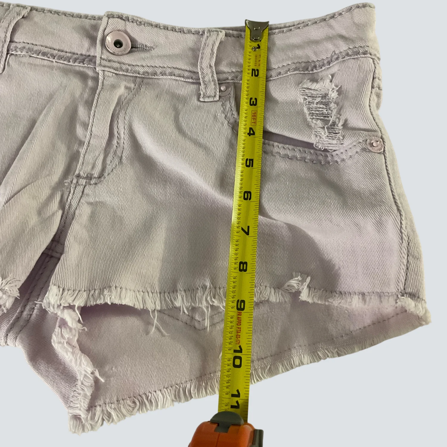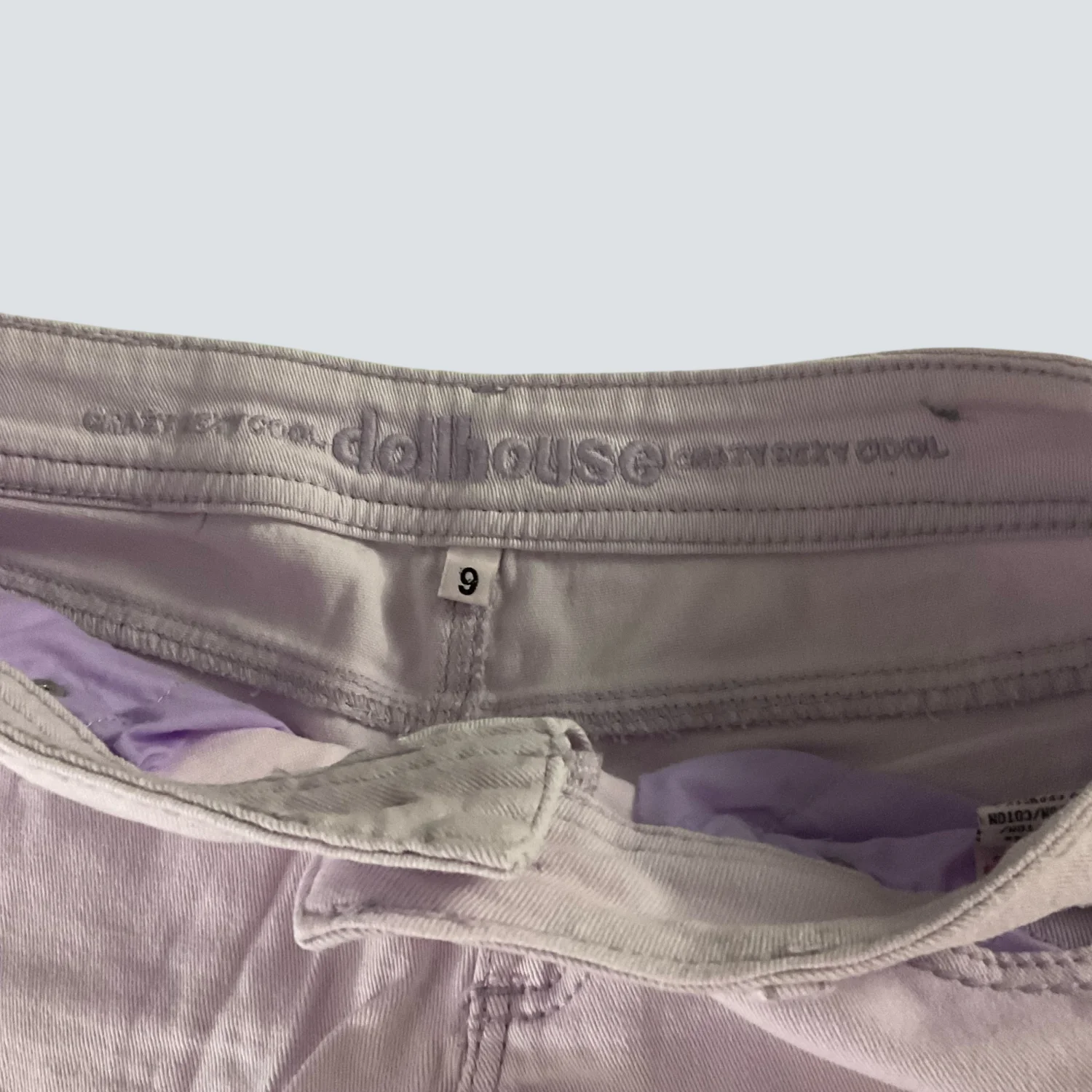 Style: Raw Hem 5 pocket denim shorts Color: Lilac Size: 9 Waist: 17" Rise: 9" Length: 12" Condition: Good 98% Cotton 2% Elastane Machine wash