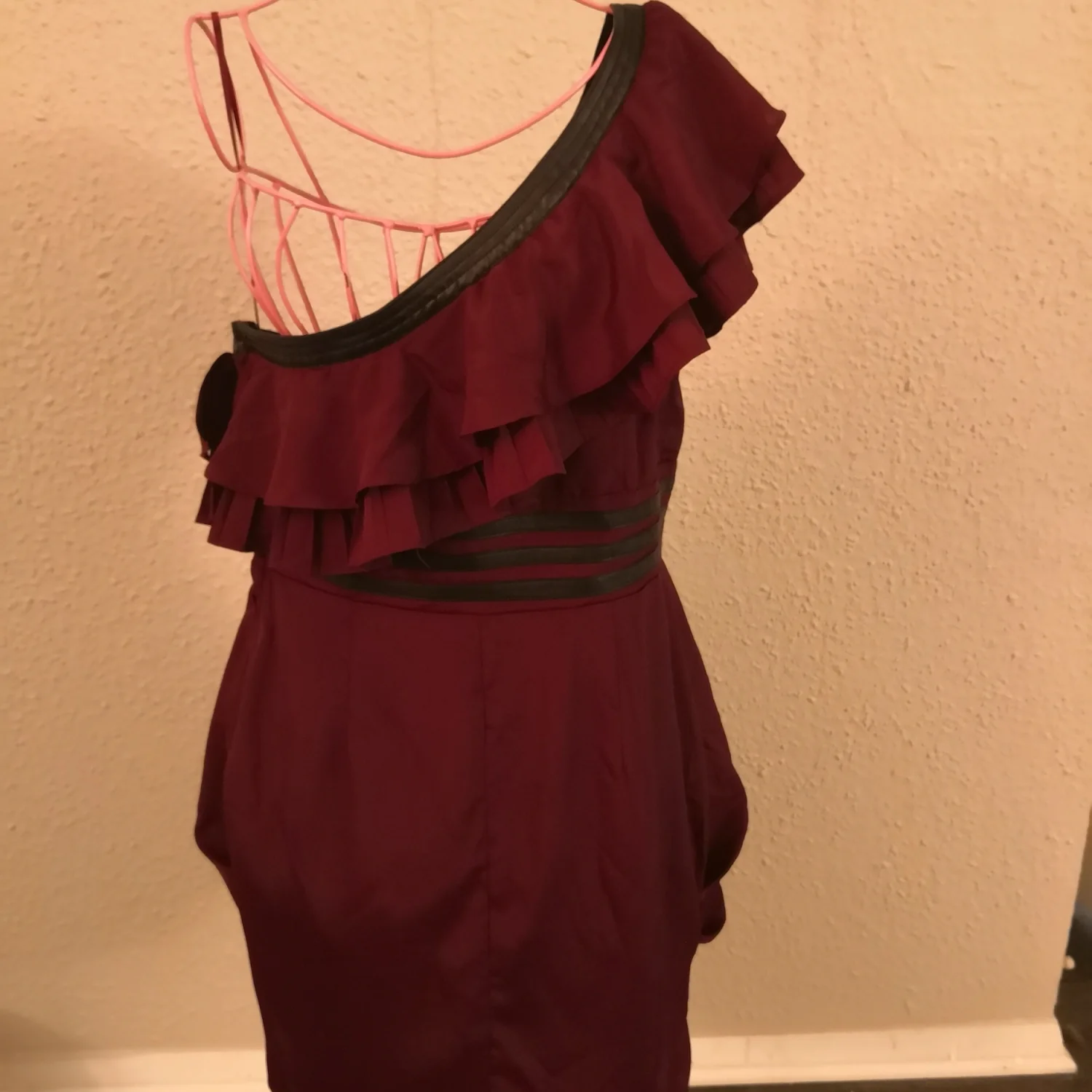 Style: Off shoulder mini dress with triple tier of ruffles across bodice and pleather trim in black Color: Burgundy/Black pleather trim Size: L Armpit: 14" Length 34" Condition: Good