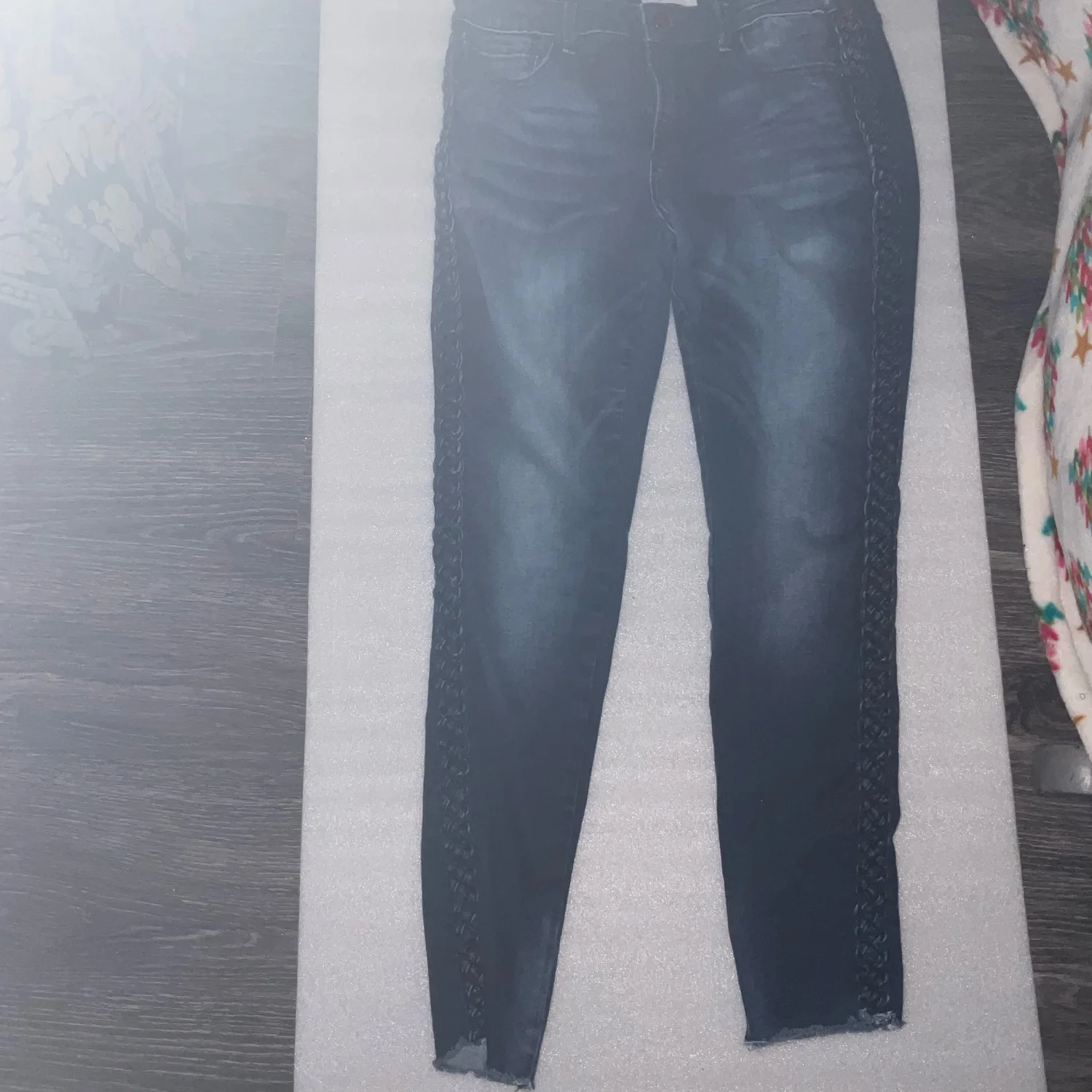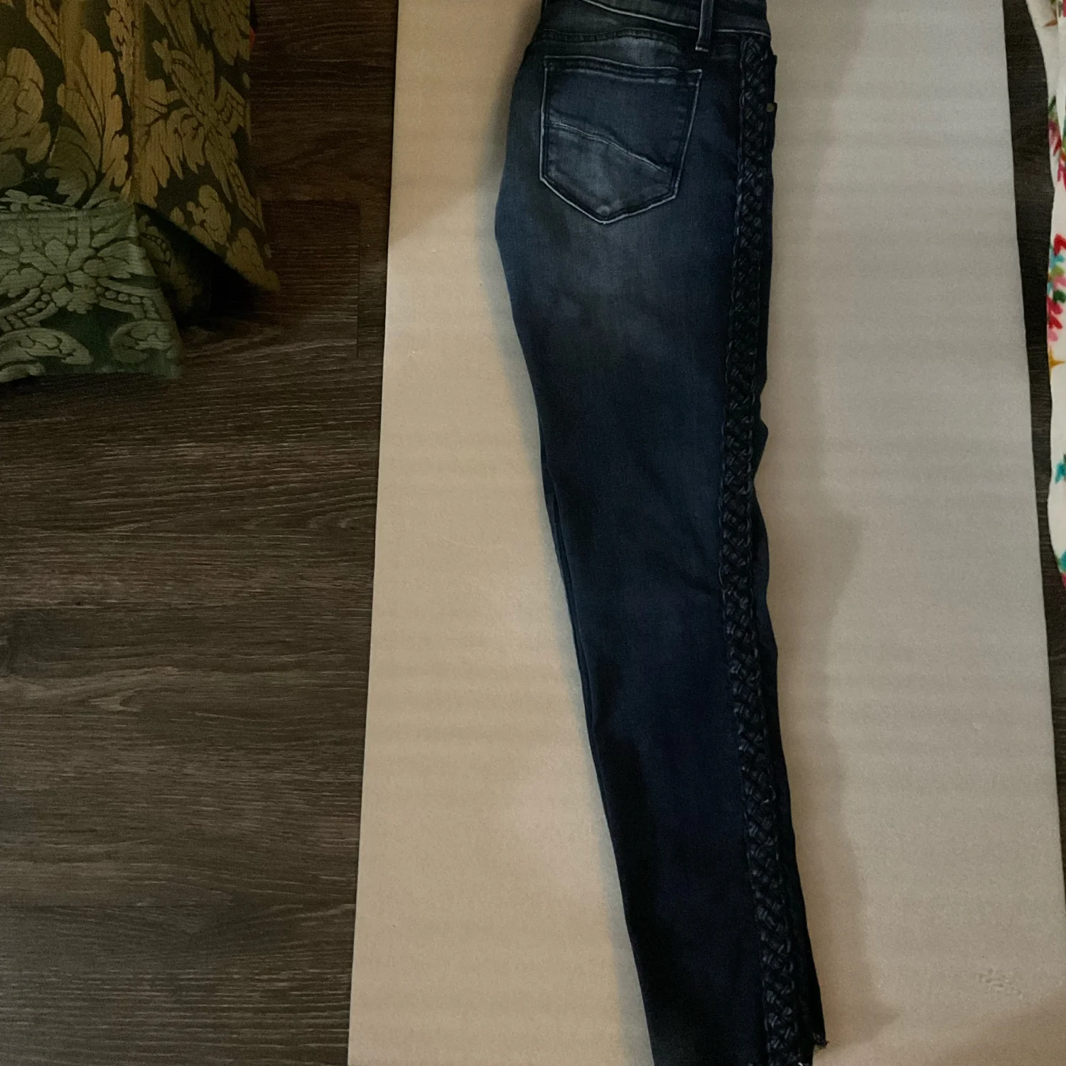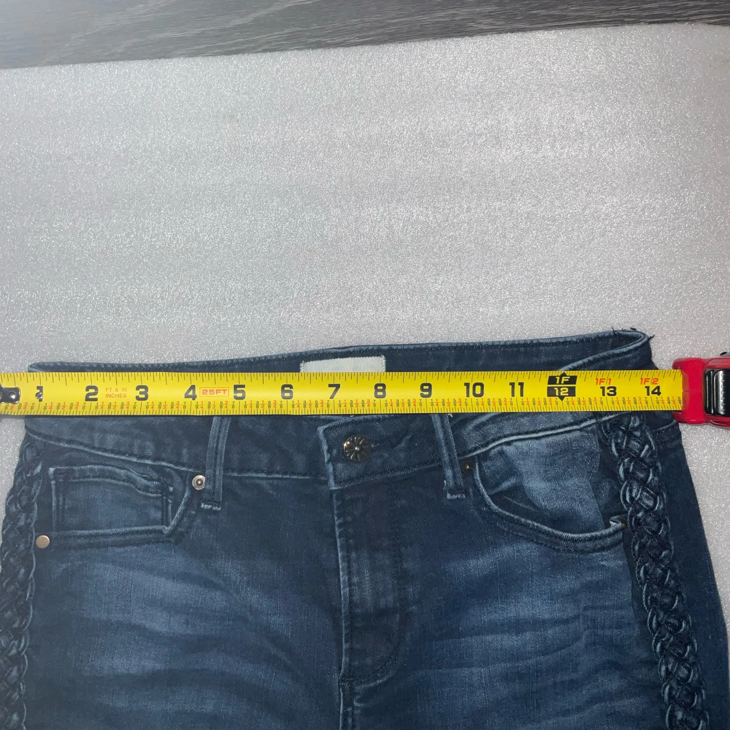 Style: Jackie slim 5 pocket jean with Braidwork down the sides of both pant legs Color: Blue Size: 27 Waist: 14” Rise: 11” Inseam: 26 Condition: Good 89% Cotton 9% Polyester 2% Spandex Machine wash cold