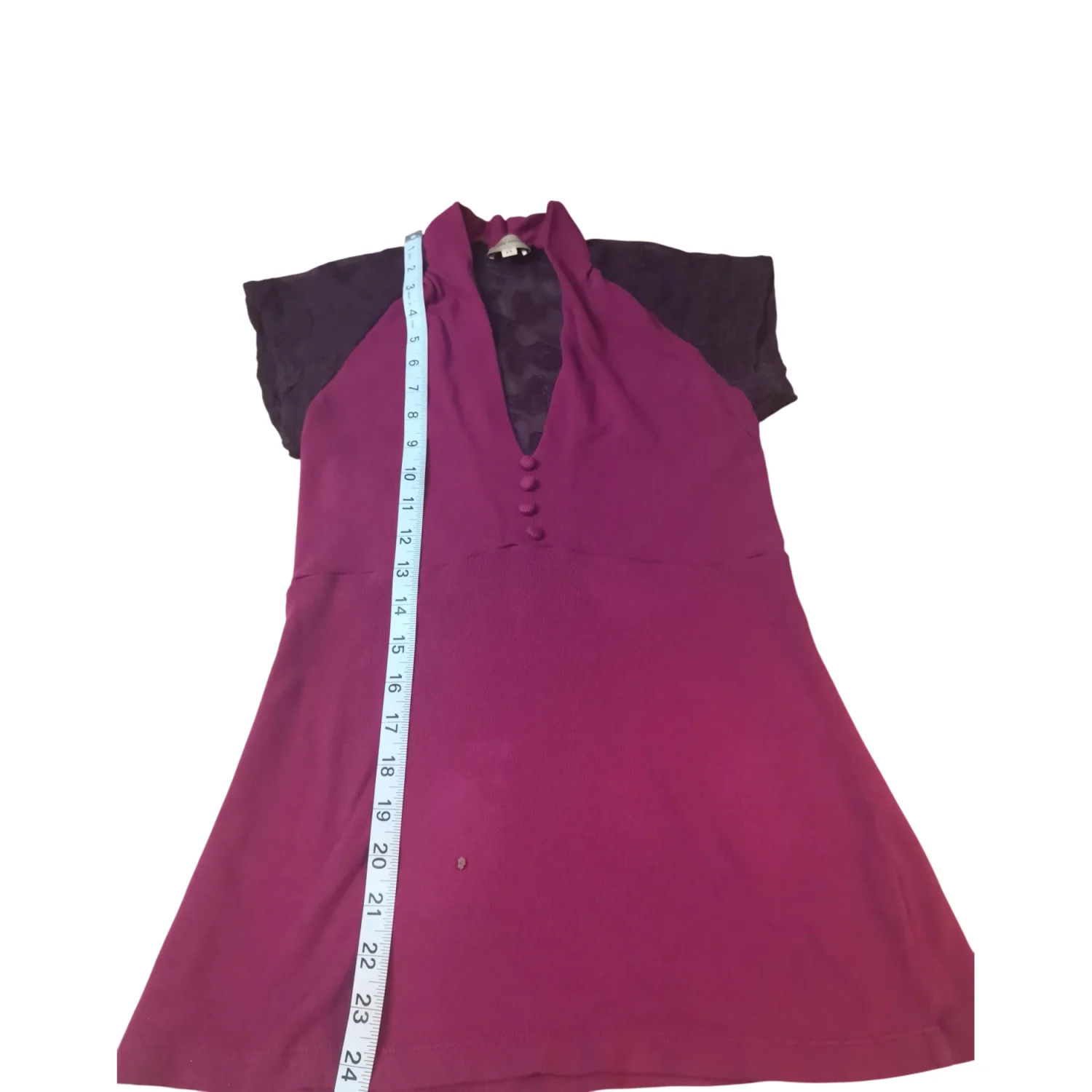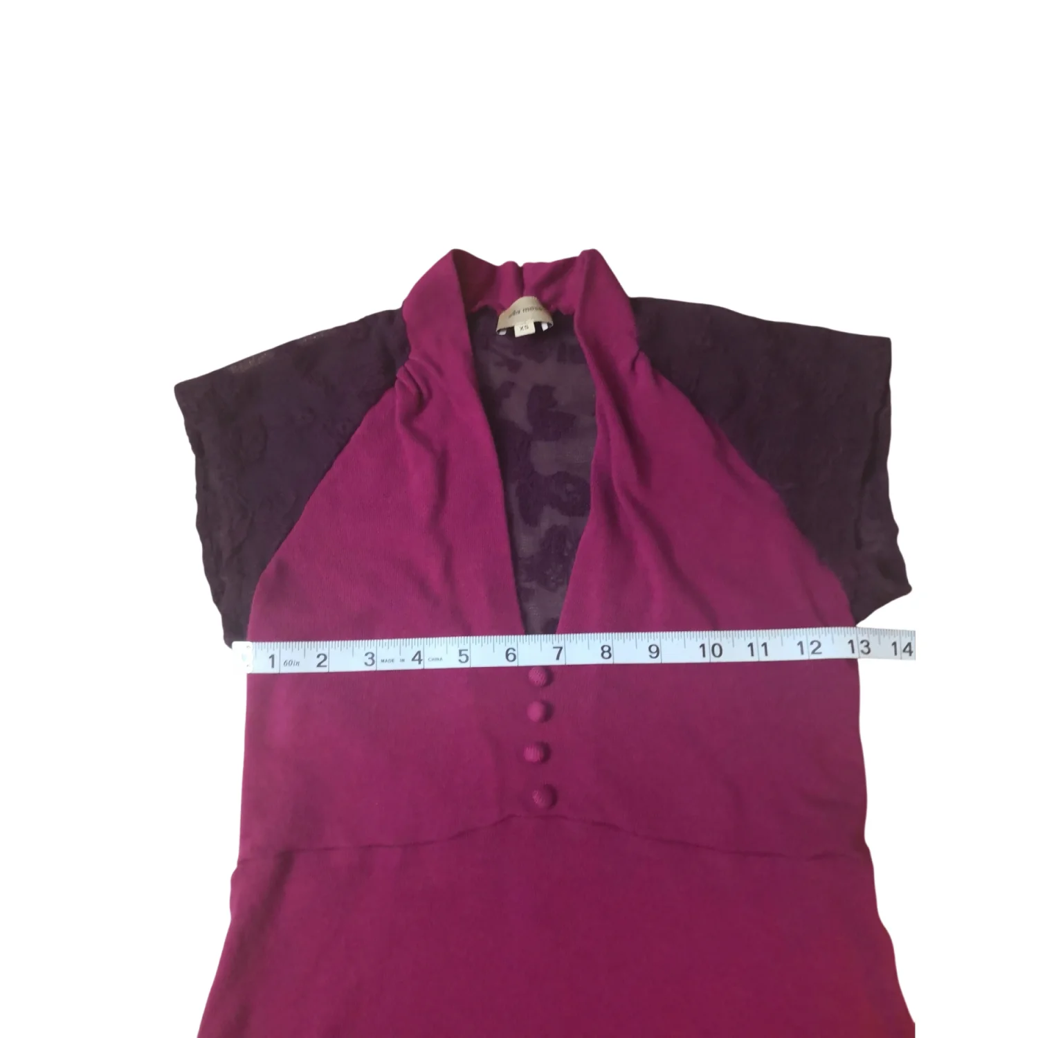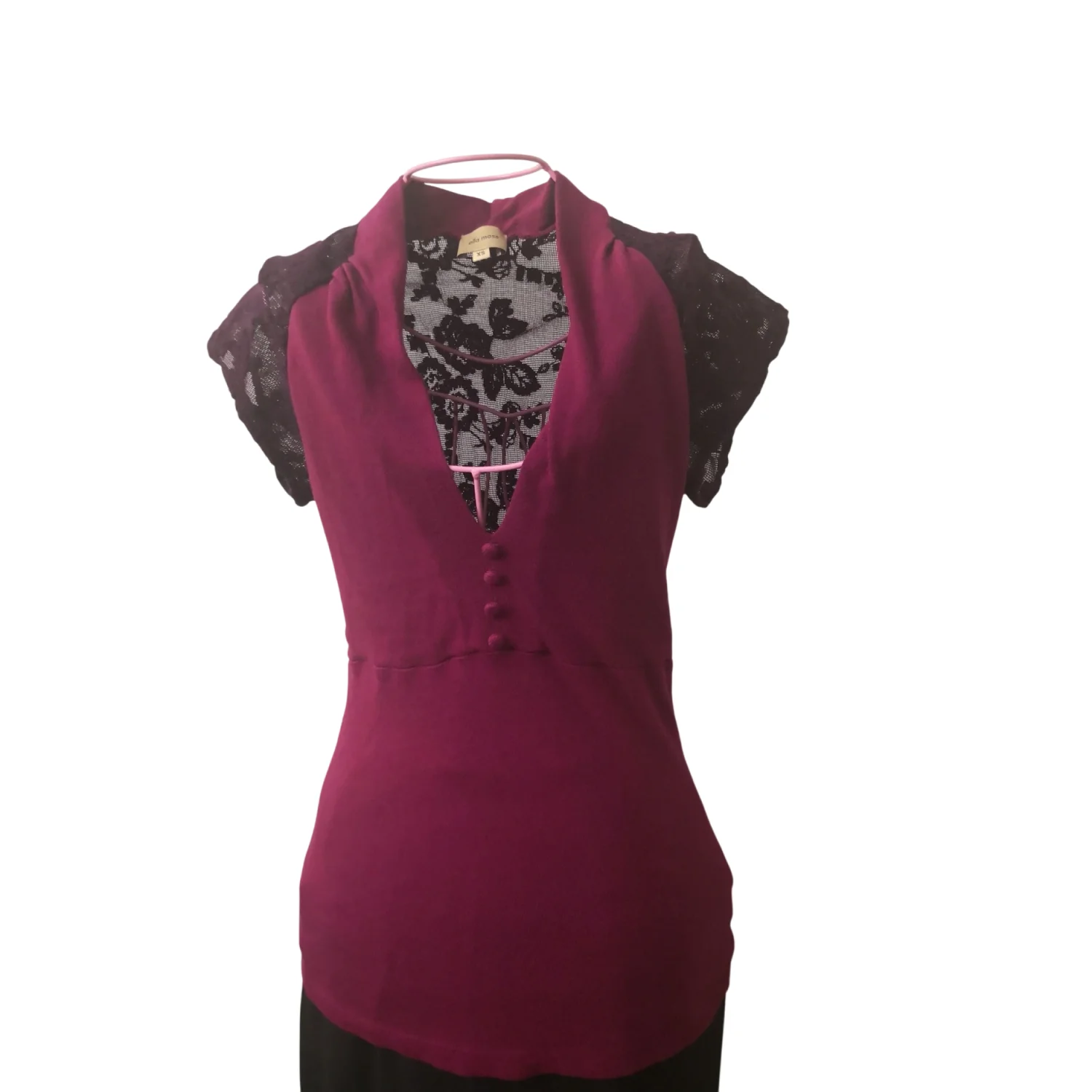 Style: Mock tee features lace sleeves and back and decorative front buttons. Color: Maroon/Purple Size XS Armpit: 14” Length: 25” Good Condition 50% Pima Cotton 50% Modal Rayon Machine wash.cold