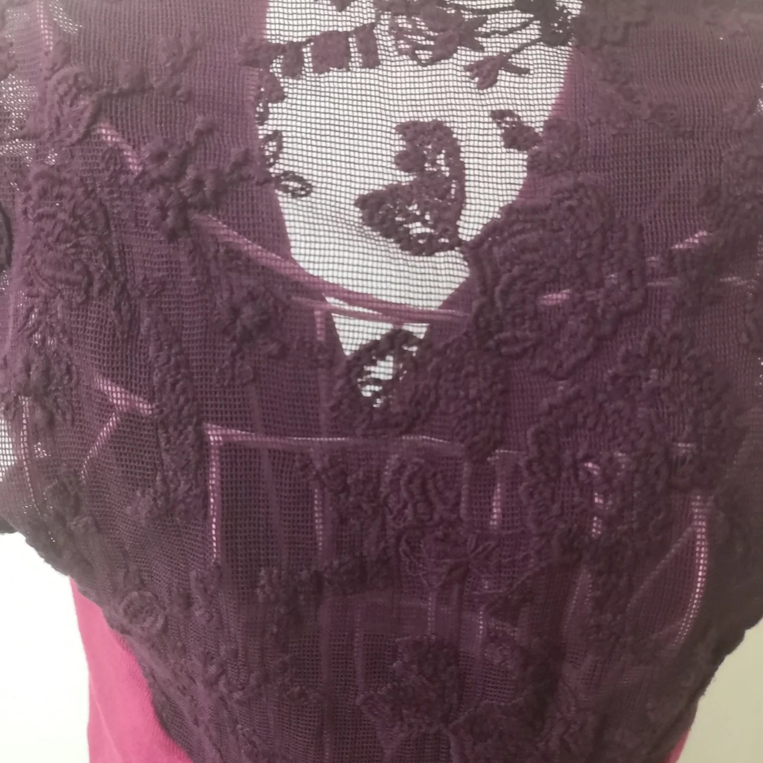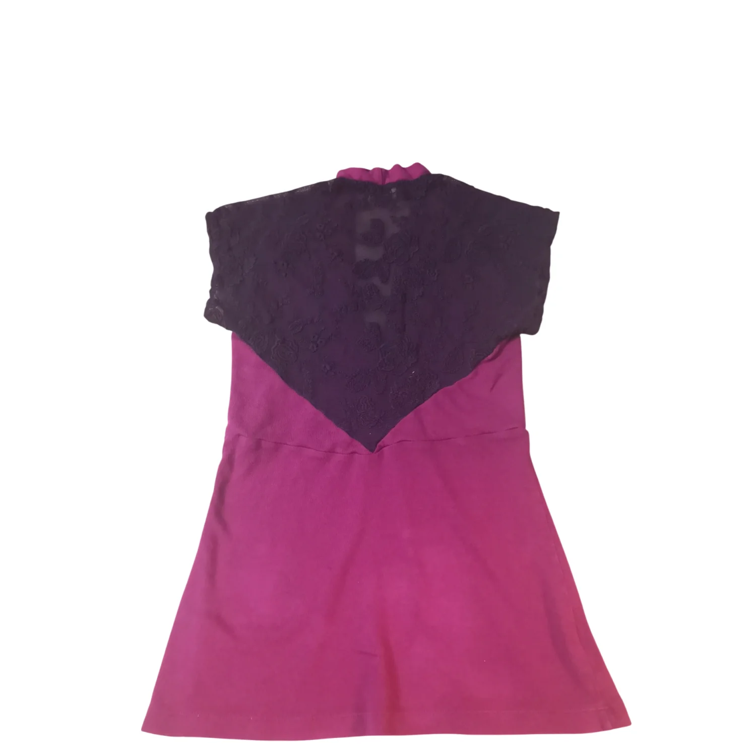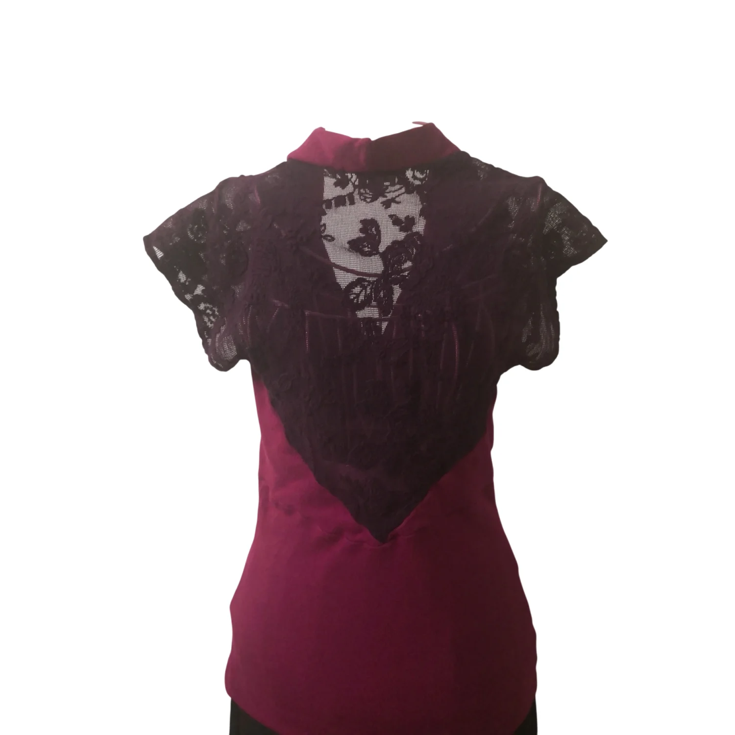Style: Mock tee features lace sleeves and back and decorative front buttons. Color: Maroon/Purple Size XS Armpit: 14” Length: 25” Good Condition 50% Pima Cotton 50% Modal Rayon Machine wash.cold