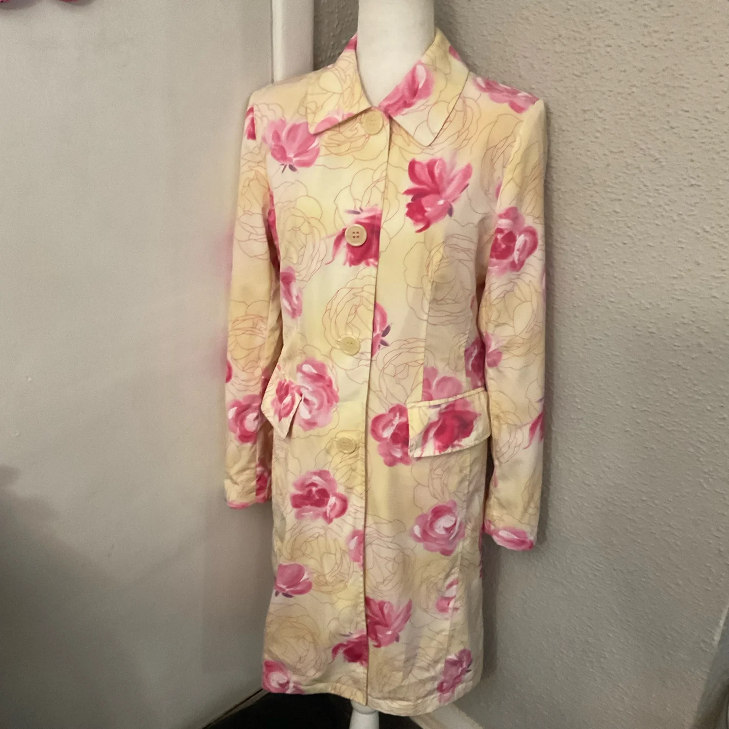 Style: Rain coat with button front closure, pockets and kick pleat on back Color: Yellow/ Pink Size: S Armpit: 18" Condition: Contains slight staining on inside collar and back tabs/flaps need to be sewn down