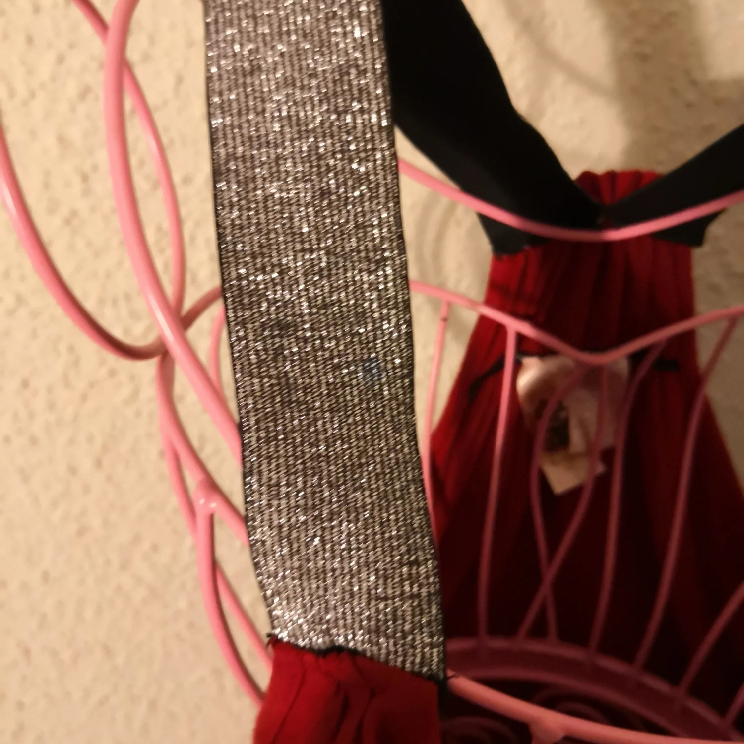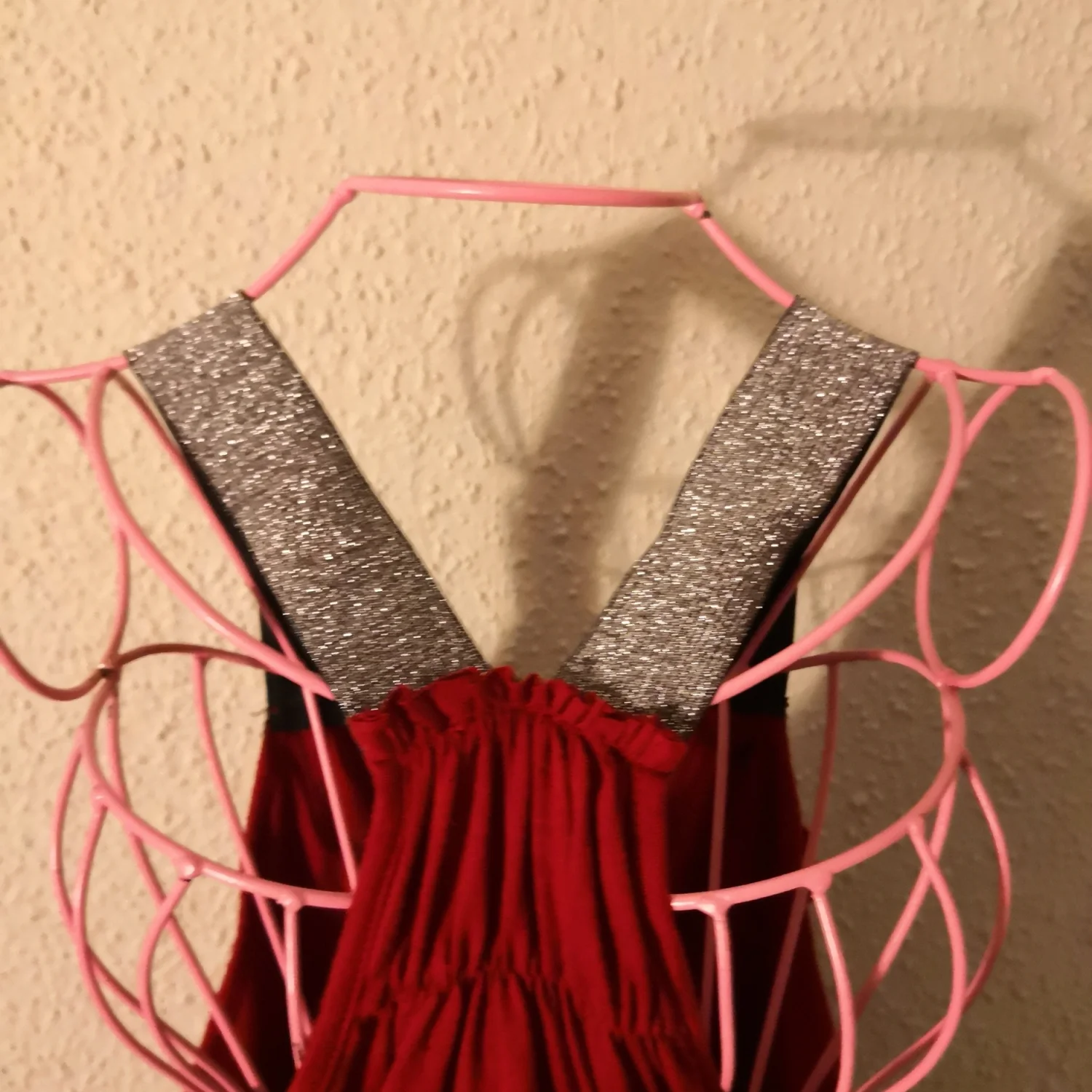 Style: Waterfall bodice with silver Glitter Racerback Strap VP55AOTTA2, T shirt type material Color: Red/Silver Size: L Armpit-15" Waist-16" Length-35" Condition: Good 60% Polyester 35% Rayon 5% Spandex Machine wash cold