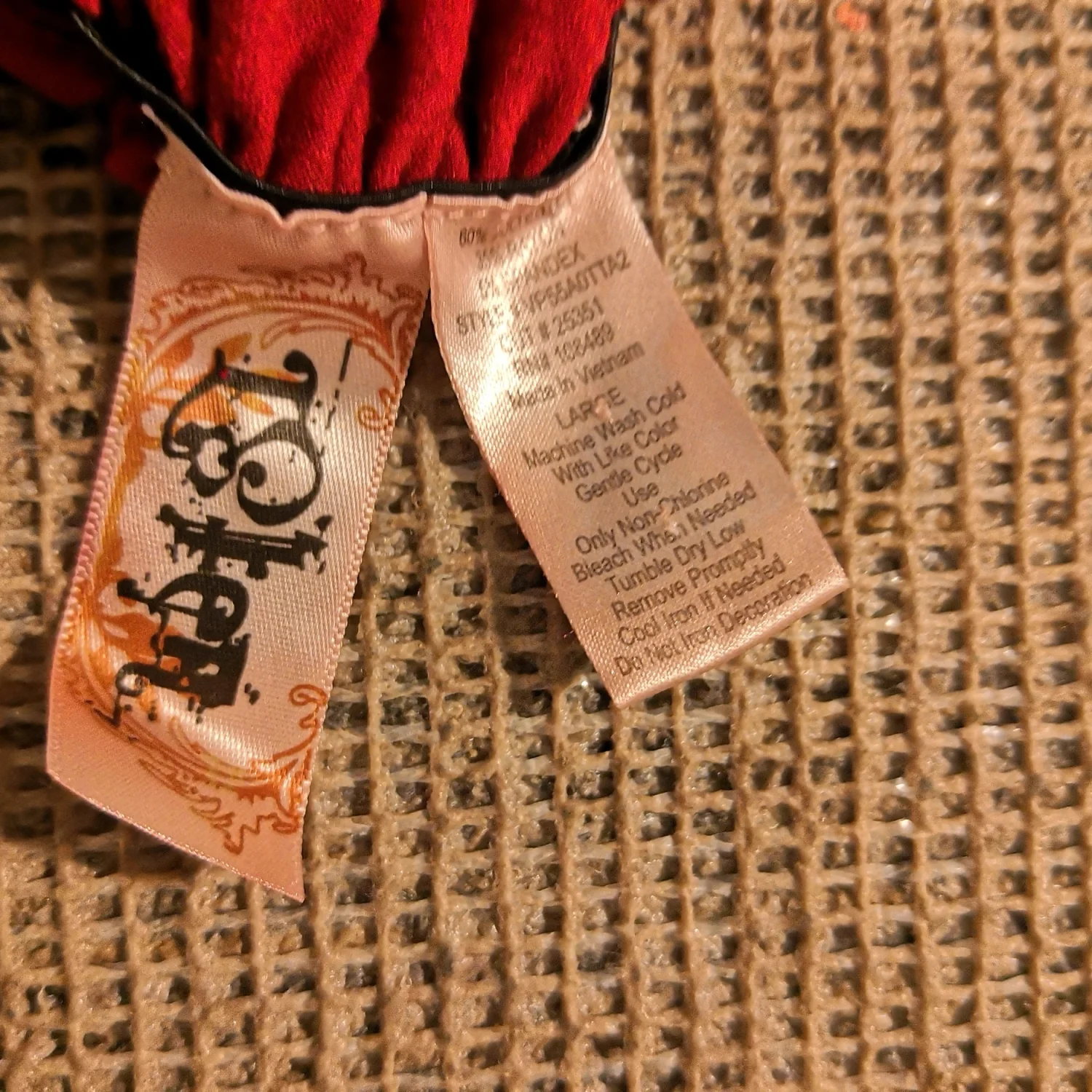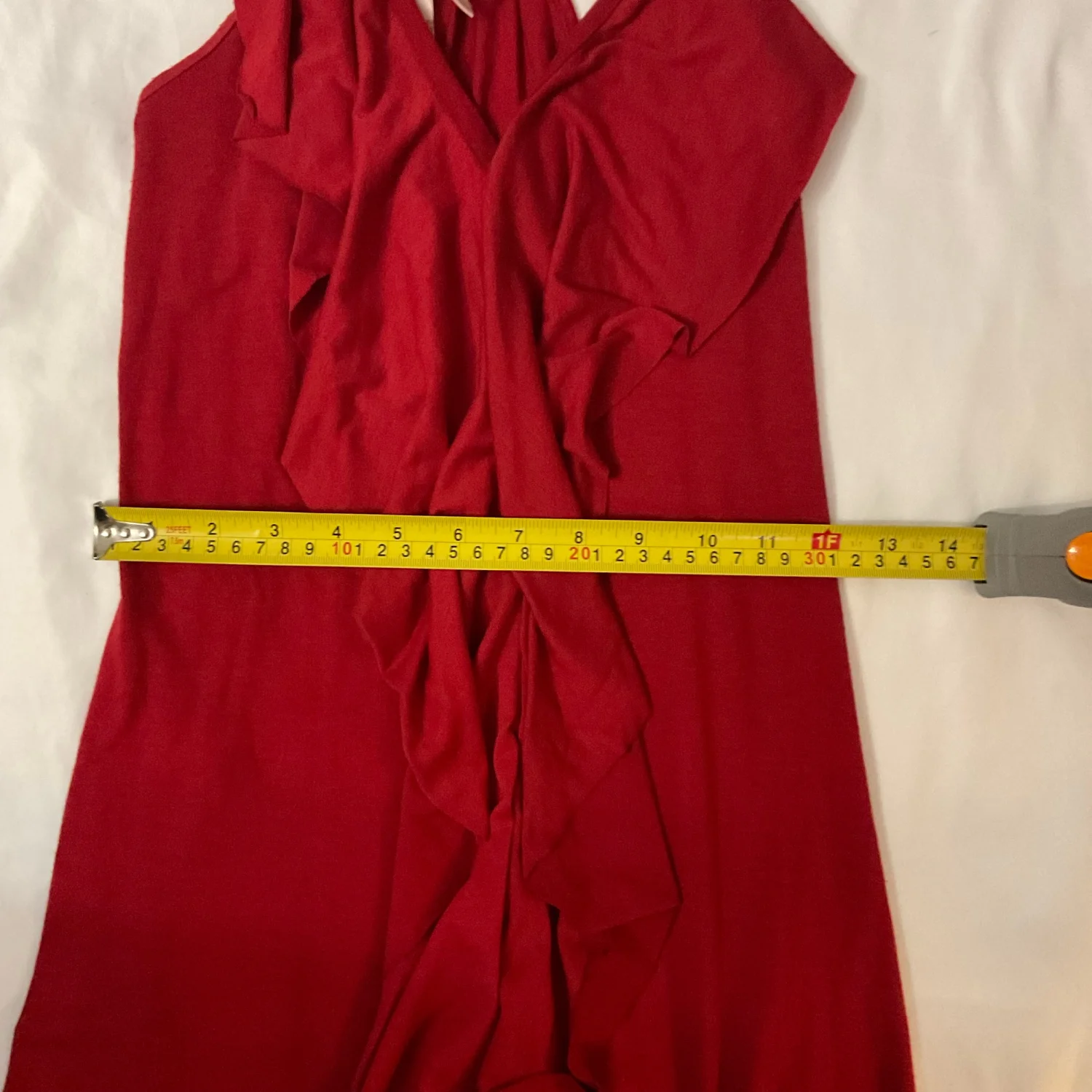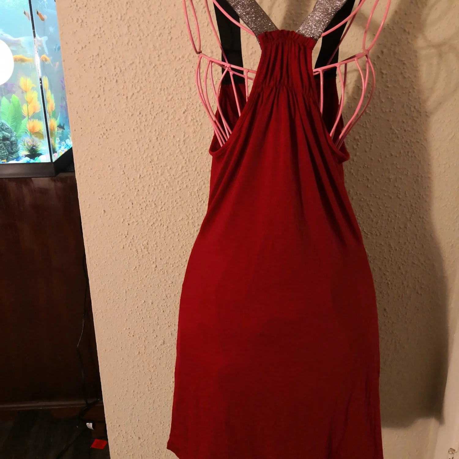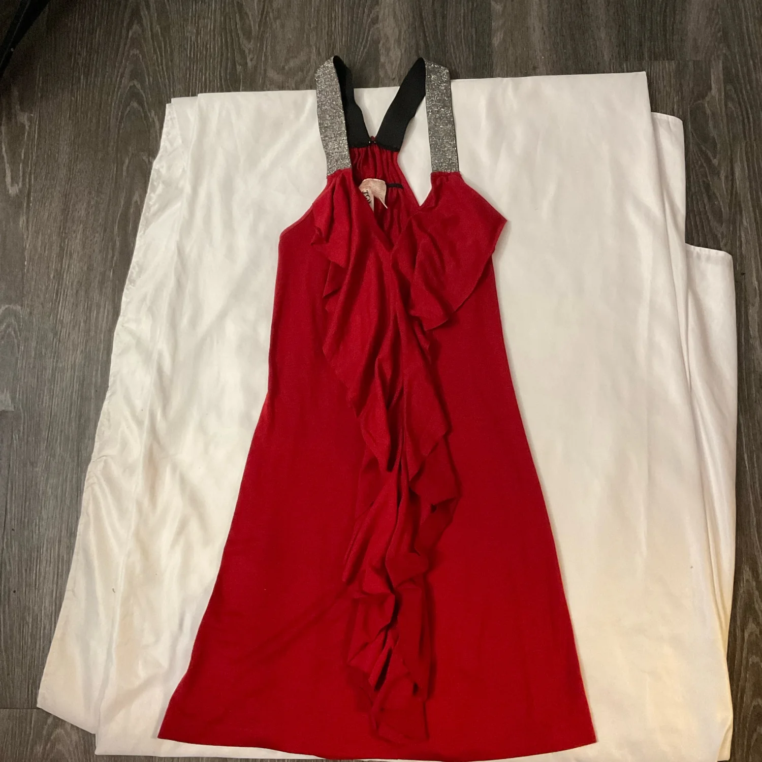 Style: Waterfall bodice with silver Glitter Racerback Strap VP55AOTTA2, T shirt type material Color: Red/Silver Size: L Armpit-15" Waist-16" Length-35" Condition: Good 60% Polyester 35% Rayon 5% Spandex Machine wash cold