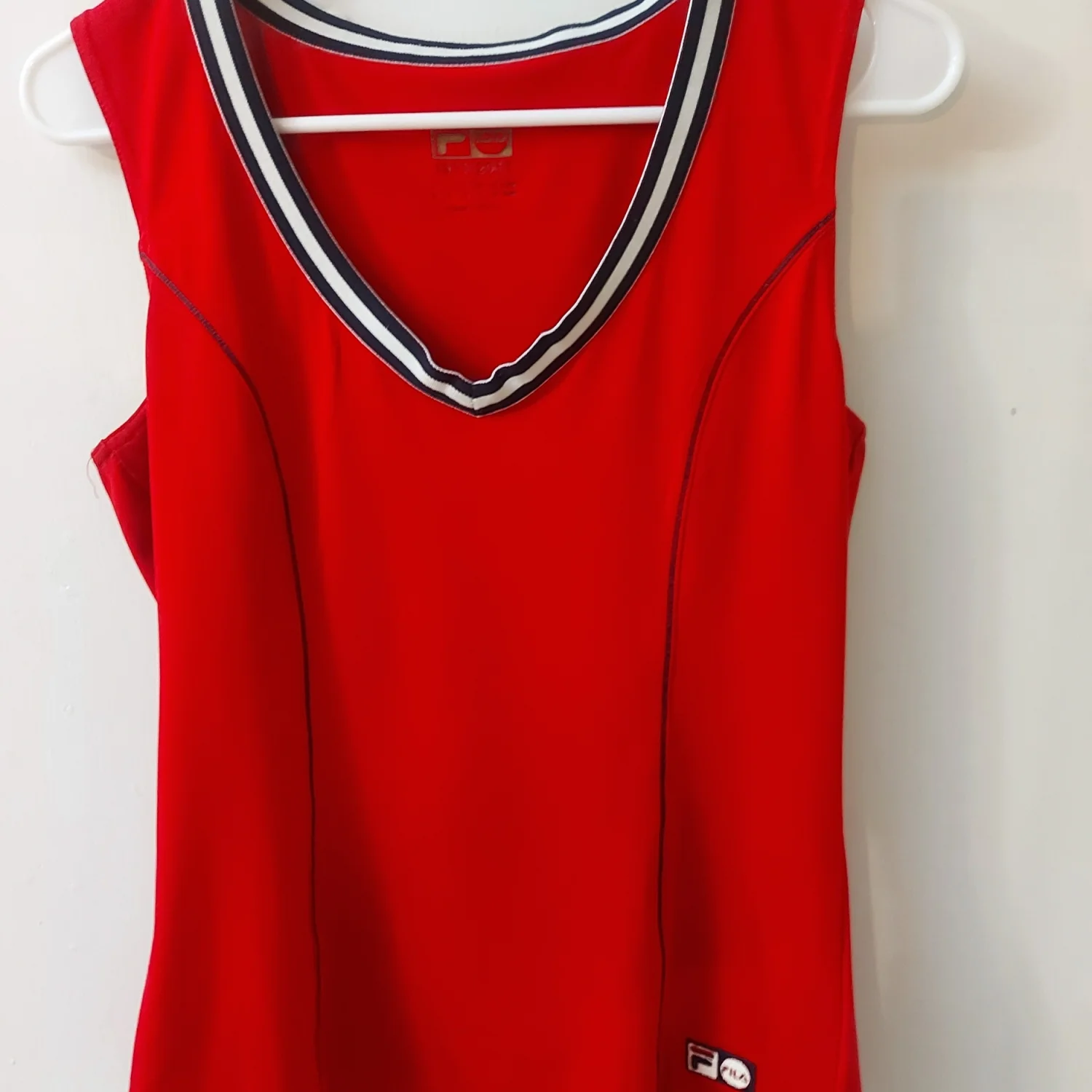 Style: FILA pullover tank Color: Red/White/Blue Size: M Armpit: 17” Length: 23” Condition: Good 88% Polyester 12% Spandex Machine wash cold