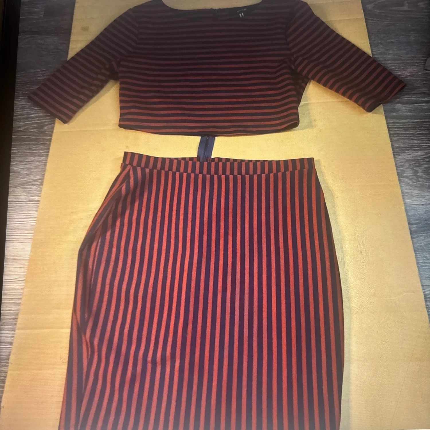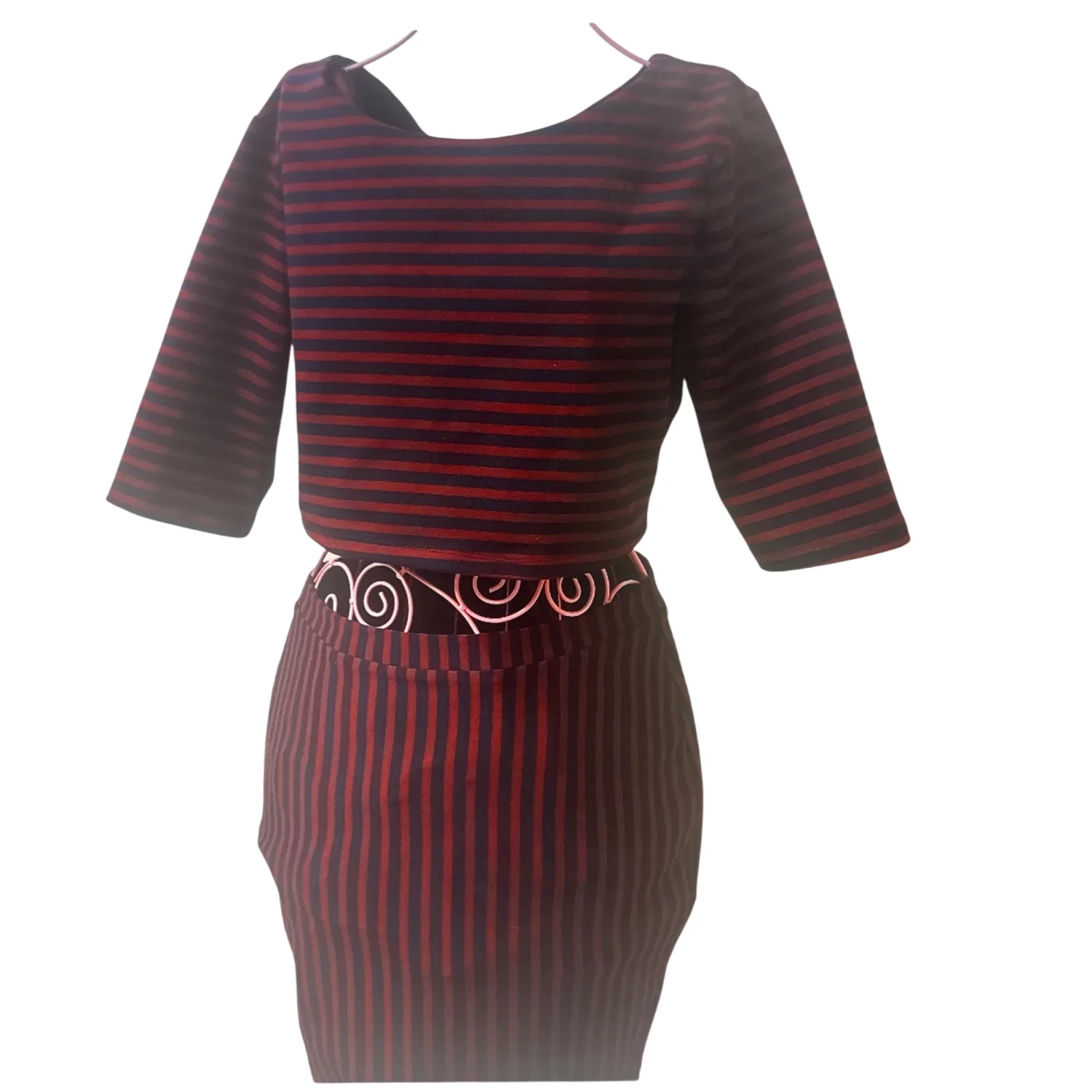 Style: Striped dress with Open Midriff, Cut out front and back Color: Maroon/Navy Size: M Armpit: 16” Waist: 14” Length: 13” (Top) 18” (Bottom) Condition: Good preowned 76% Polyester 20% Rayon 4 % Spandex Hand wash cold