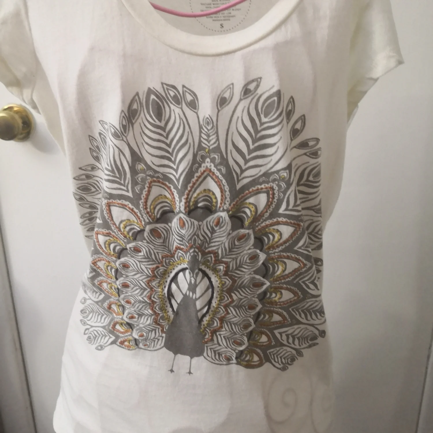 Style: Short sleeve tee with printed peacock design on front Color: White/Beige/Gray Size: S Armpit: 17” Length: 24” Condition: Good 60% Cotton 40% Polyester Machine wash cold