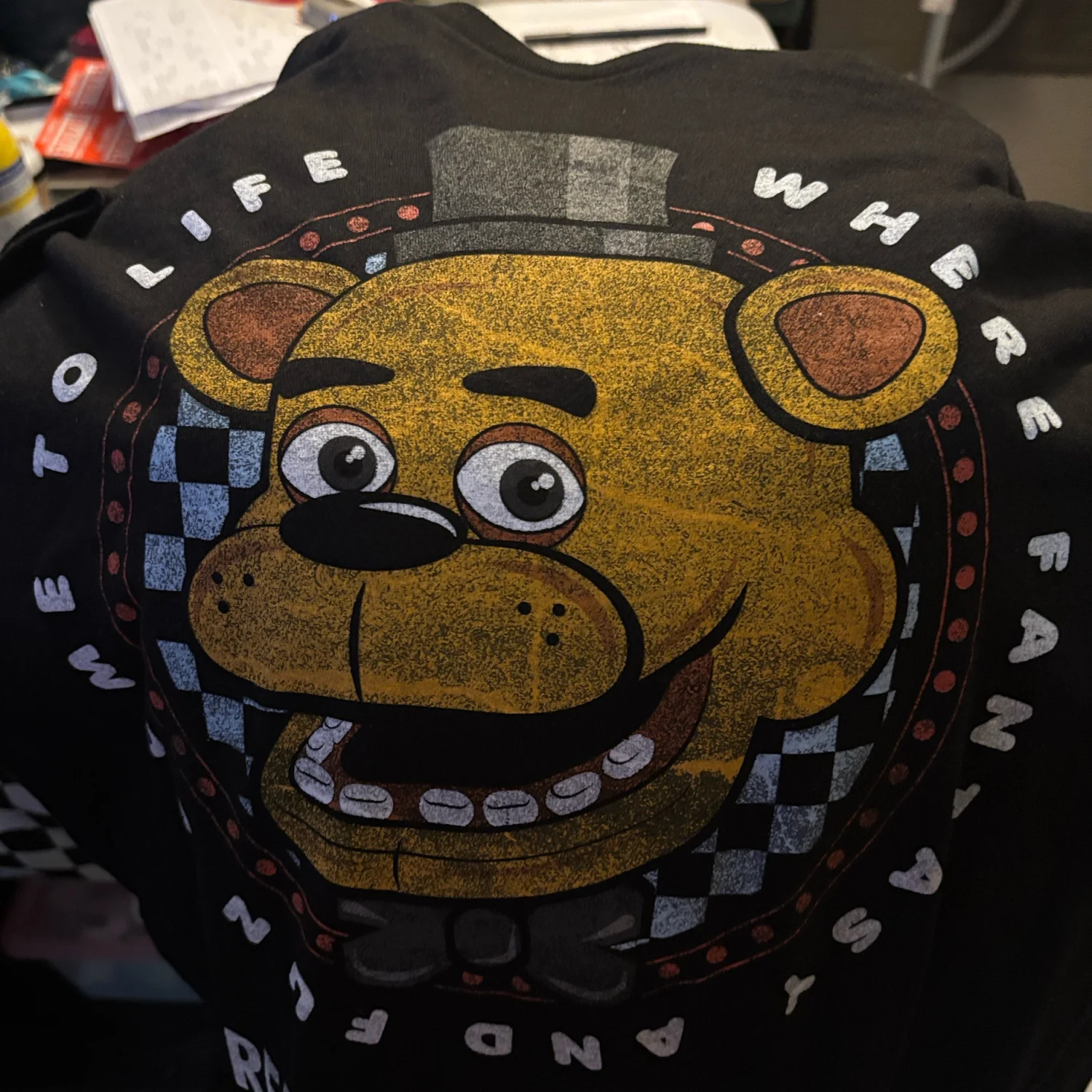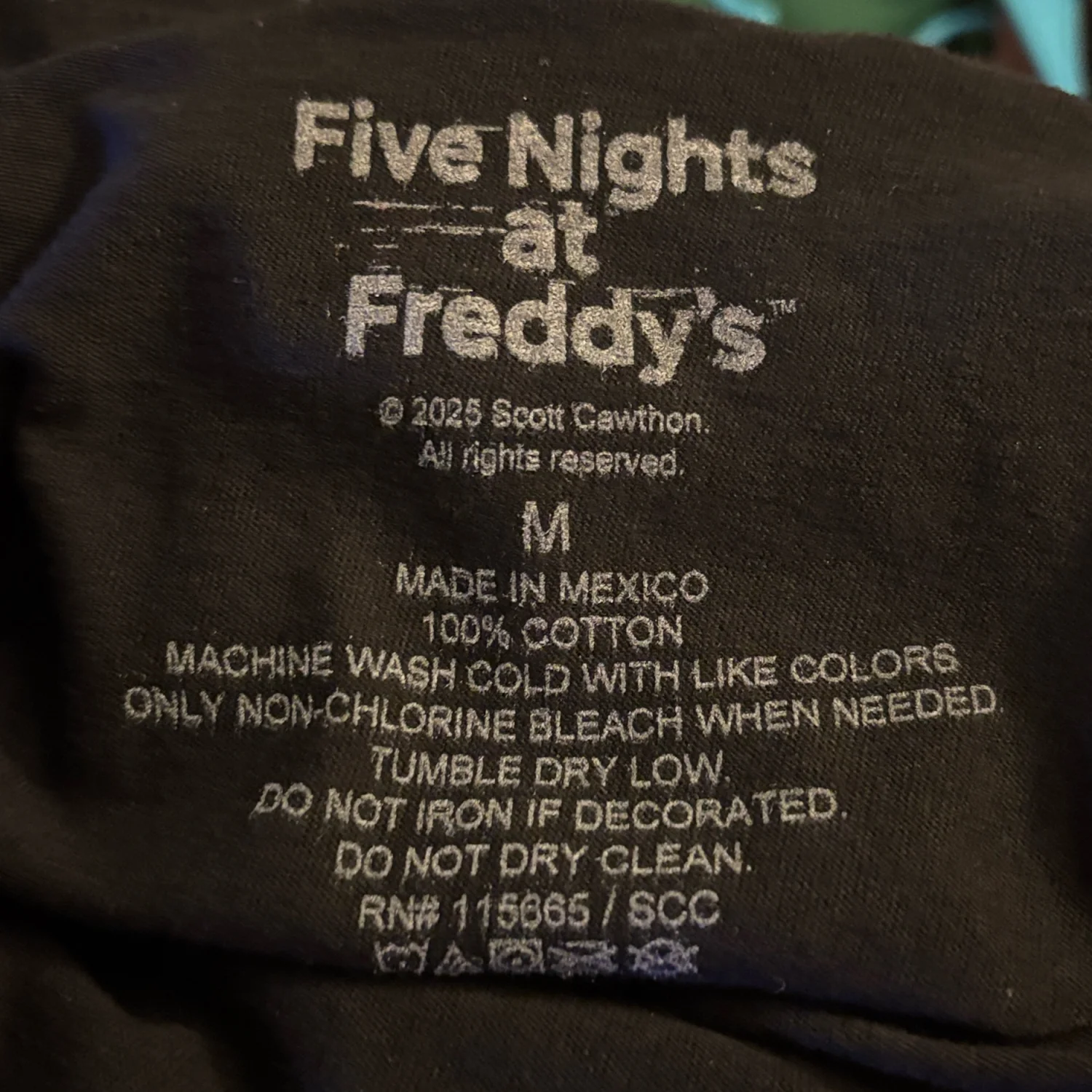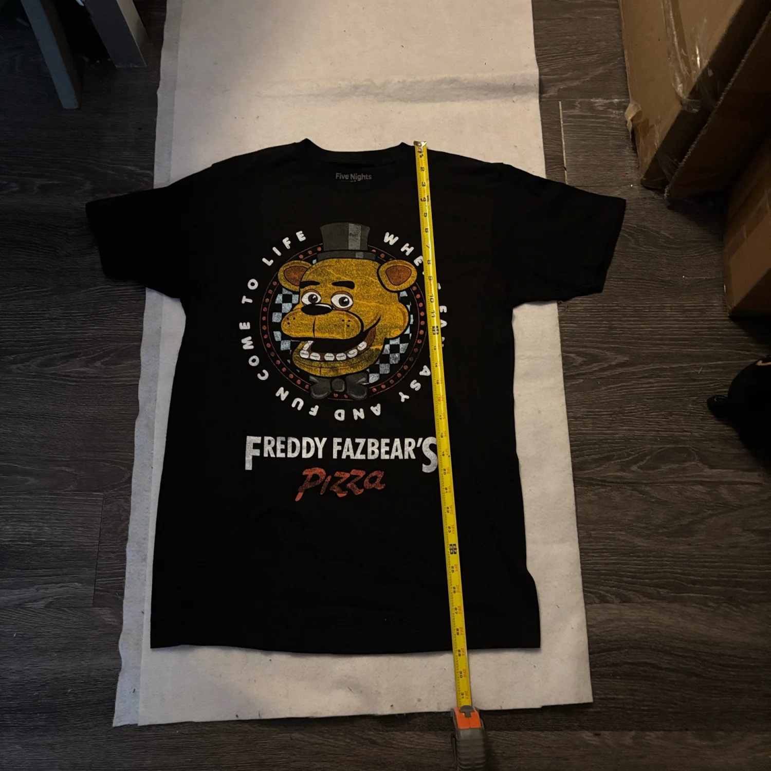 Style: Black graphic tee featuring Freddy Fazbear character and logo. Colorful printed design with yellow bear face and red text. Soft cotton look. Great for fans of the game. Color: Black/ Yellow Size: M Armpit: 19" Length: 29" Condition: New without tags 100% Cotton Machine wash cold