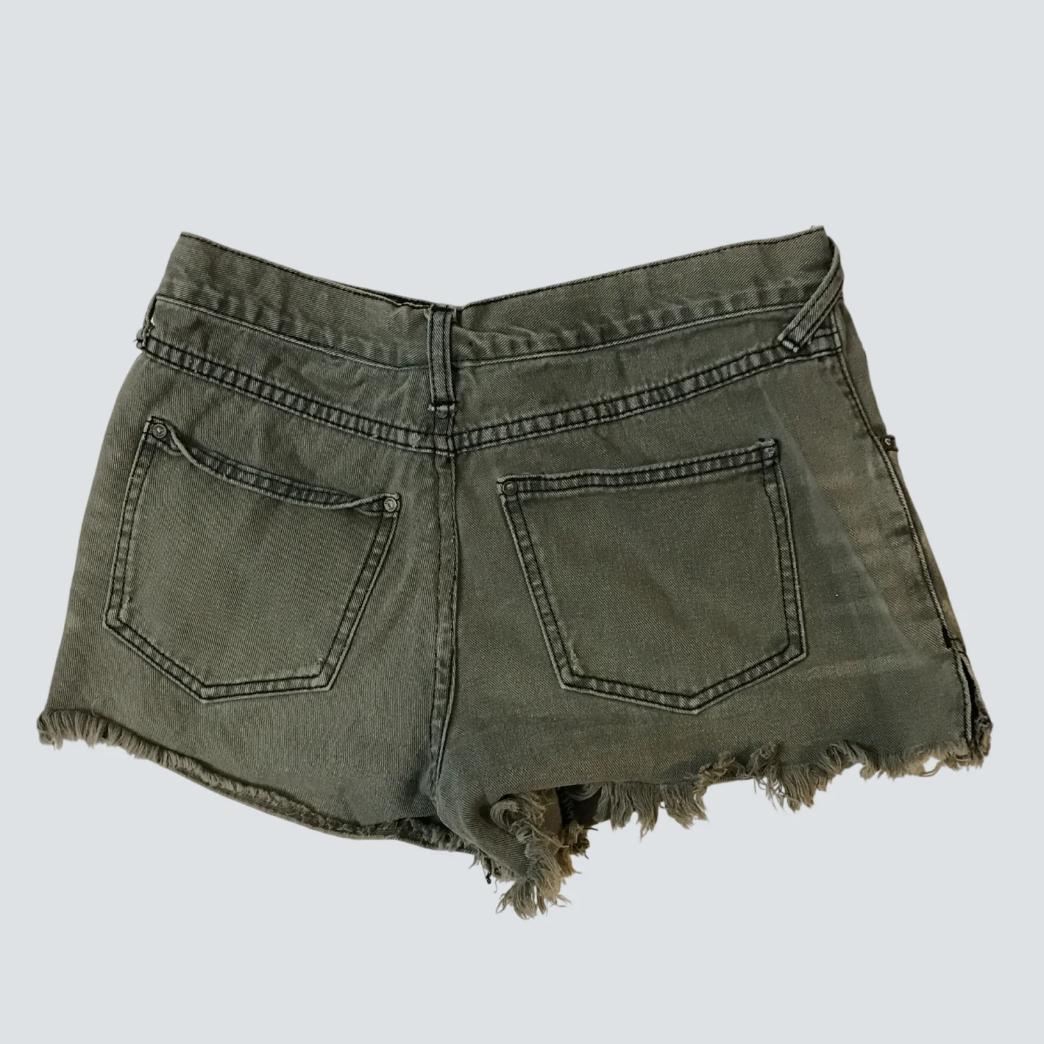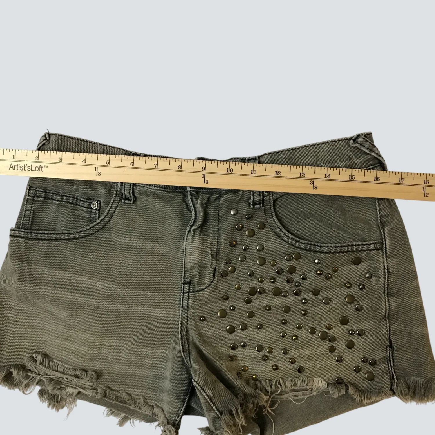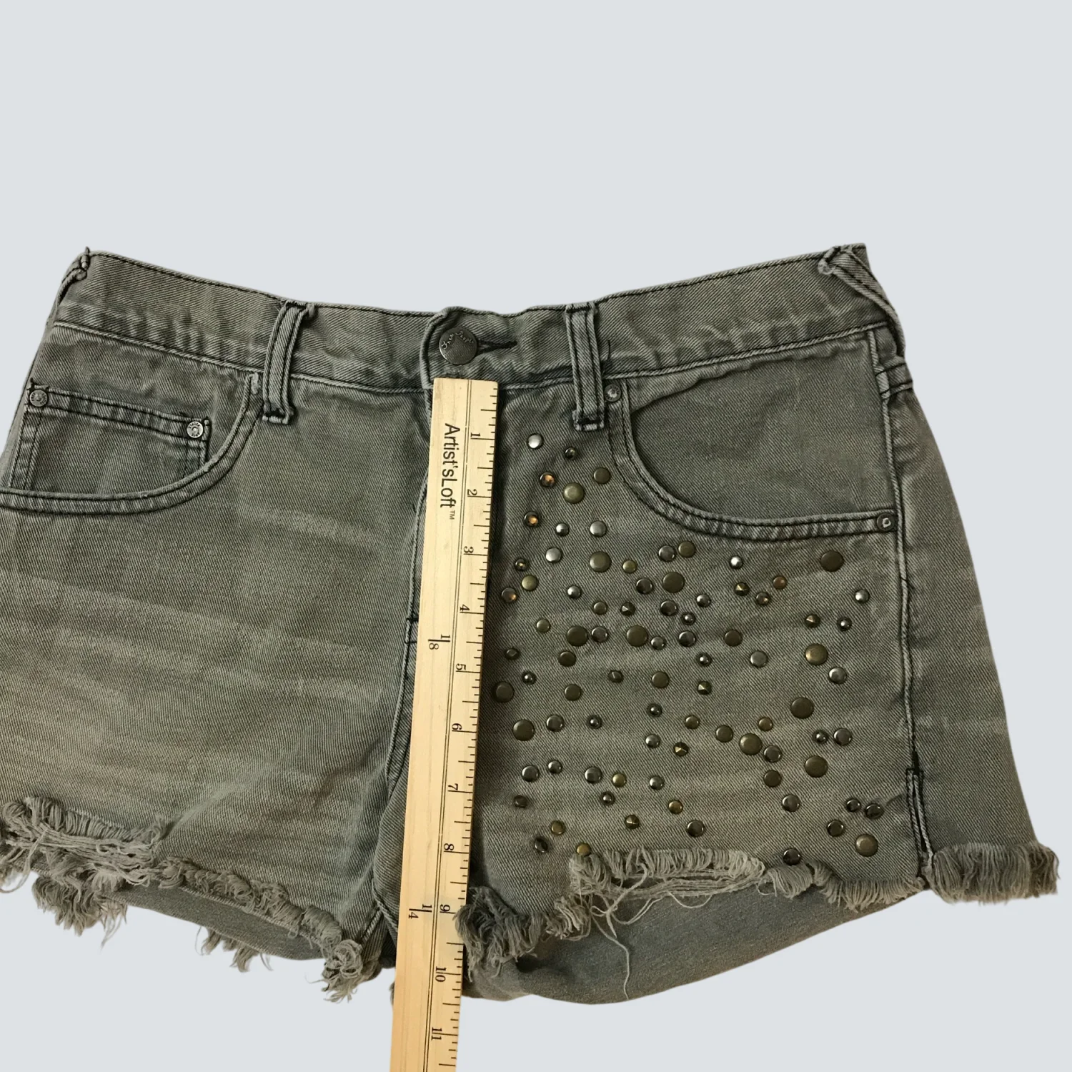 Style Frayed raw hem denim short with embellishhments Color: Gray Size: No size tag W: 14” Rise: 11 Length: 12 Condition: Good Machine wash cold