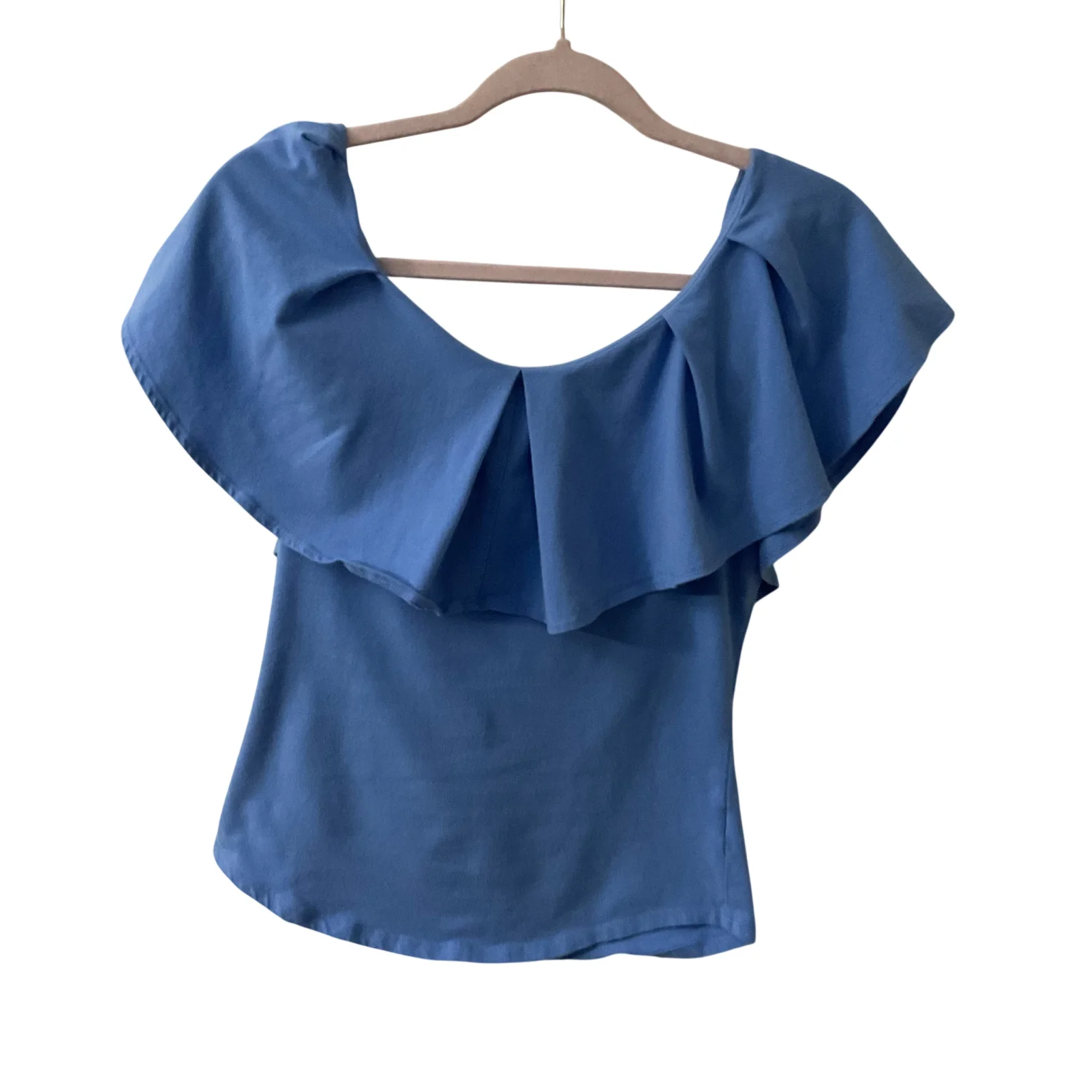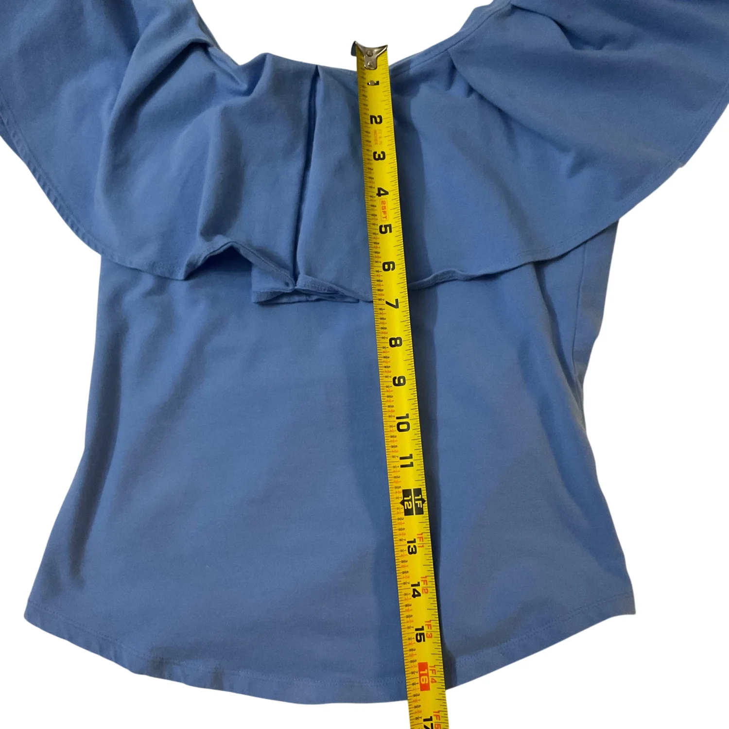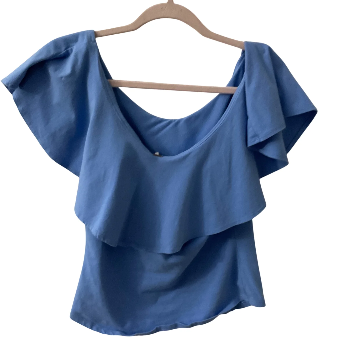 Style: Off shoulder ruffle top Color: Blue Size: M Armpit: 15" Length: 16" Waist: 14" 95% Cotton 5% Spandex Machine wash cold