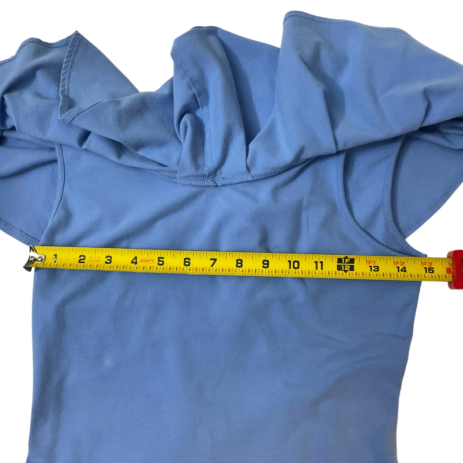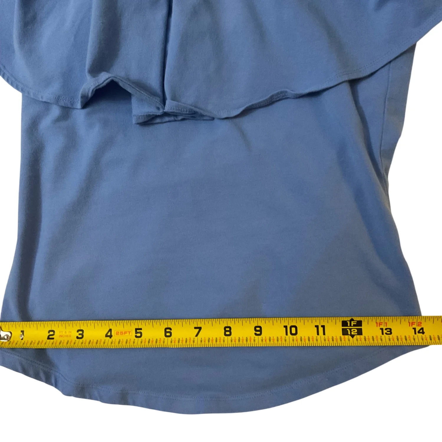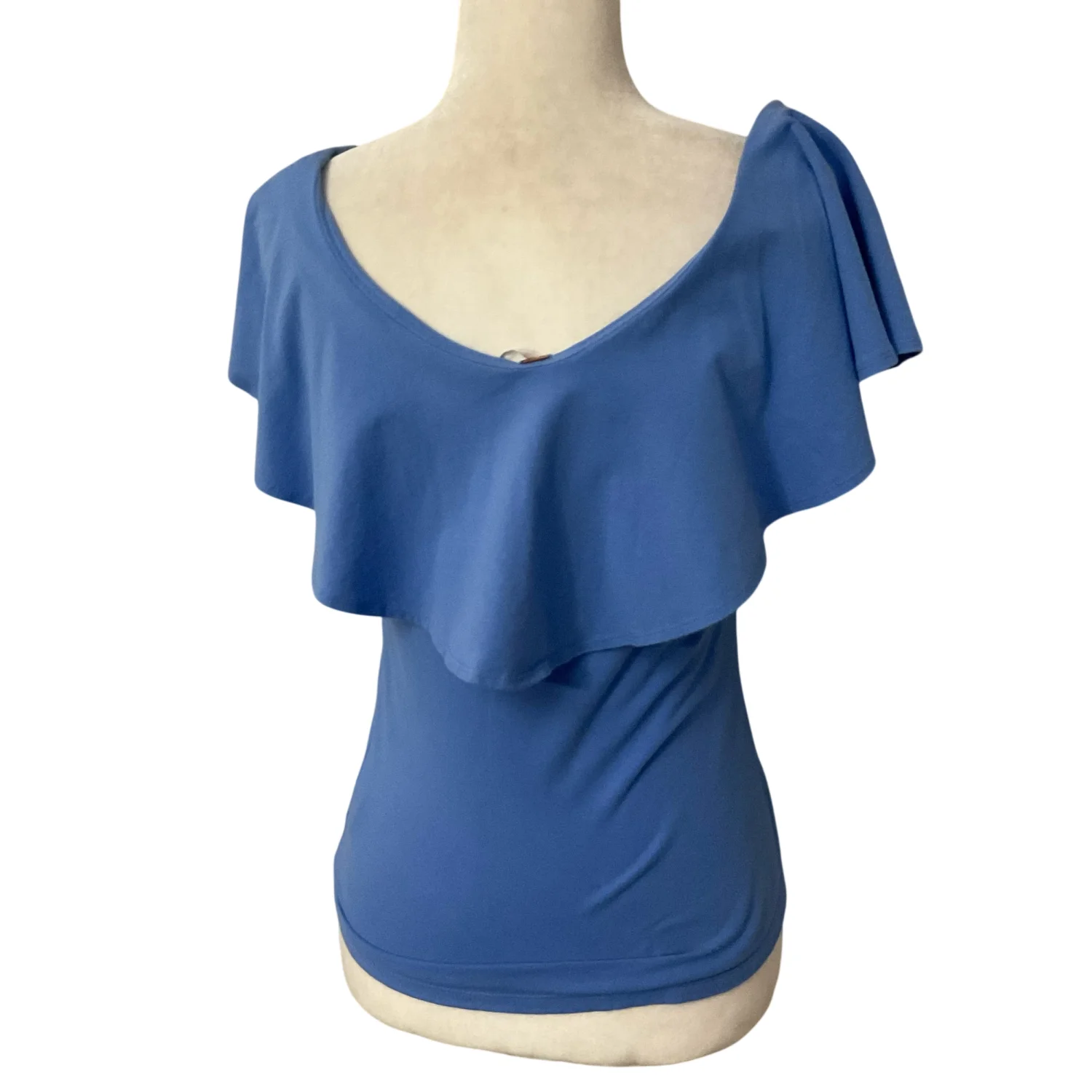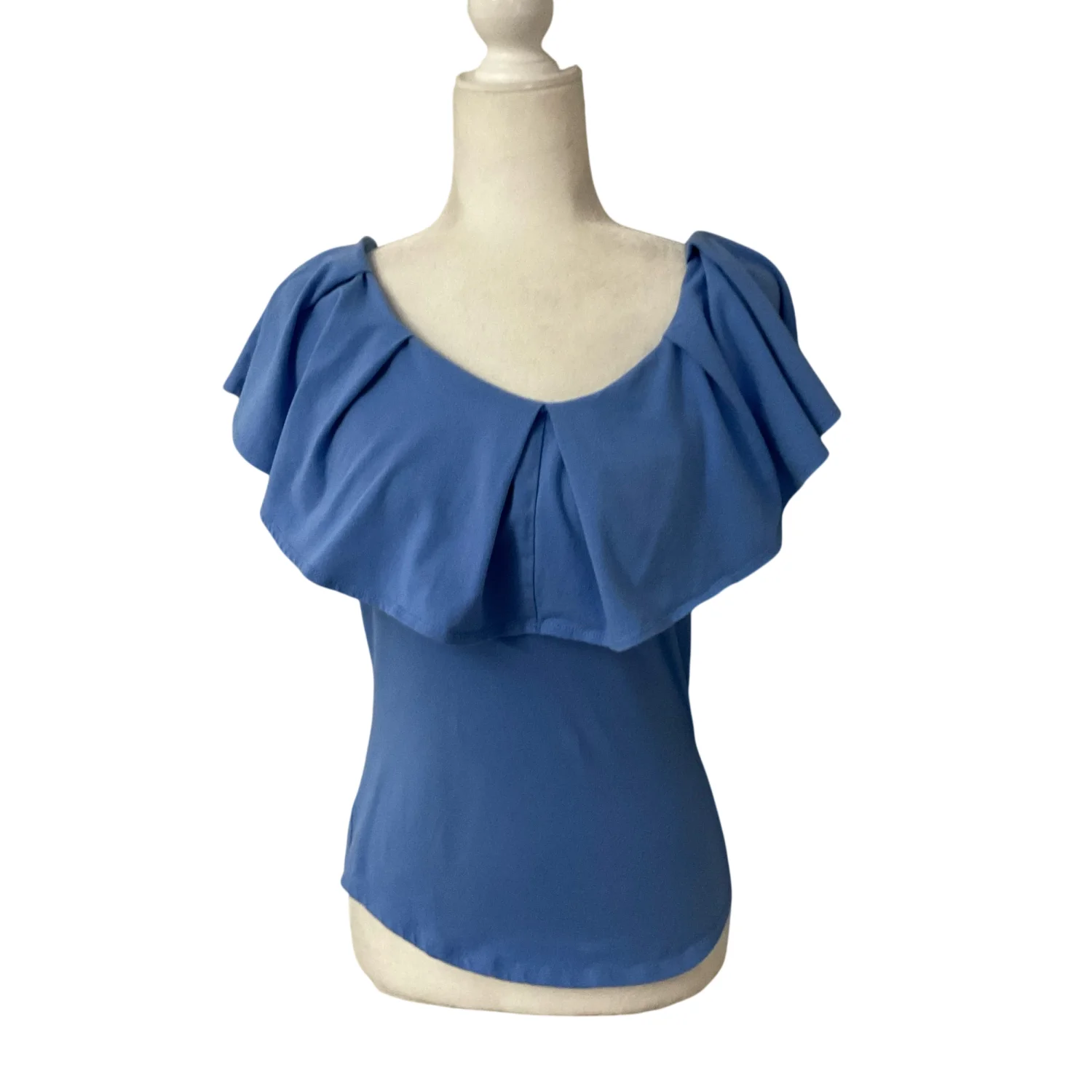 Style: Off shoulder ruffle top Color: Blue Size: M Armpit: 15" Length: 16" Waist: 14" 95% Cotton 5% Spandex Machine wash cold