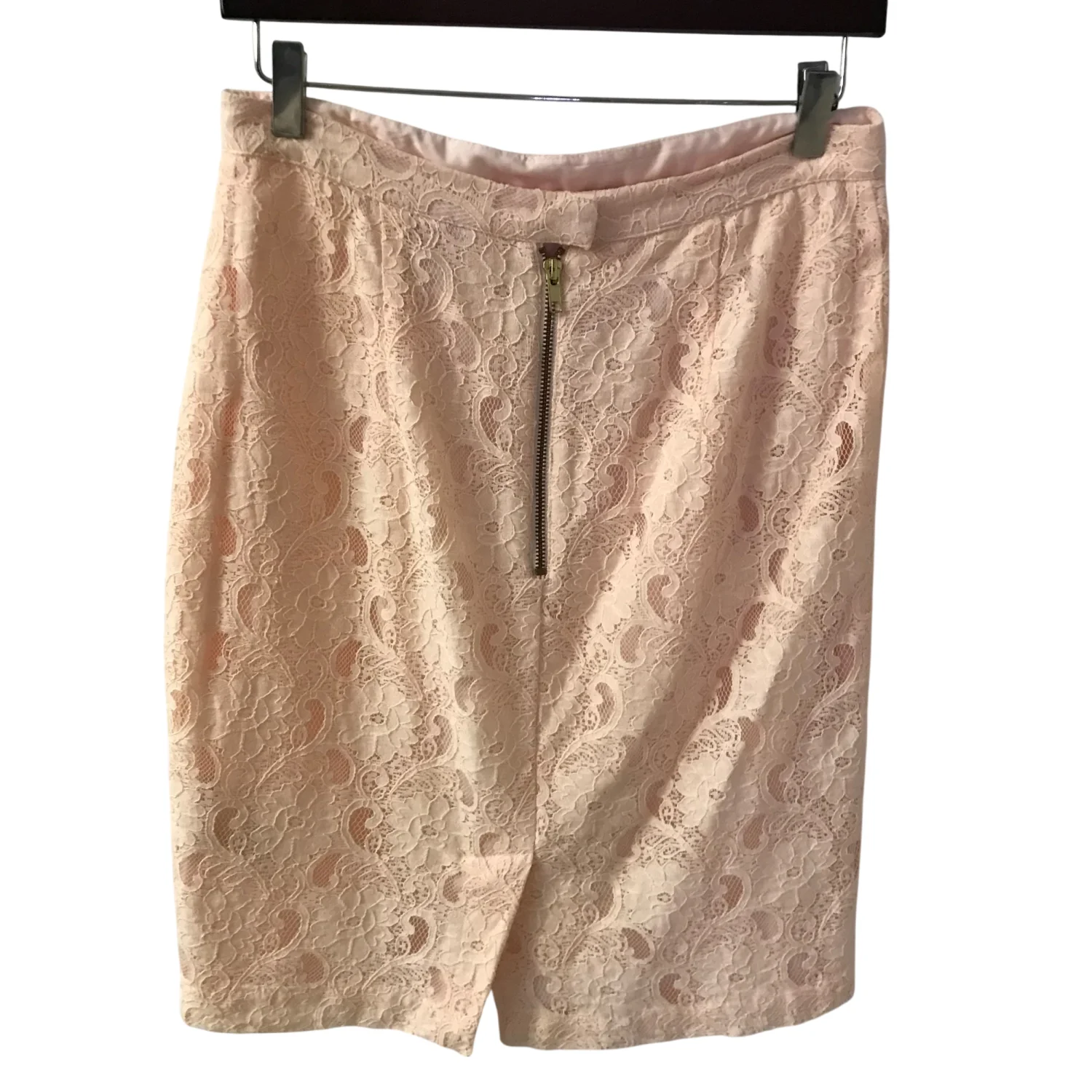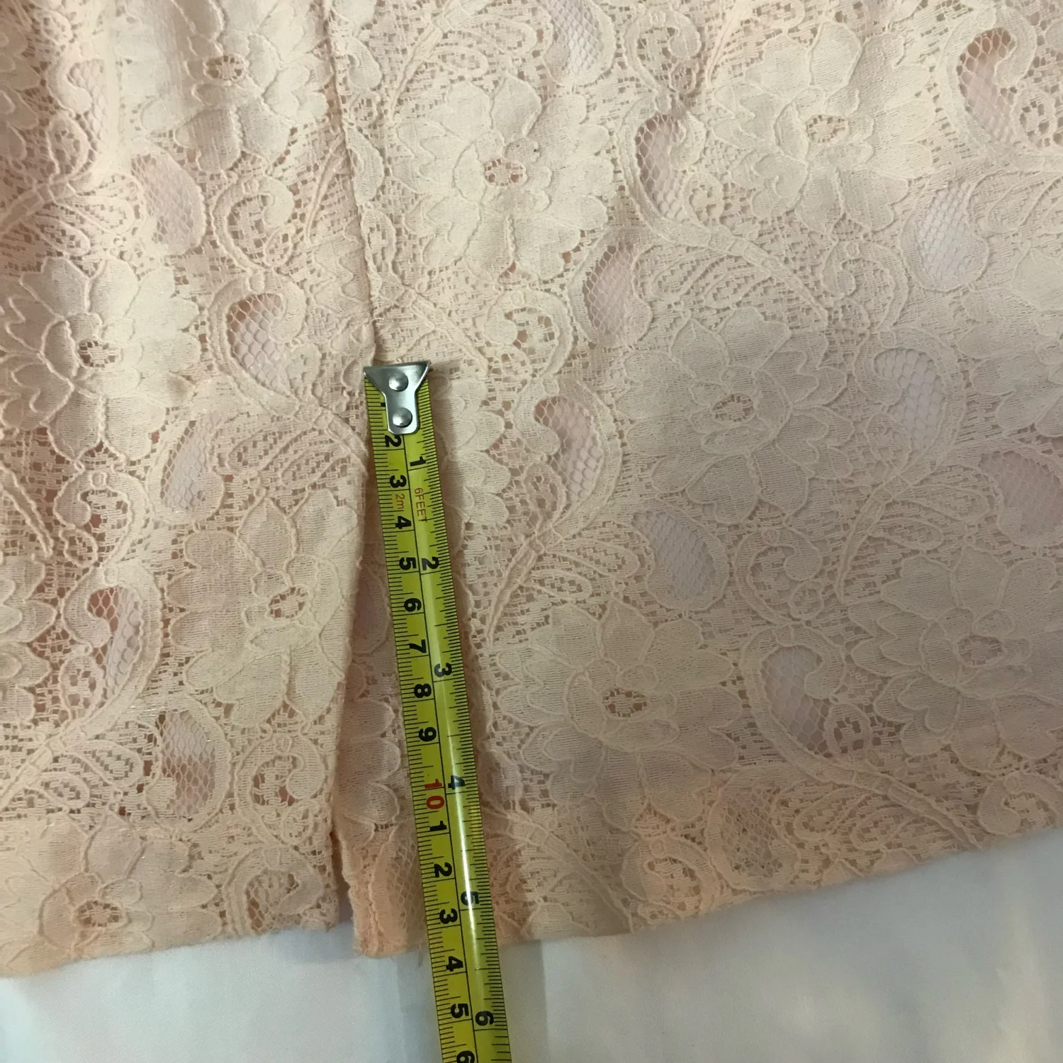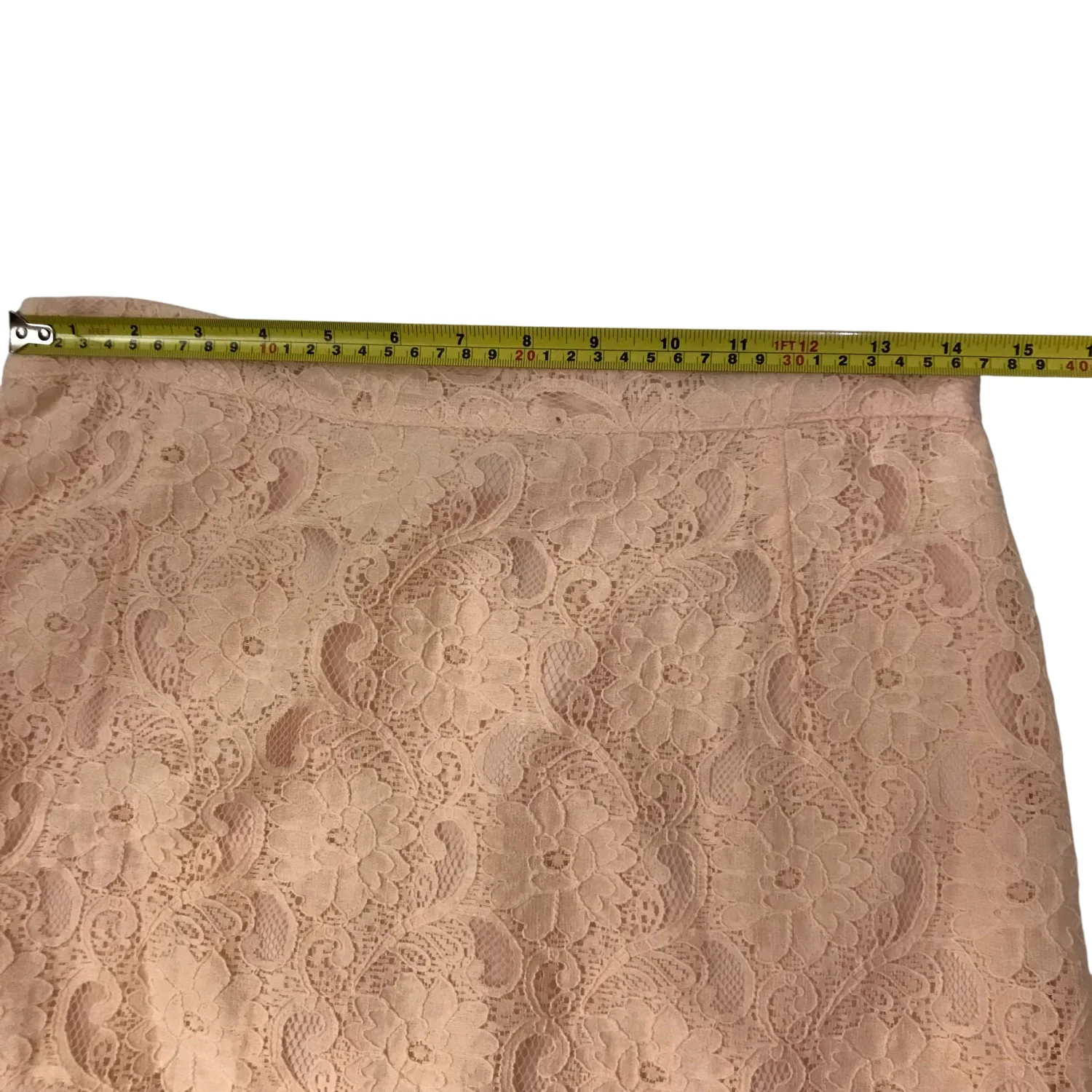 Style: Calf-length, fitted skirt in lace. Concealed zip at back and scalloped, raw-edge hem. Lined. Color: Color is listed as Powder Pink but it is more of a Peach color Size:10 Waist: 14” Length: 21” Condition: Good Polyamide 52% Cotton 48% Machine wash