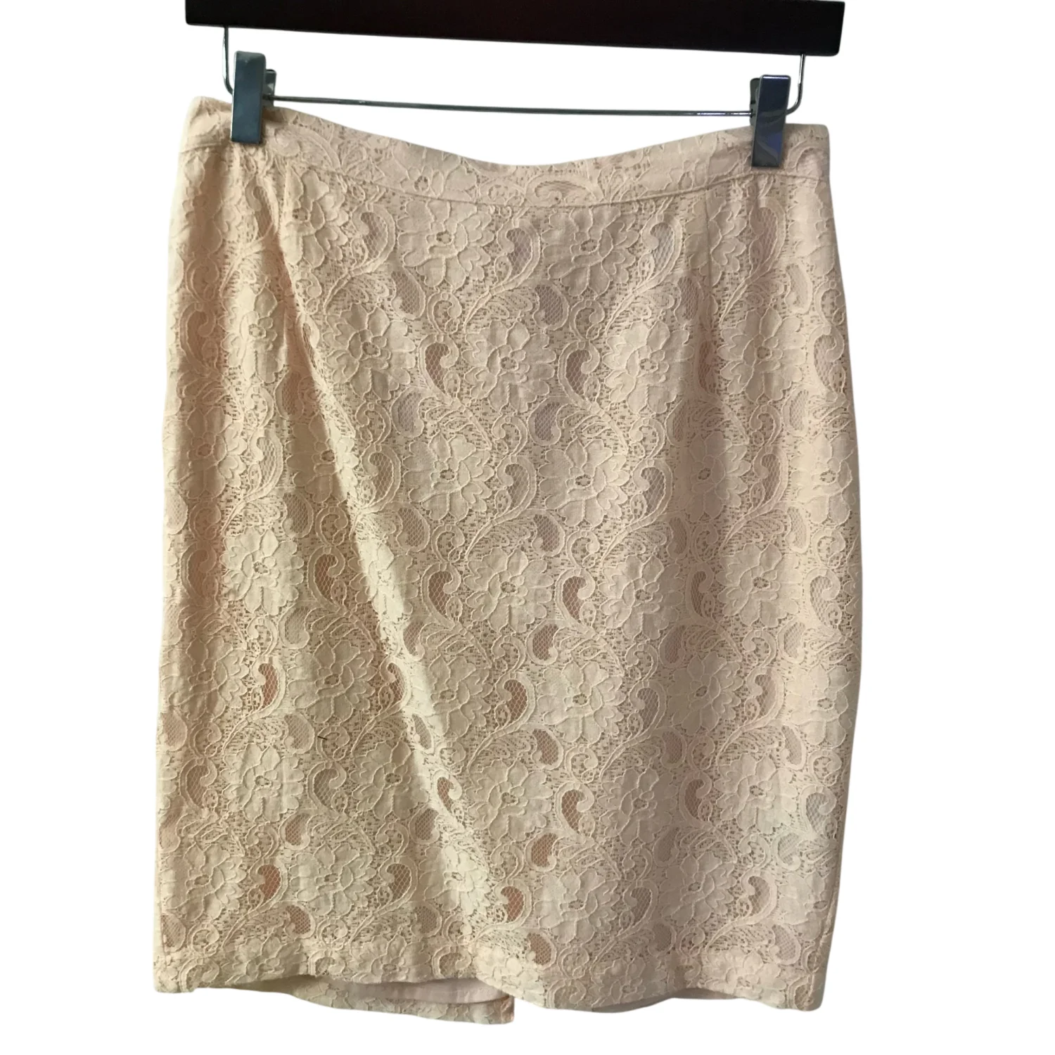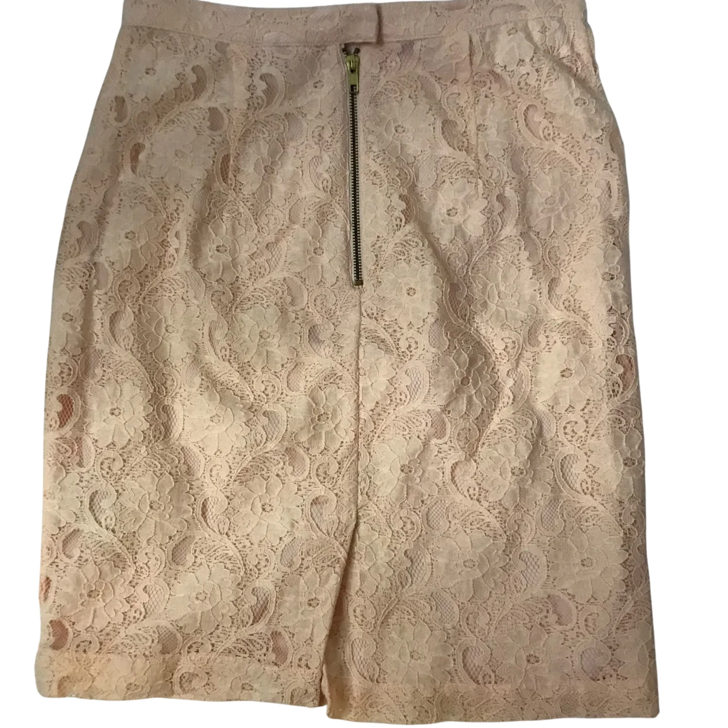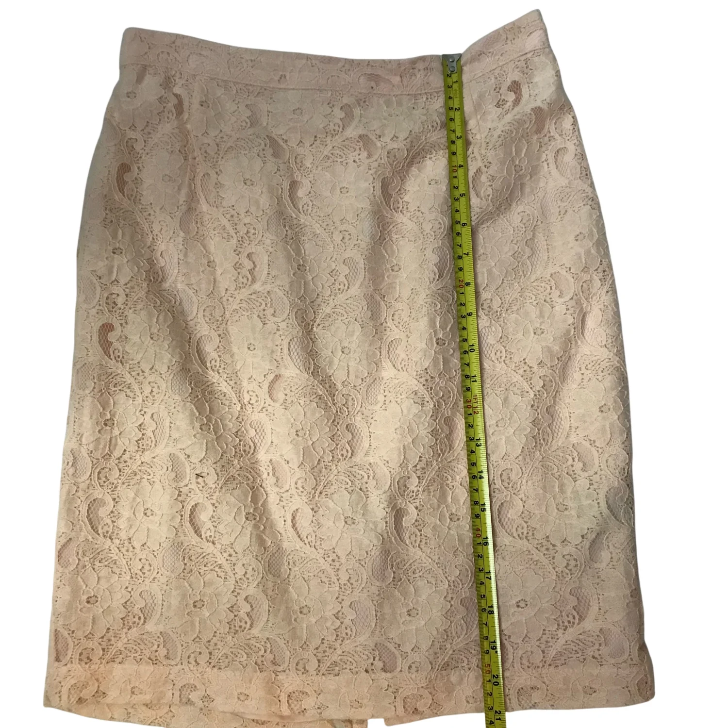 Style: Calf-length, fitted skirt in lace. Concealed zip at back and scalloped, raw-edge hem. Lined. Color: Color is listed as Powder Pink but it is more of a Peach color Size:10 Waist: 14” Length: 21” Condition: Good Polyamide 52% Cotton 48% Machine wash