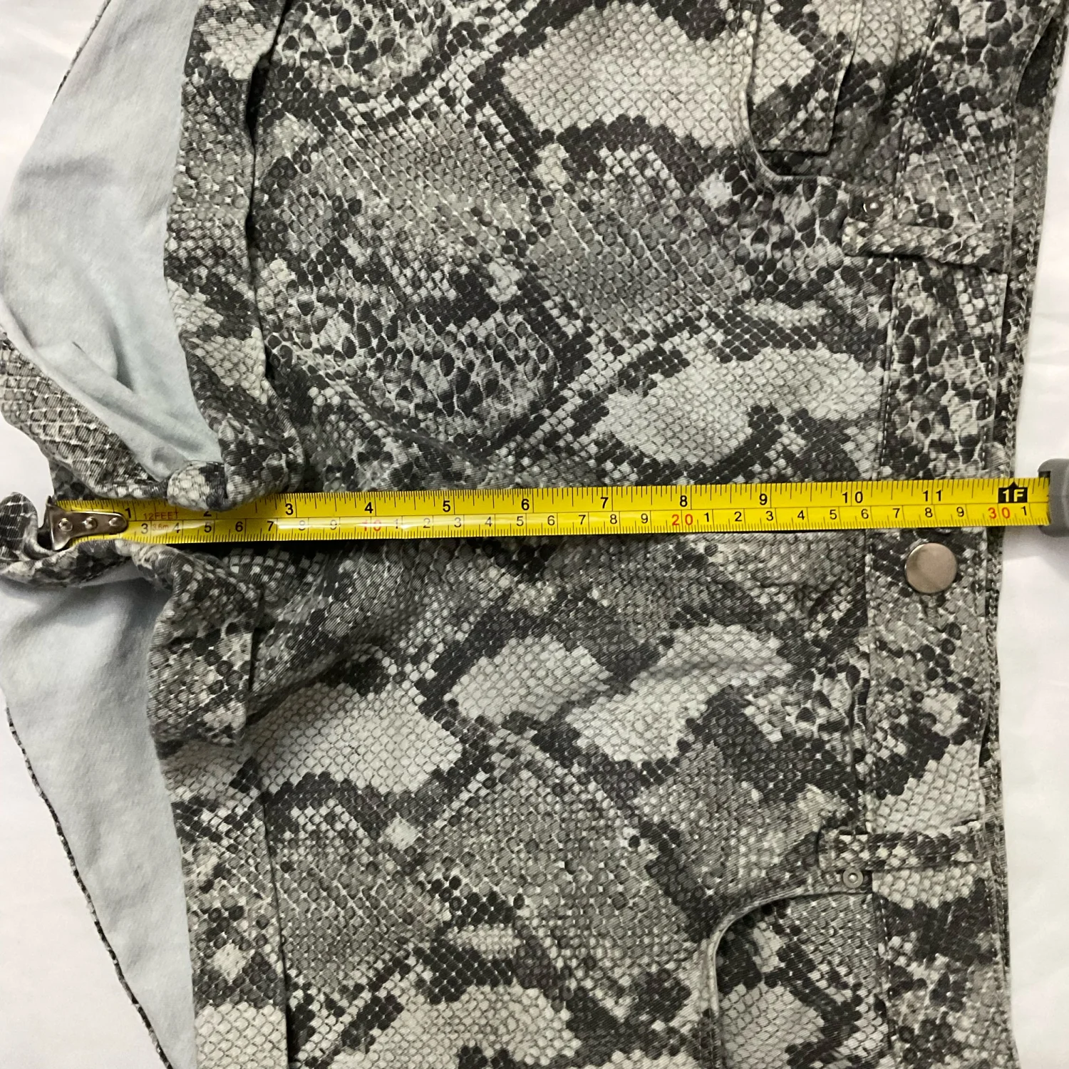 Style: 5 pocket snakeskin print shorts Color: Gray/White Size: 10 Waist: 15" Rise: 12" Length: 13" Condition: Good 98% Cotton 2% Elastane Machine wash