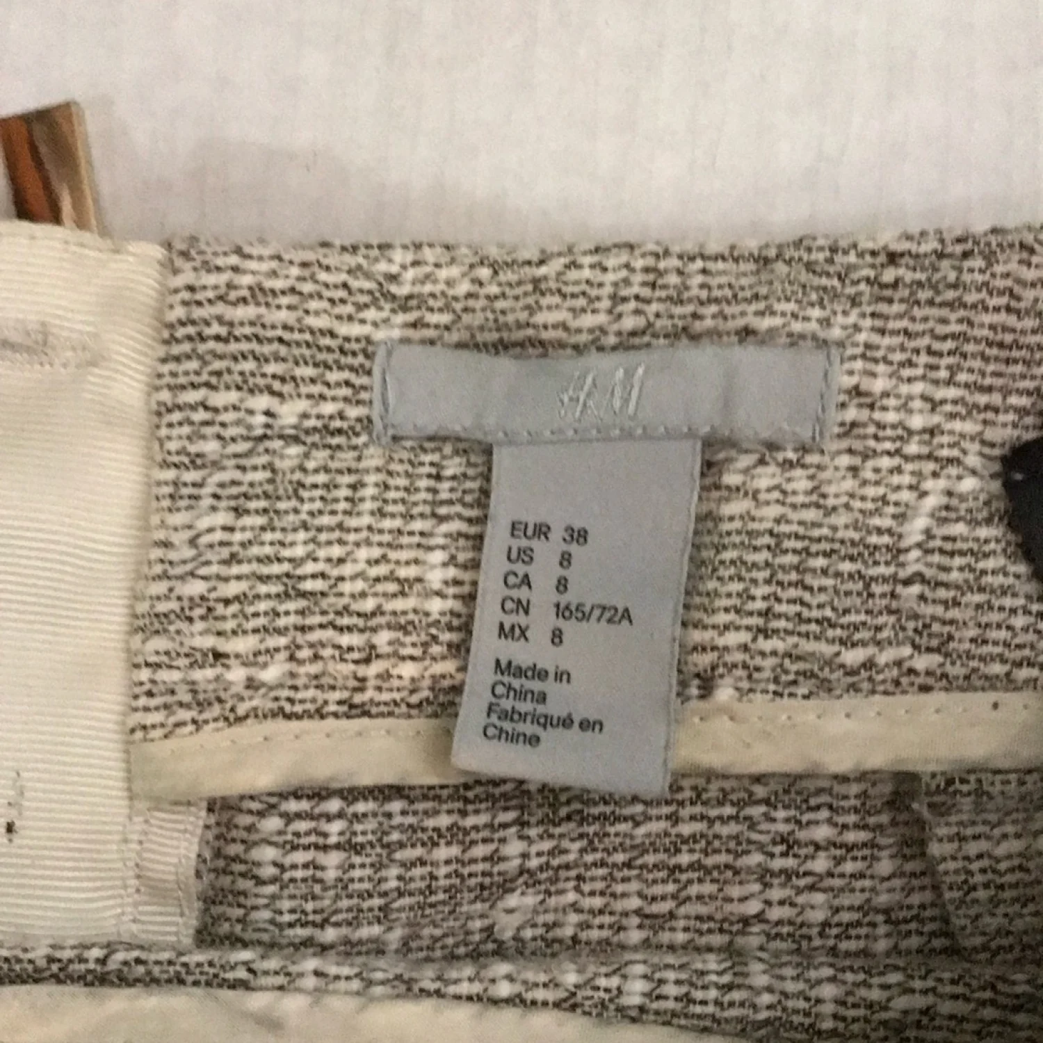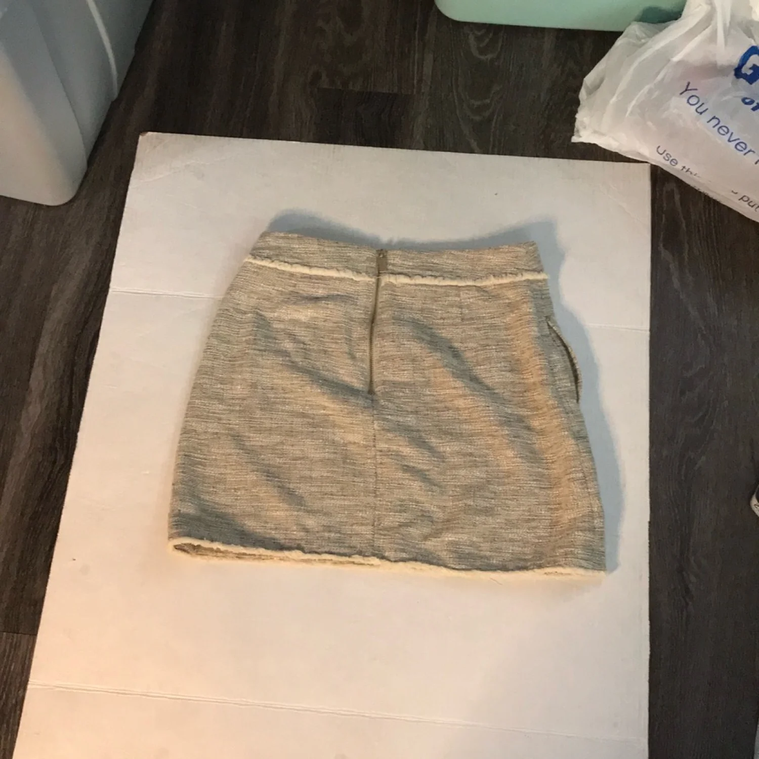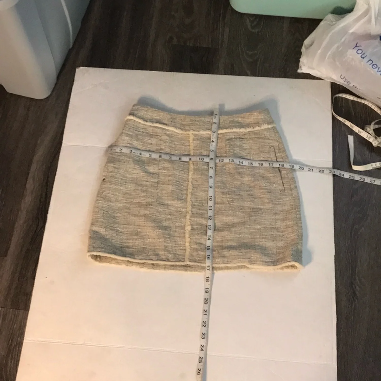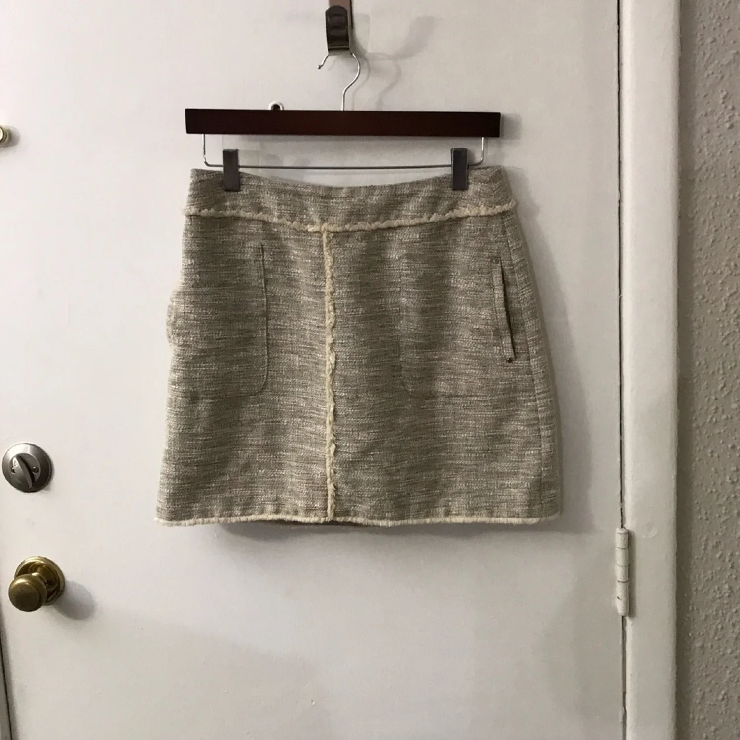 Style: A line skirt with back zip closure Color: Cream/Gray/Brown mix Size: 8 Waist: 19" Length: 17" Condition: Preowned 73% Cotton 23% Polyester Machine wash