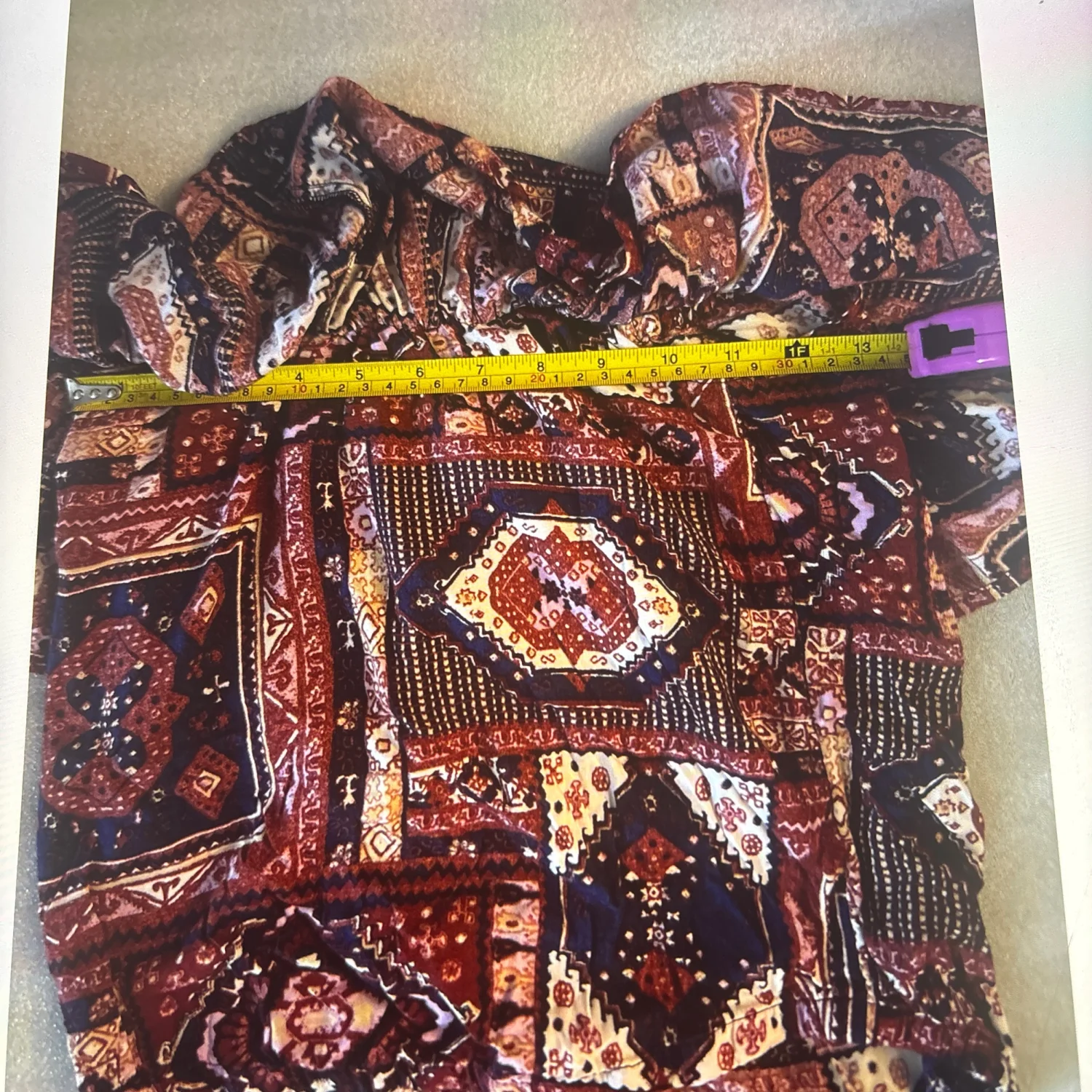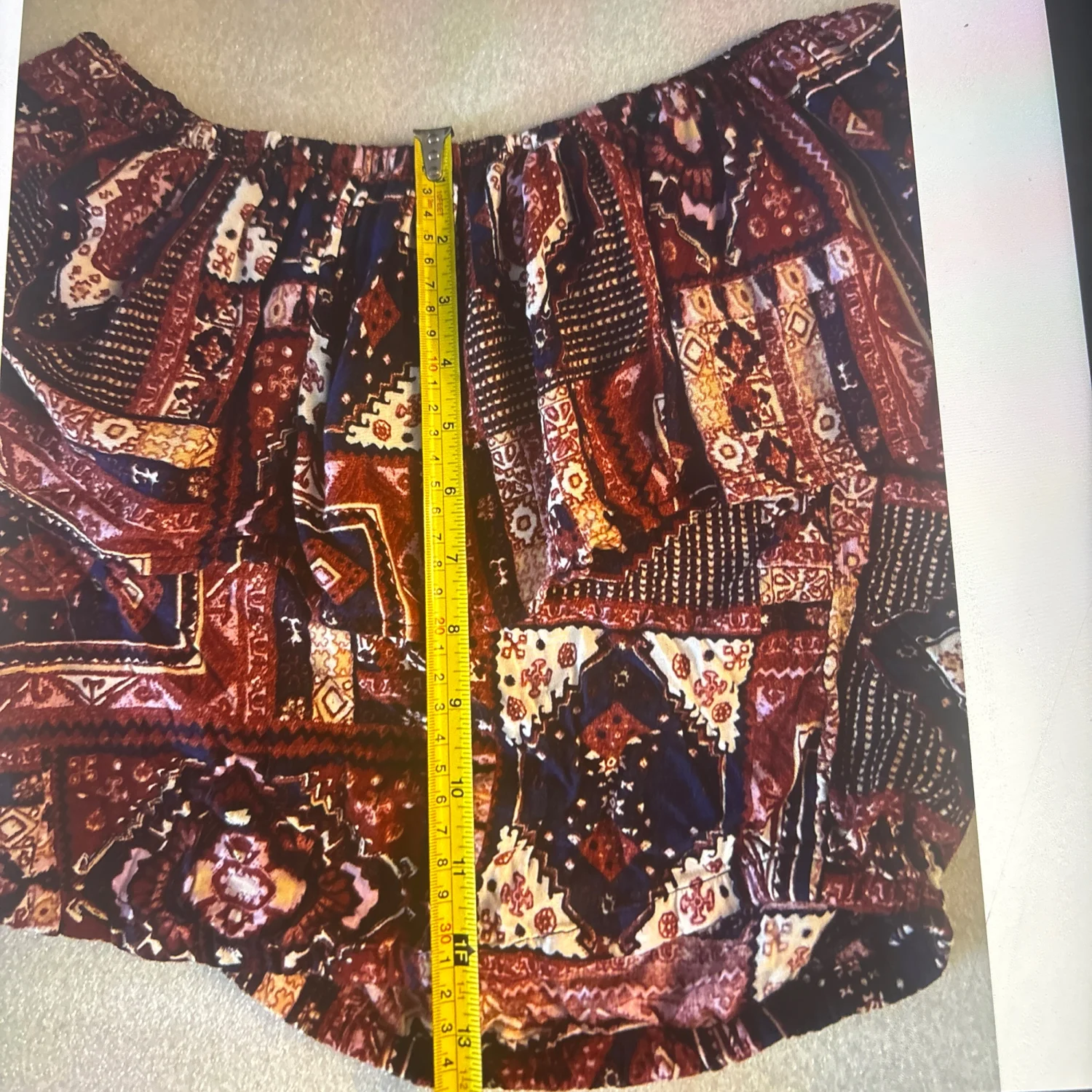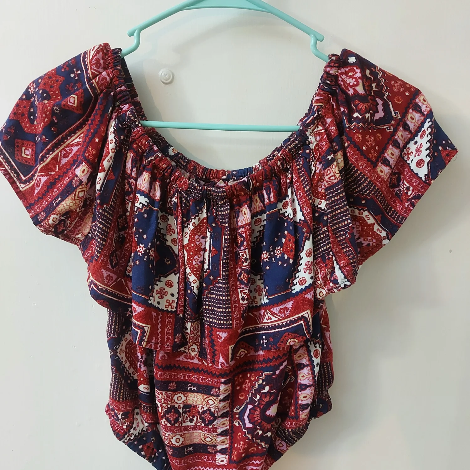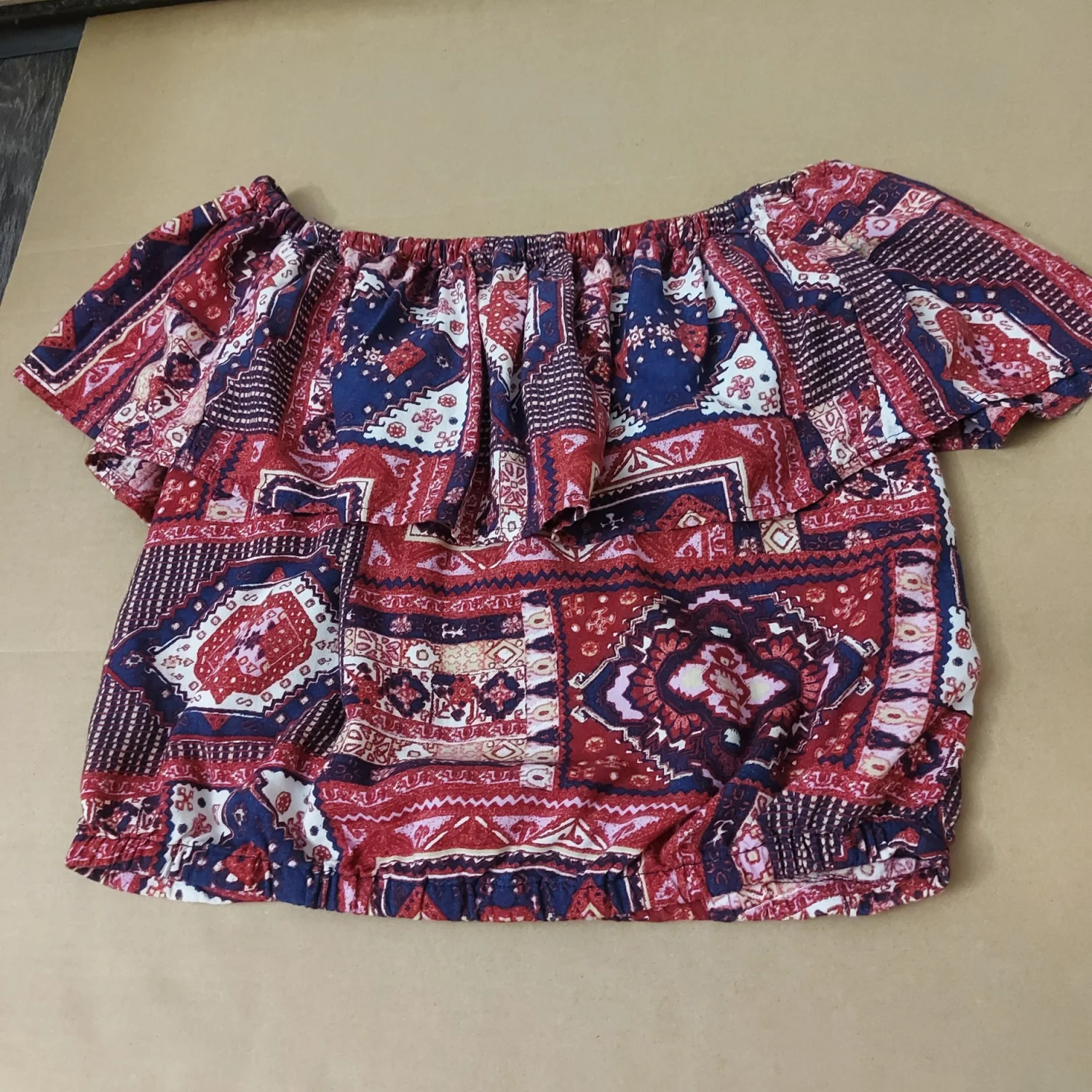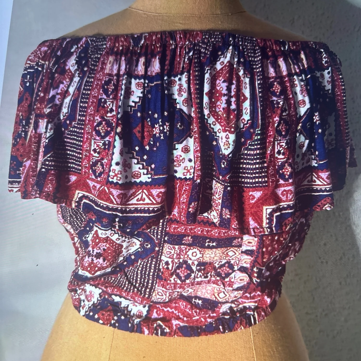 Style: Off shoulder crop top Color: Maroon/ Blue/ White Size: XS Armpit: 13” Length: 14” Condition: Good 100% Viscose Machine wash cold