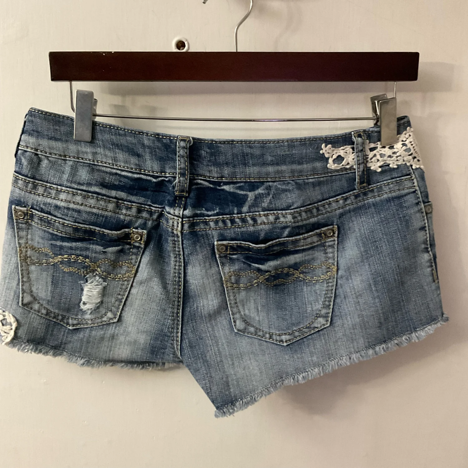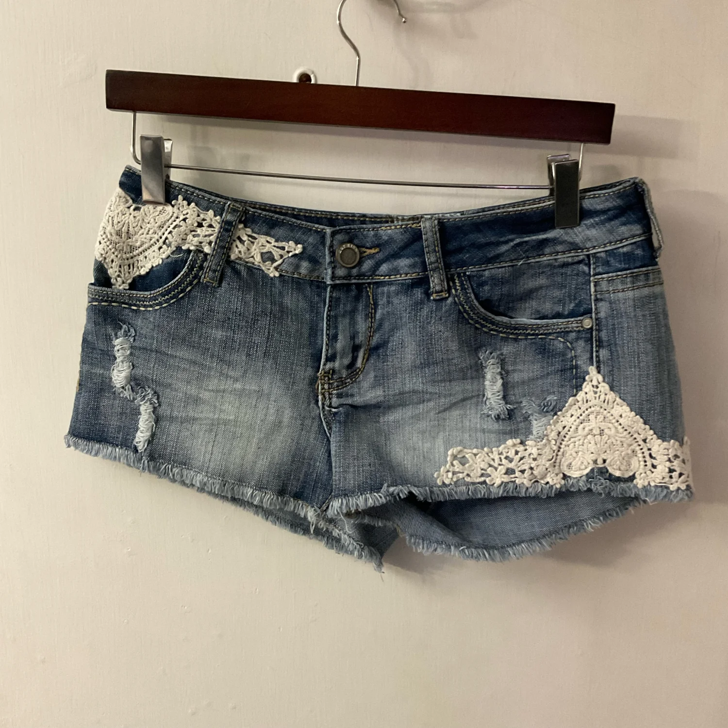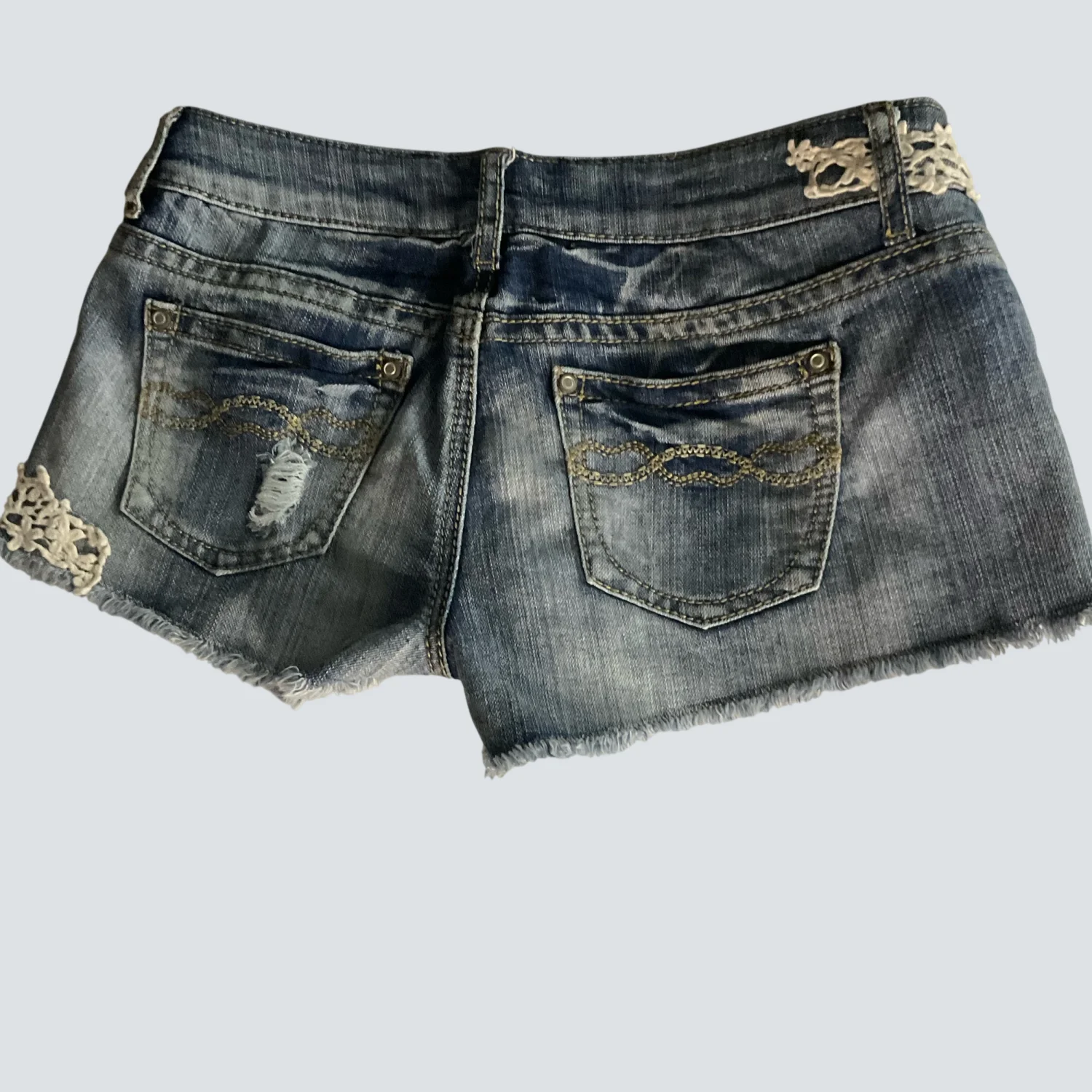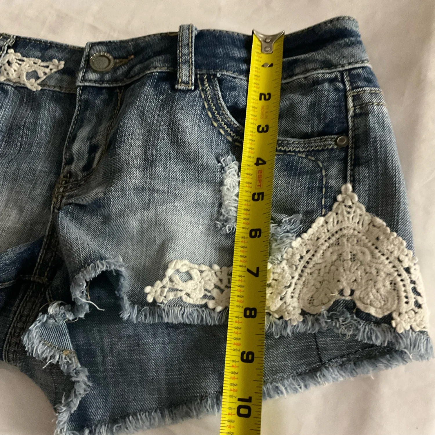 Style: Cici Embroidered Heart Distressed Short Color: Blue/ White Size: 7 W: 16” Rise: 9” Length: 10” Condition: Good Preowned condition 74% Cotton 25% Polyester 1% Spandex Machine wash cold