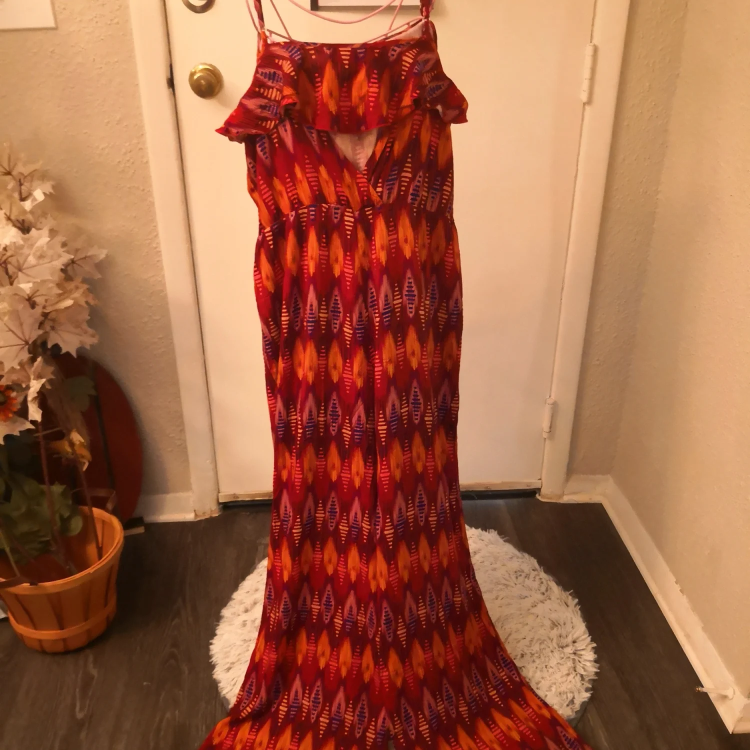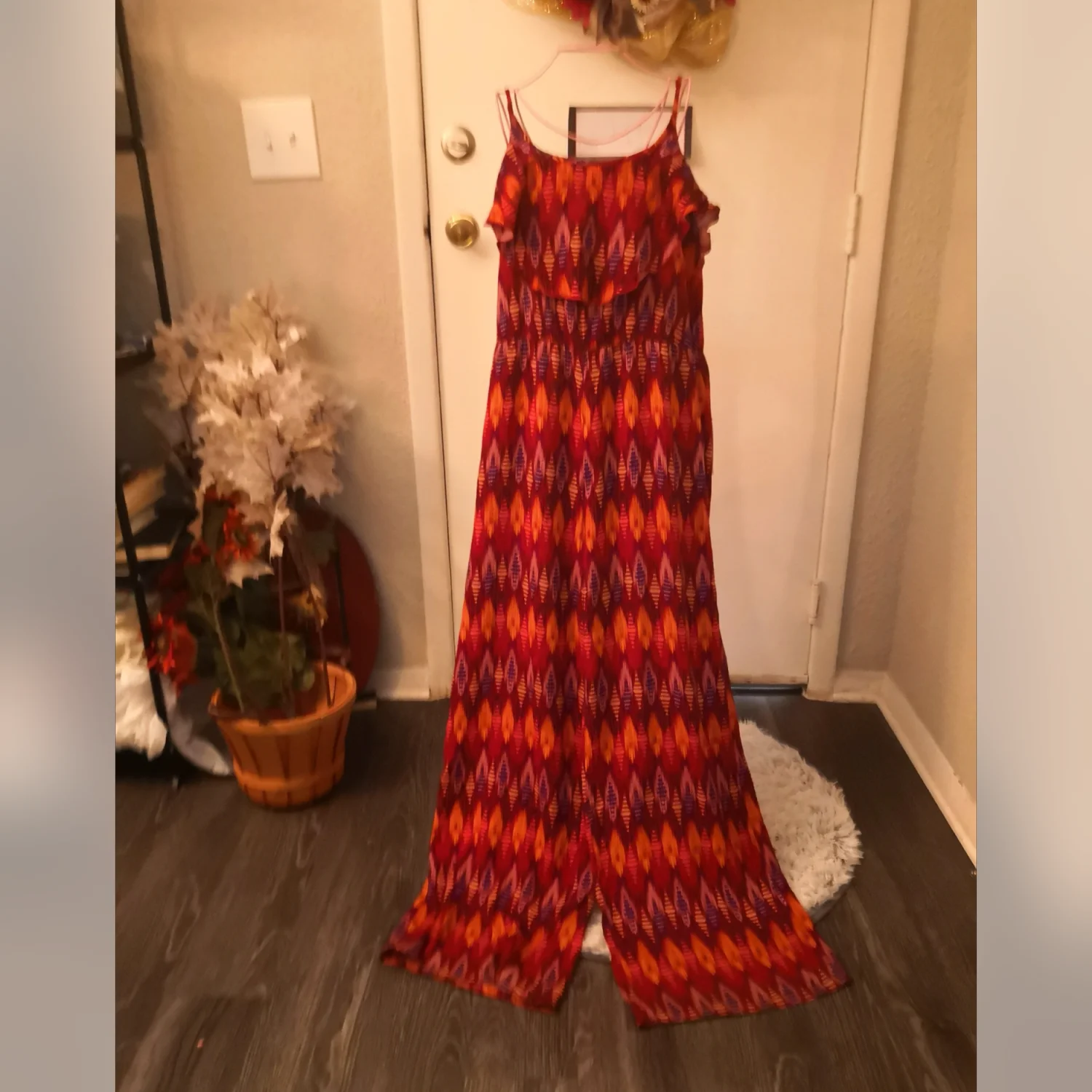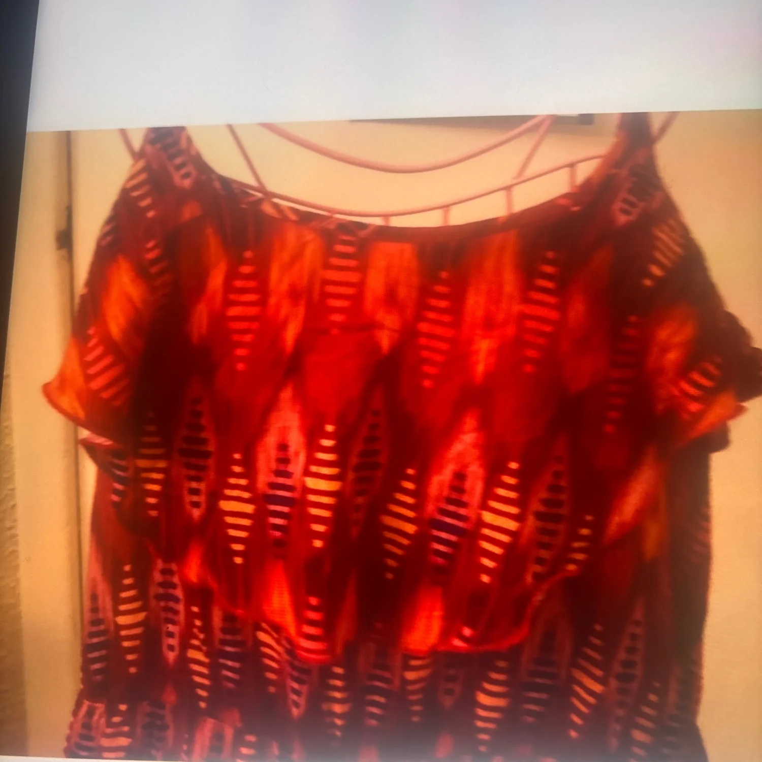 Style: Ruffle tier tank front, keyhole back Color: Red/Navy/Gold Size M Armpit: 16” Waist: 15” Length: 30” 100% Rayon Condition: Good Machine wash cold