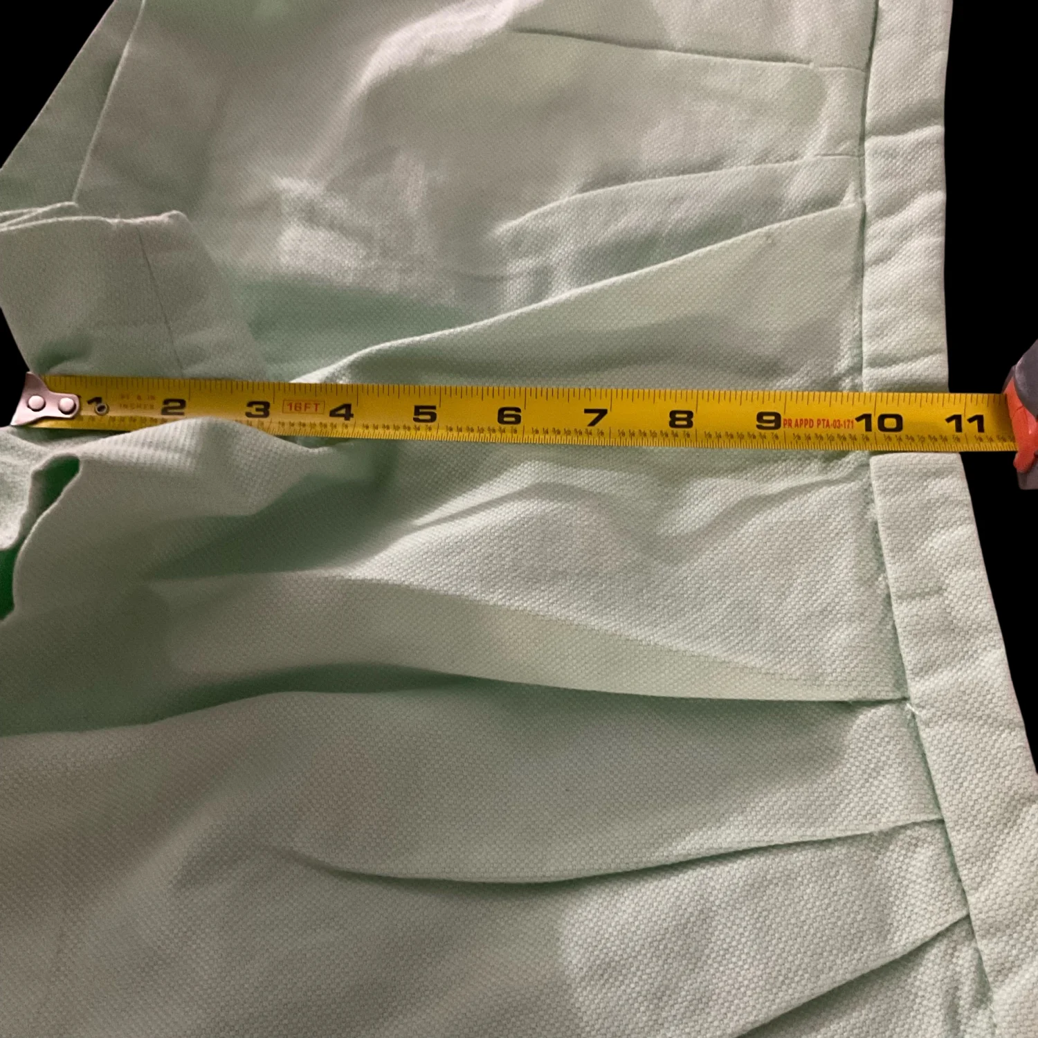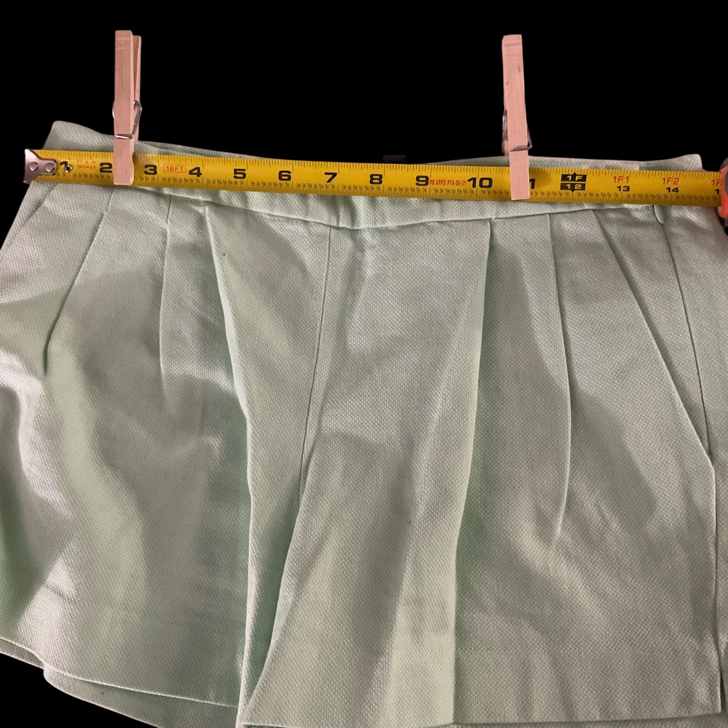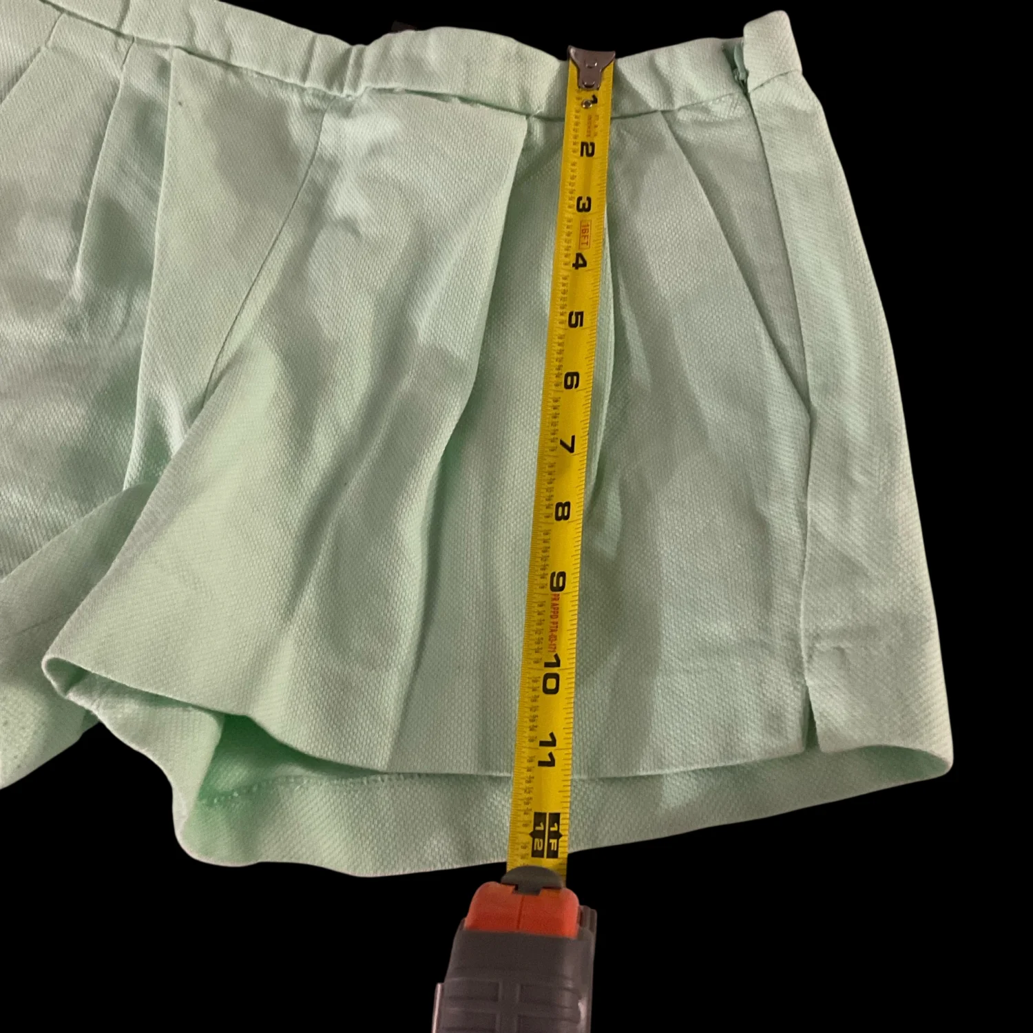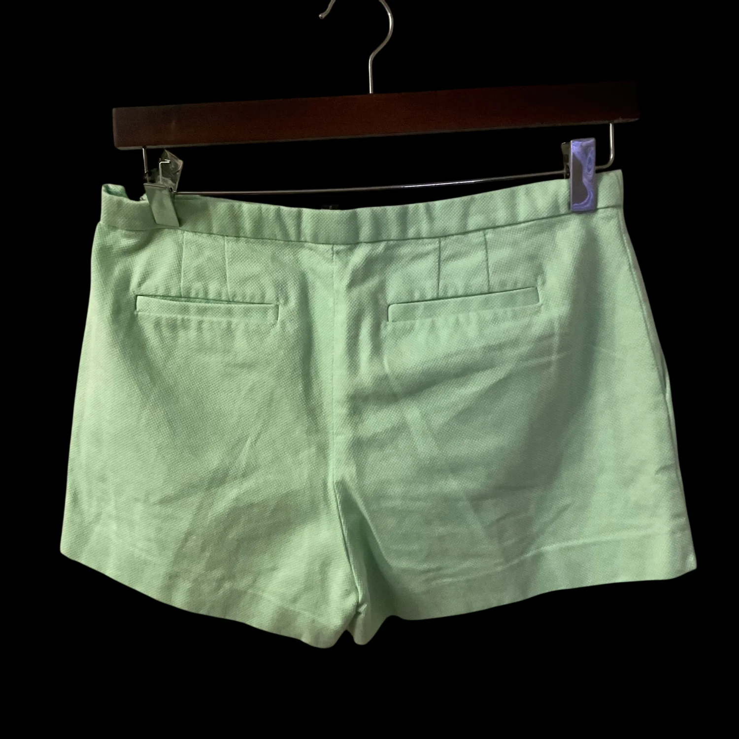 Style: Textured short with pleat front Color: Mint Green Size: 2 Width: 16" Length: 12" Condition: Good. Missing eye loop on back closure as pictured. 100% Cotton Machine wash cold