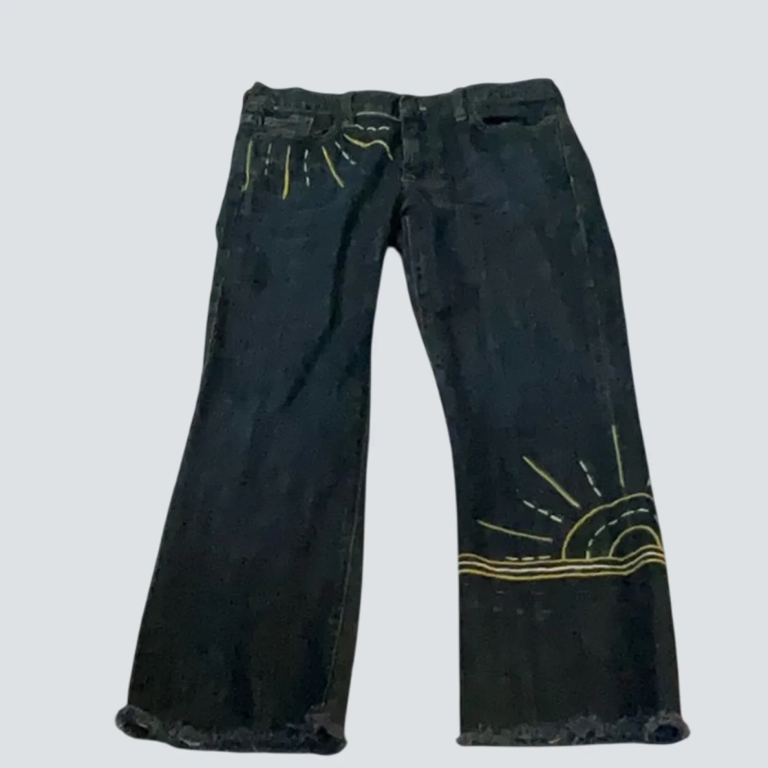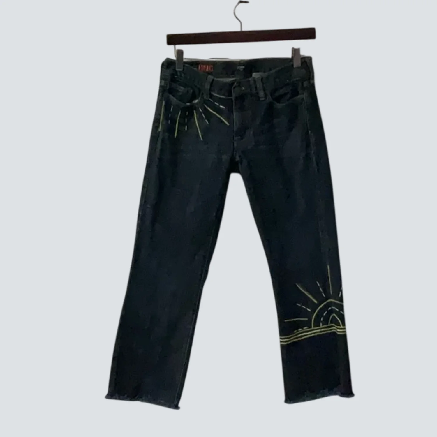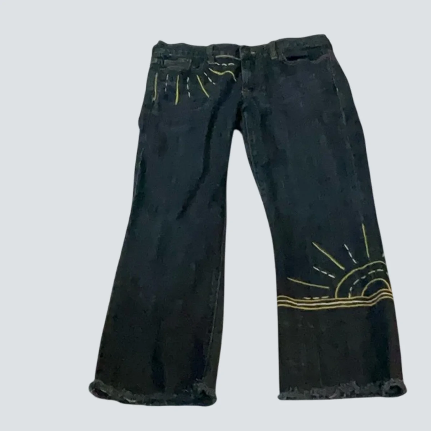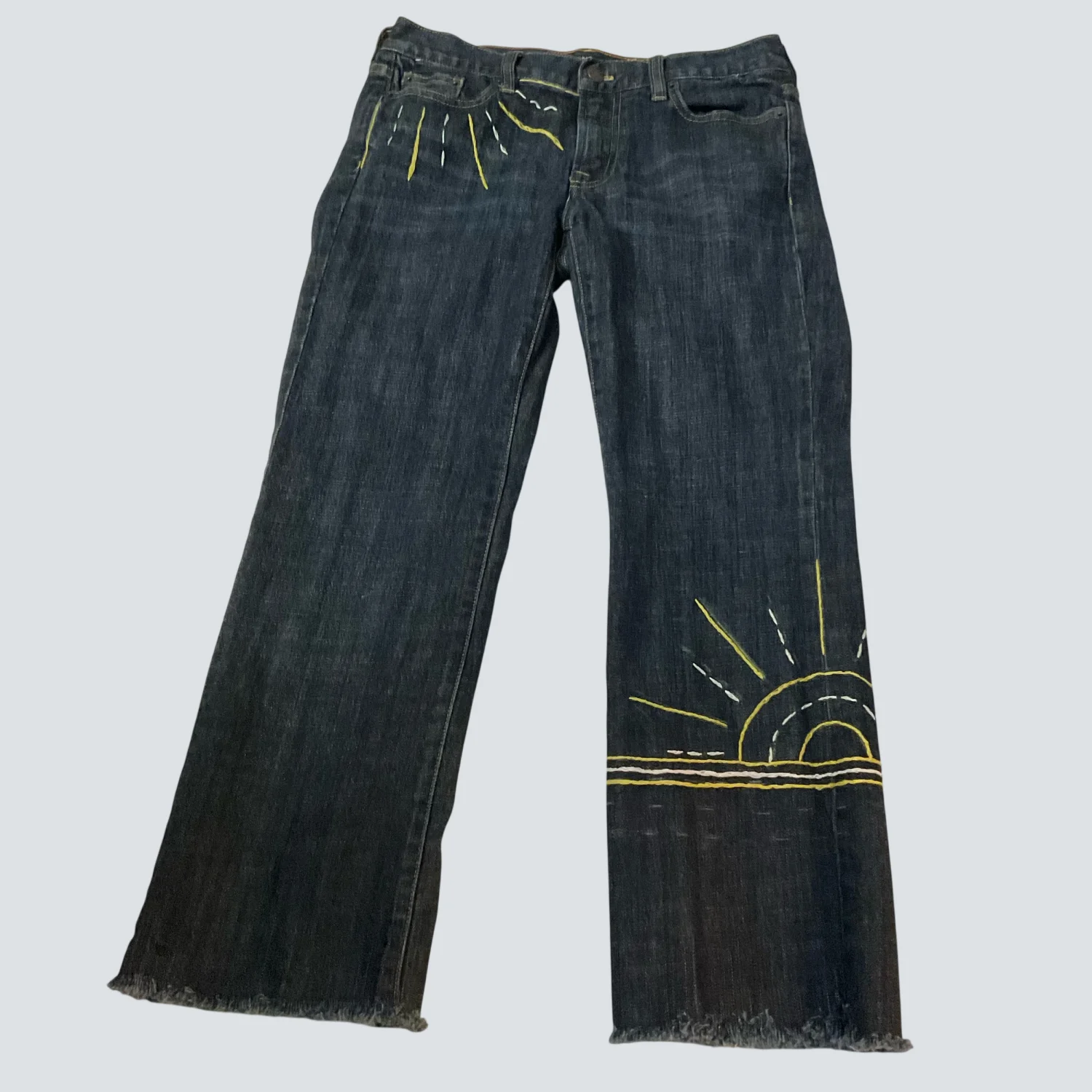 Style: Hip-slung Embroidered Capri jean Color: Blue/Yellow Size: 28S Waist; 14" Rise: 10" Inseam: 24" Condition: Good 98% Cotton 2% Spandex Machine wash cold
