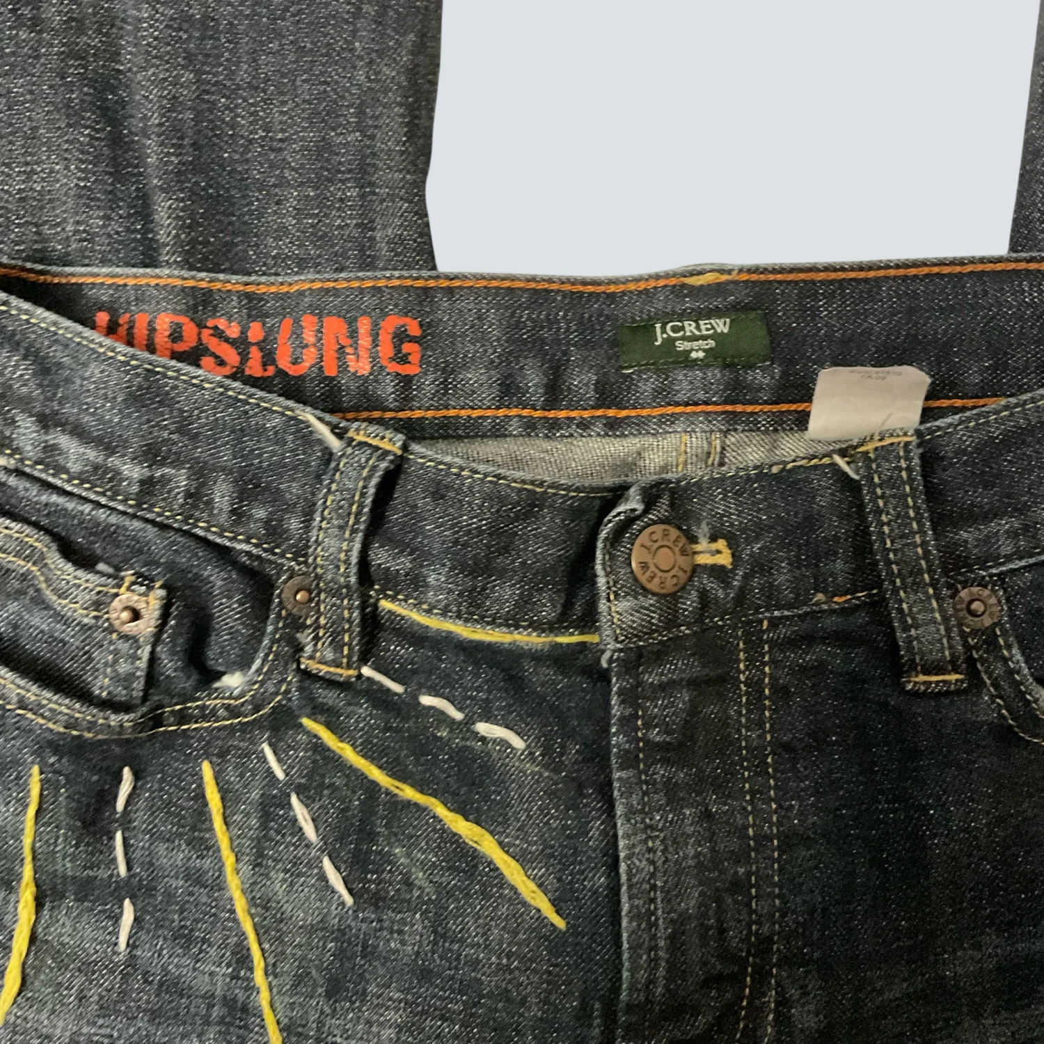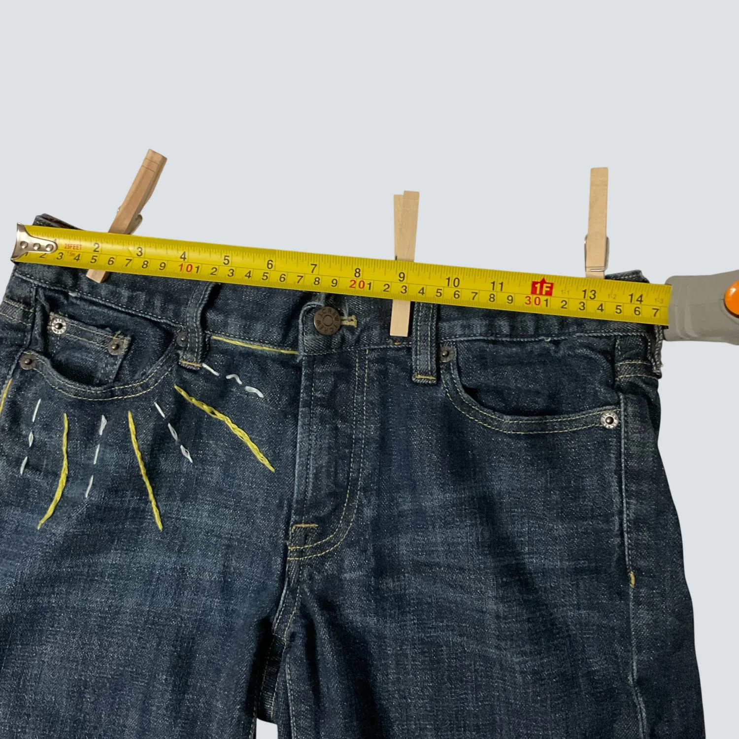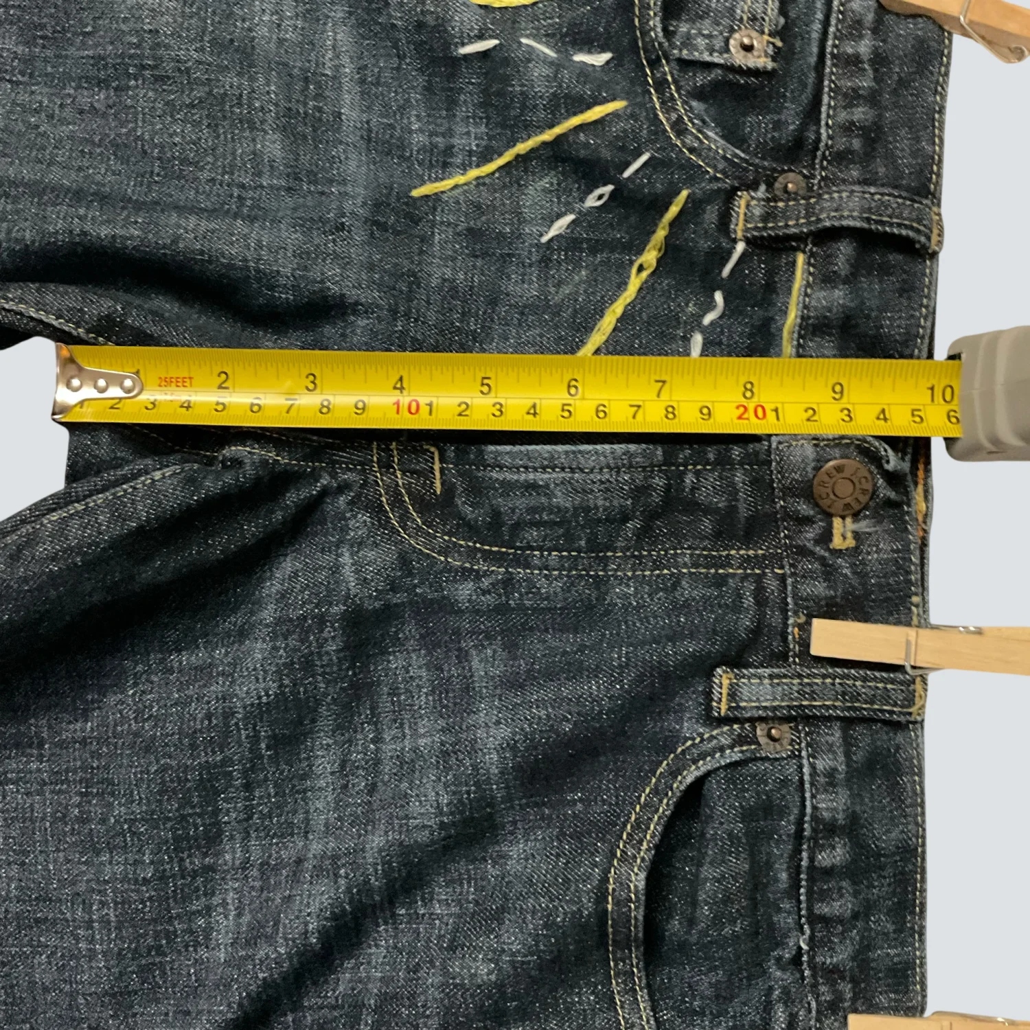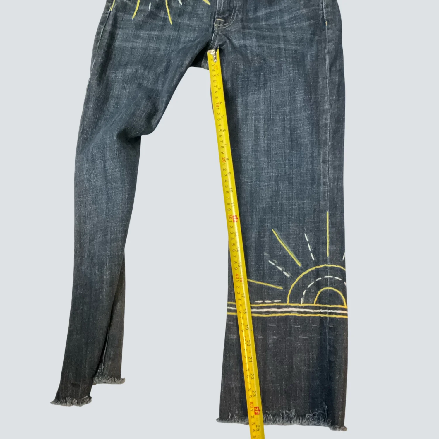 Style: Hip-slung Embroidered Capri jean Color: Blue/Yellow Size: 28S Waist; 14" Rise: 10" Inseam: 24" Condition: Good 98% Cotton 2% Spandex Machine wash cold