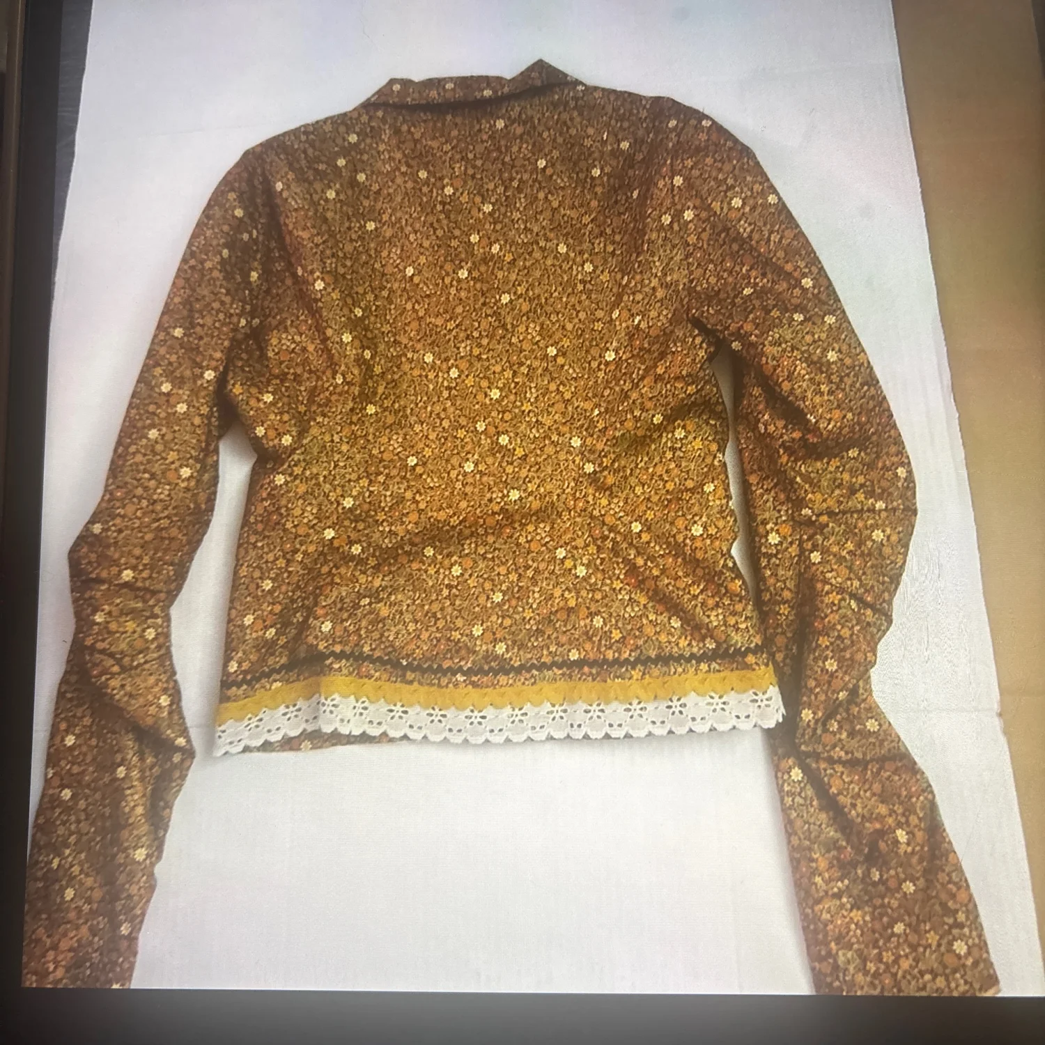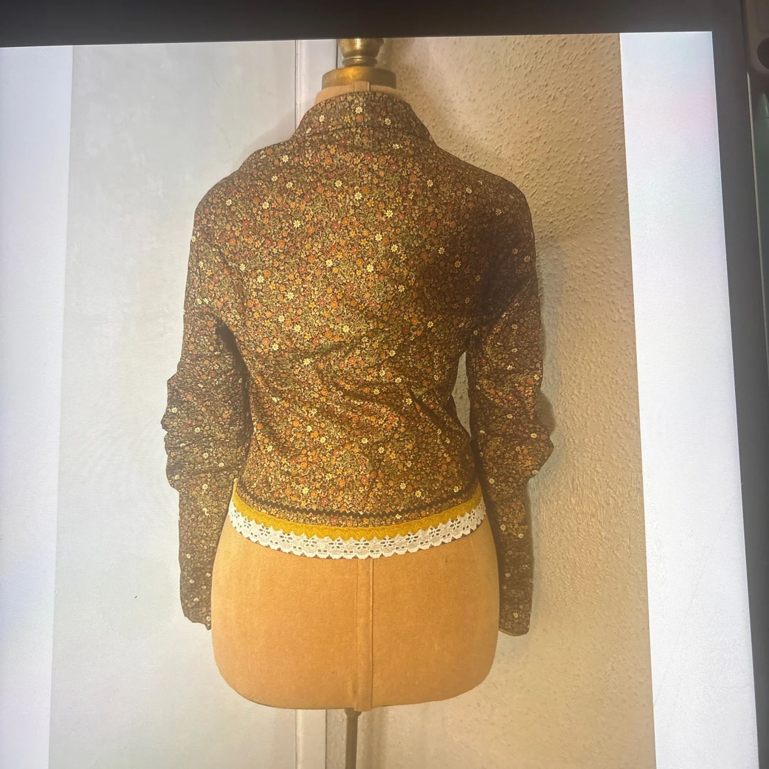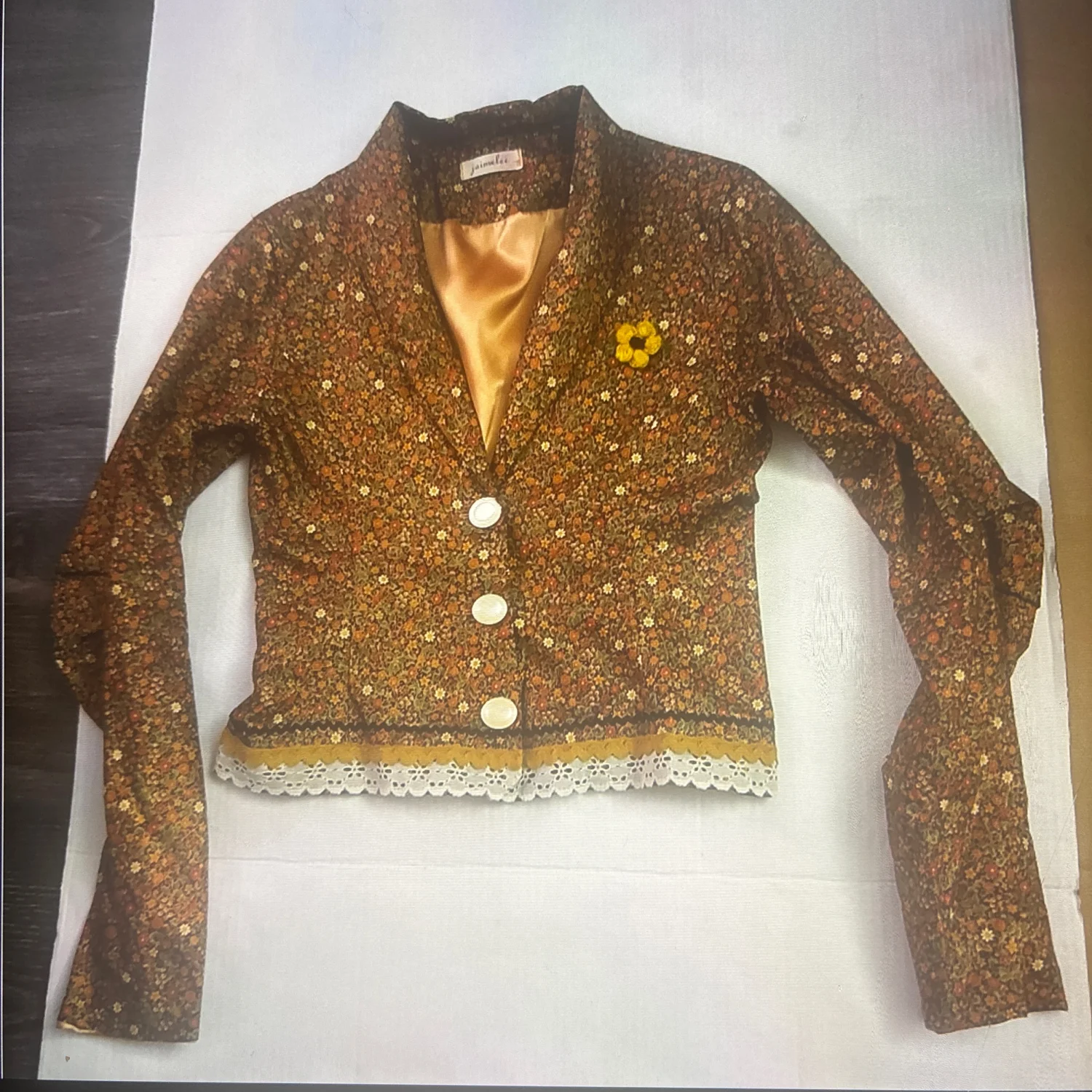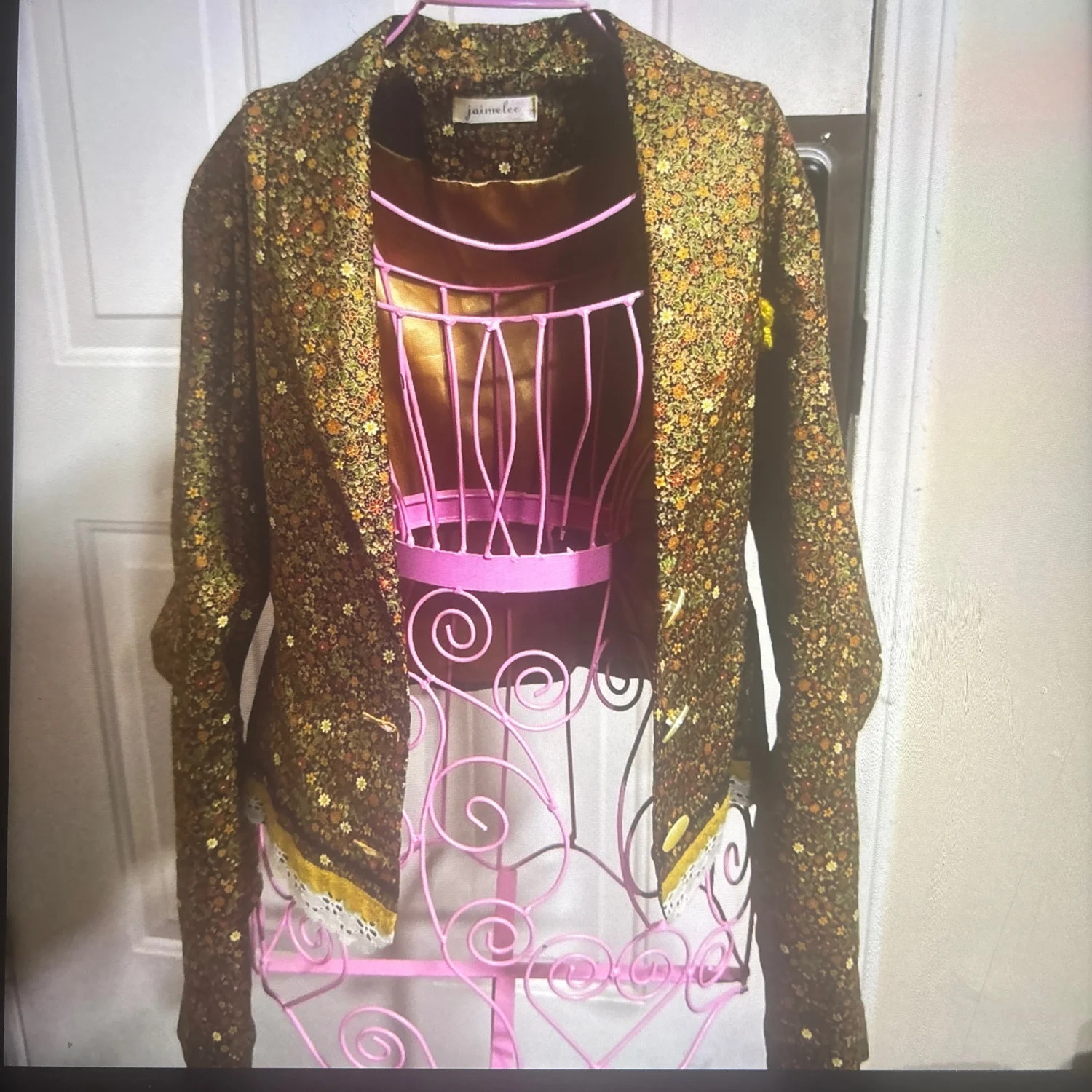Style: Ruched sleeves blazer with floral background and flower applique. Size: S Armpit: 15” Length: 20” Sleeves: 31” Color: Green/Gold Condition: Good