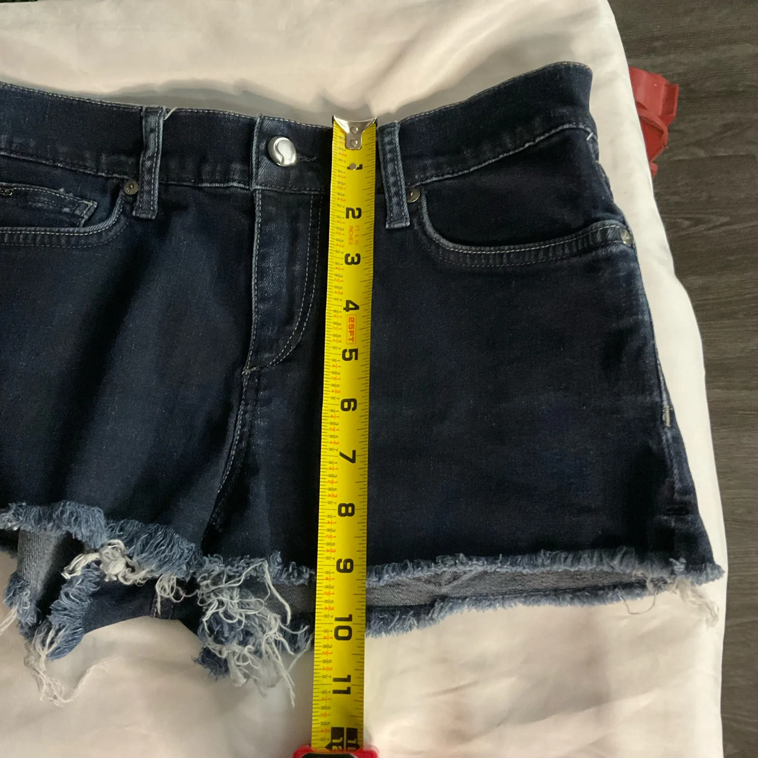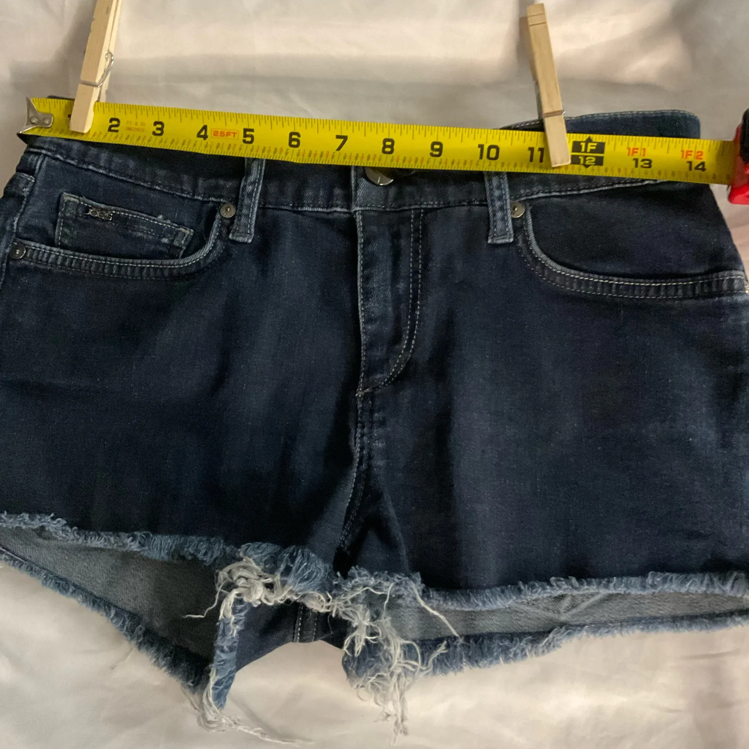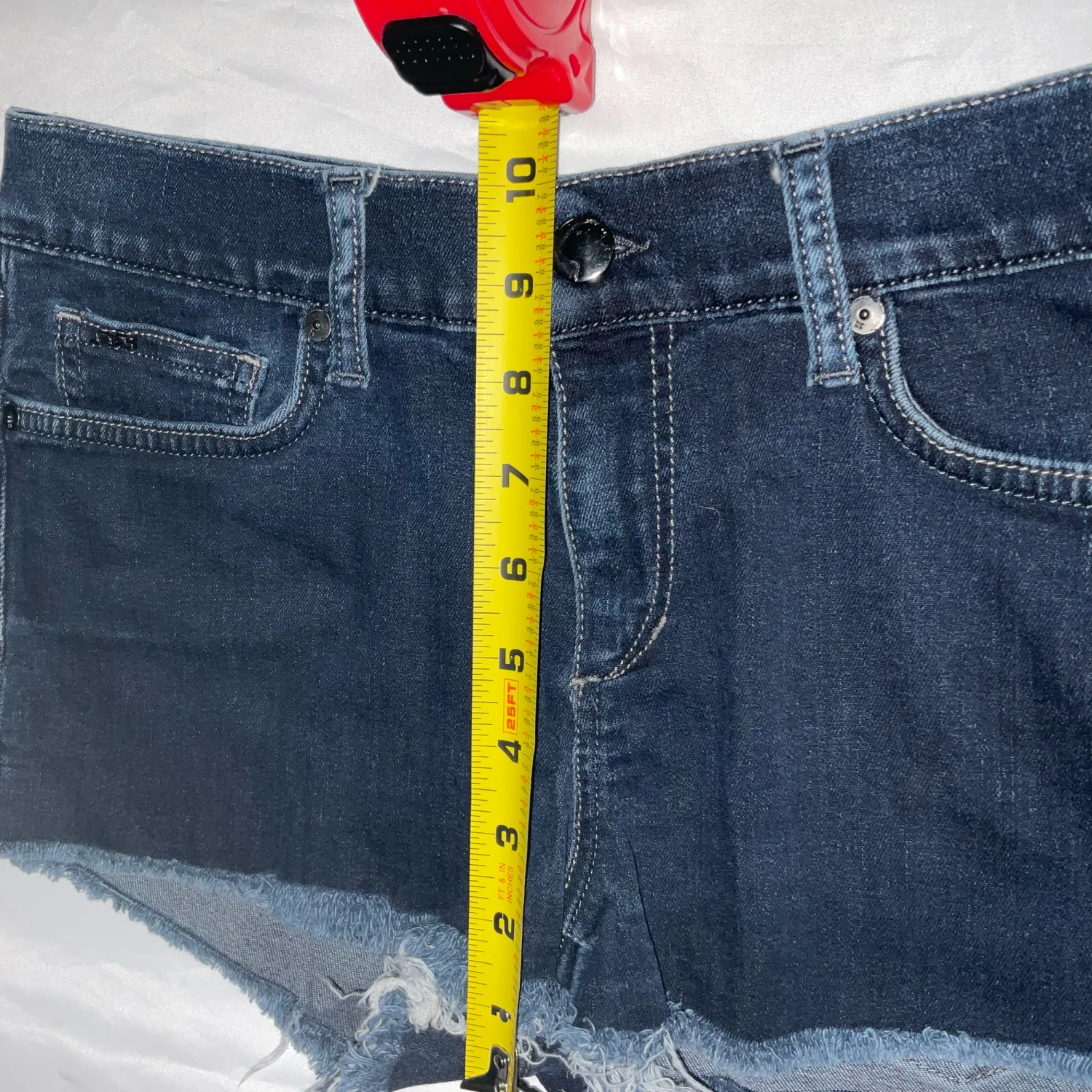 Style: Raw edge denim shorts with five pockets Color: Blue Size: 27 W: 14” Rise: 10” Length: 10” Condition: Good 98% Cotton 2% Elastane Machine wash