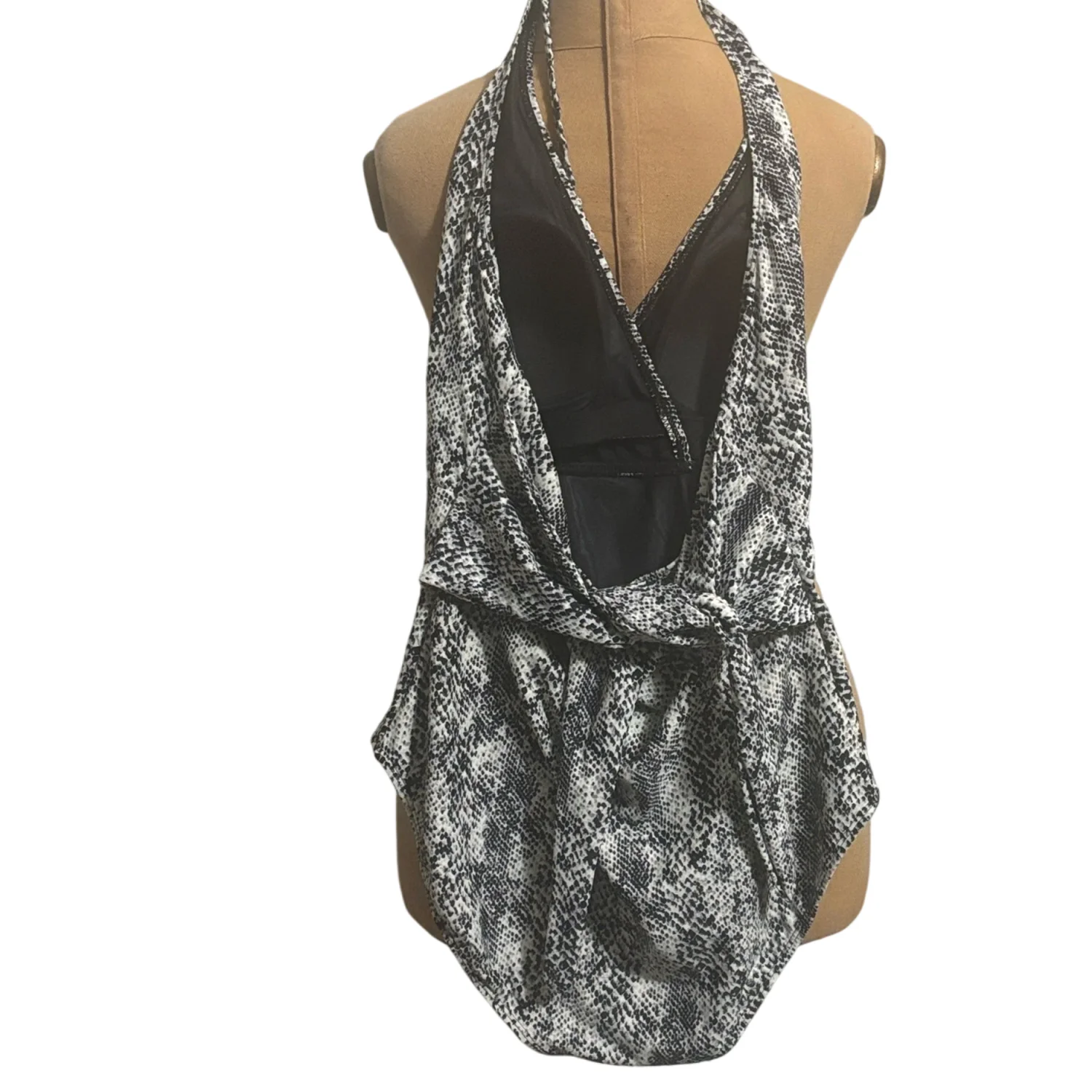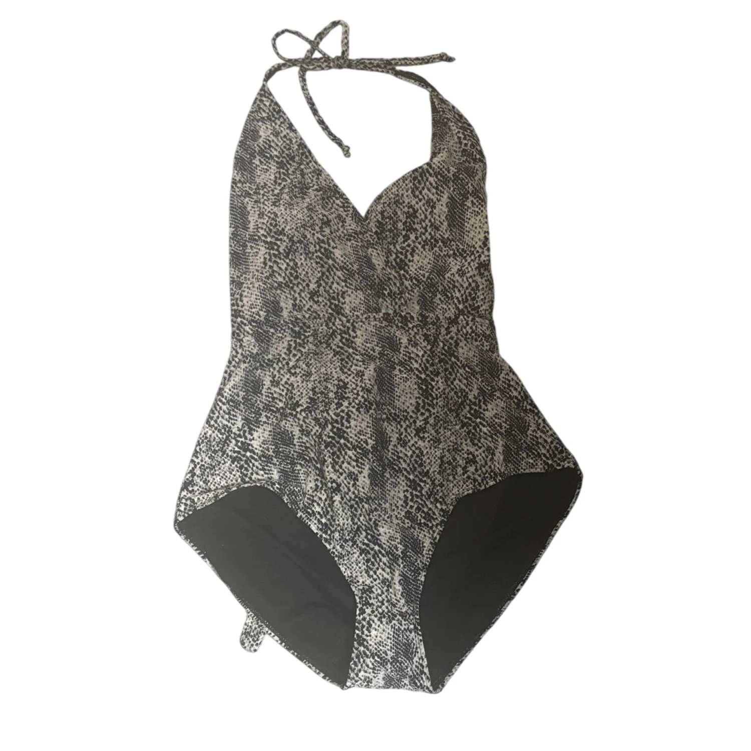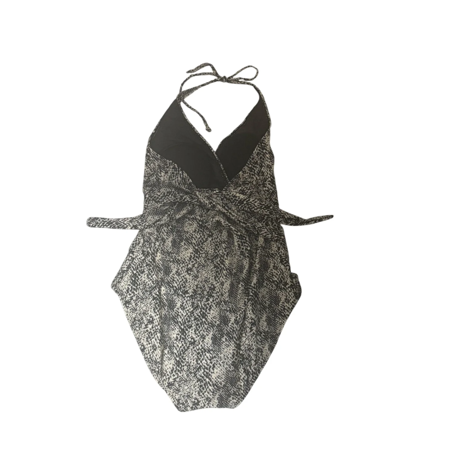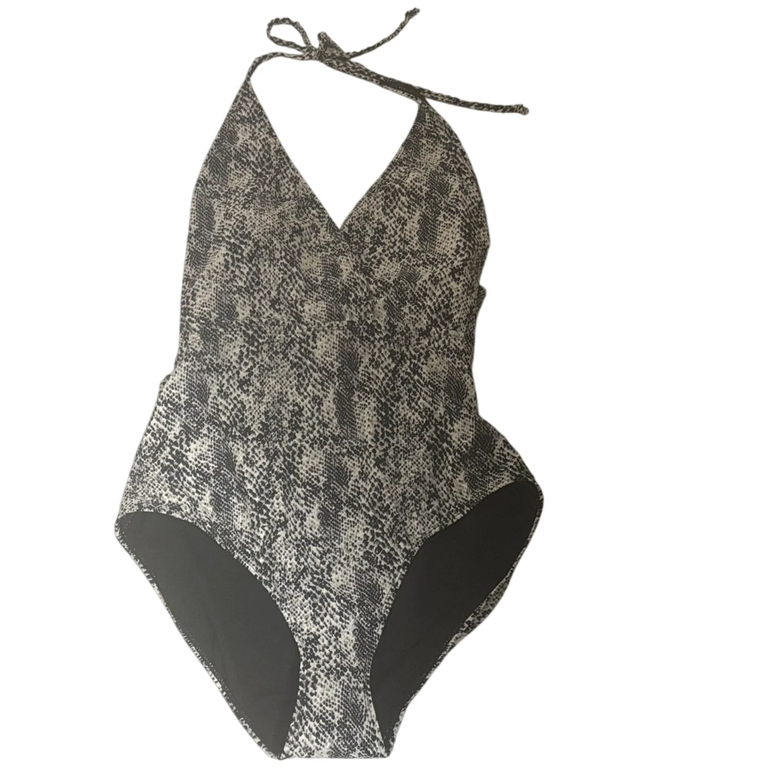 Style: Sleek one-piece swimsuit with a halter neck tie and tie across back. Color: Black and white snakeskin print. Solid black inner lining at the leg openings. Stylish and versatile piece. Size: L Armpit: 14" Length: 29" Condition: New without tag, hygiene strip intact 82% Nylon 18% Spandex Hand wash only